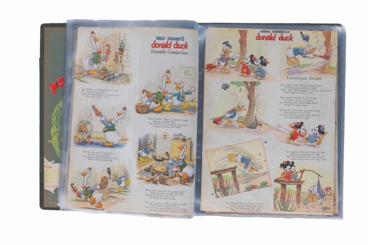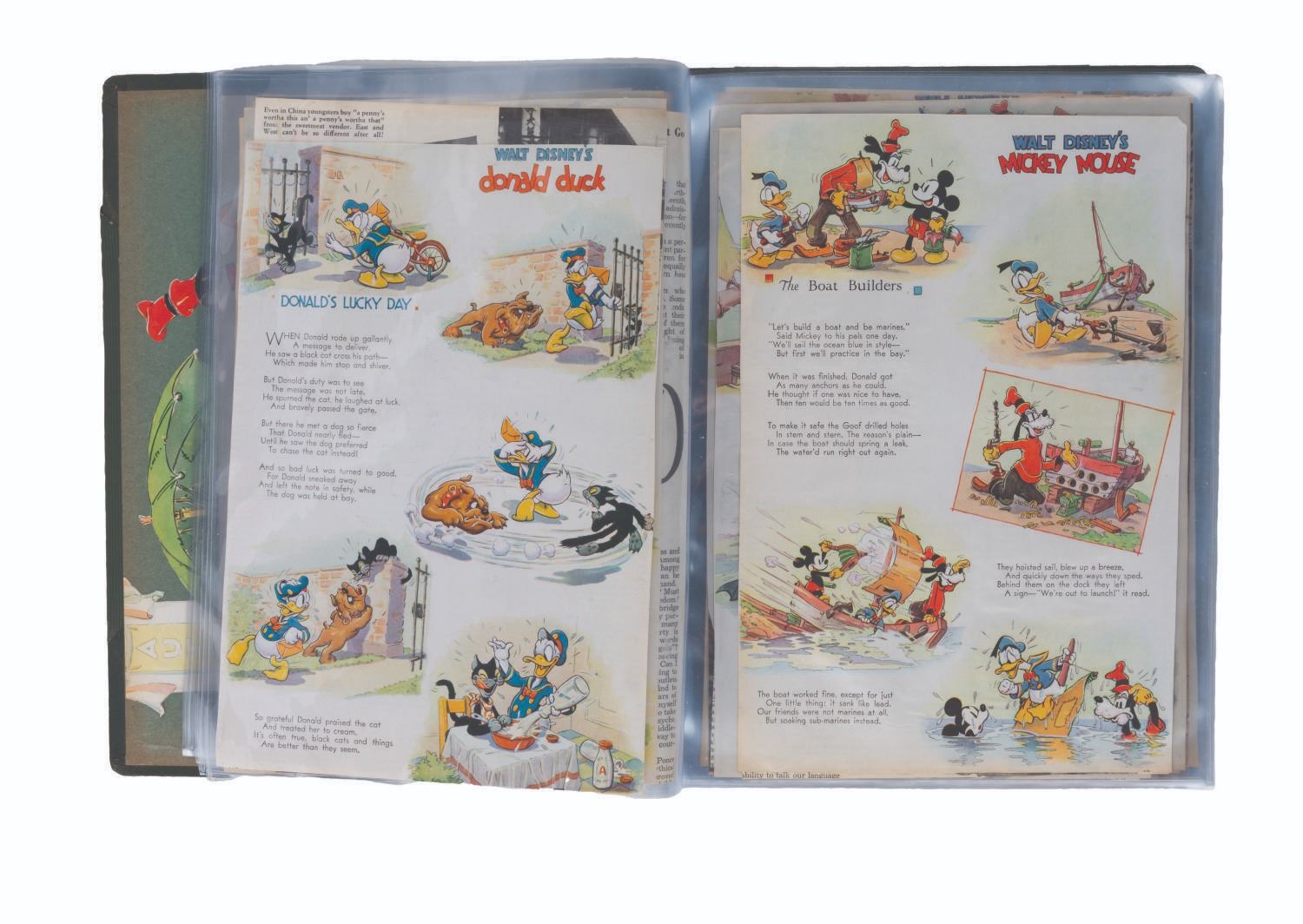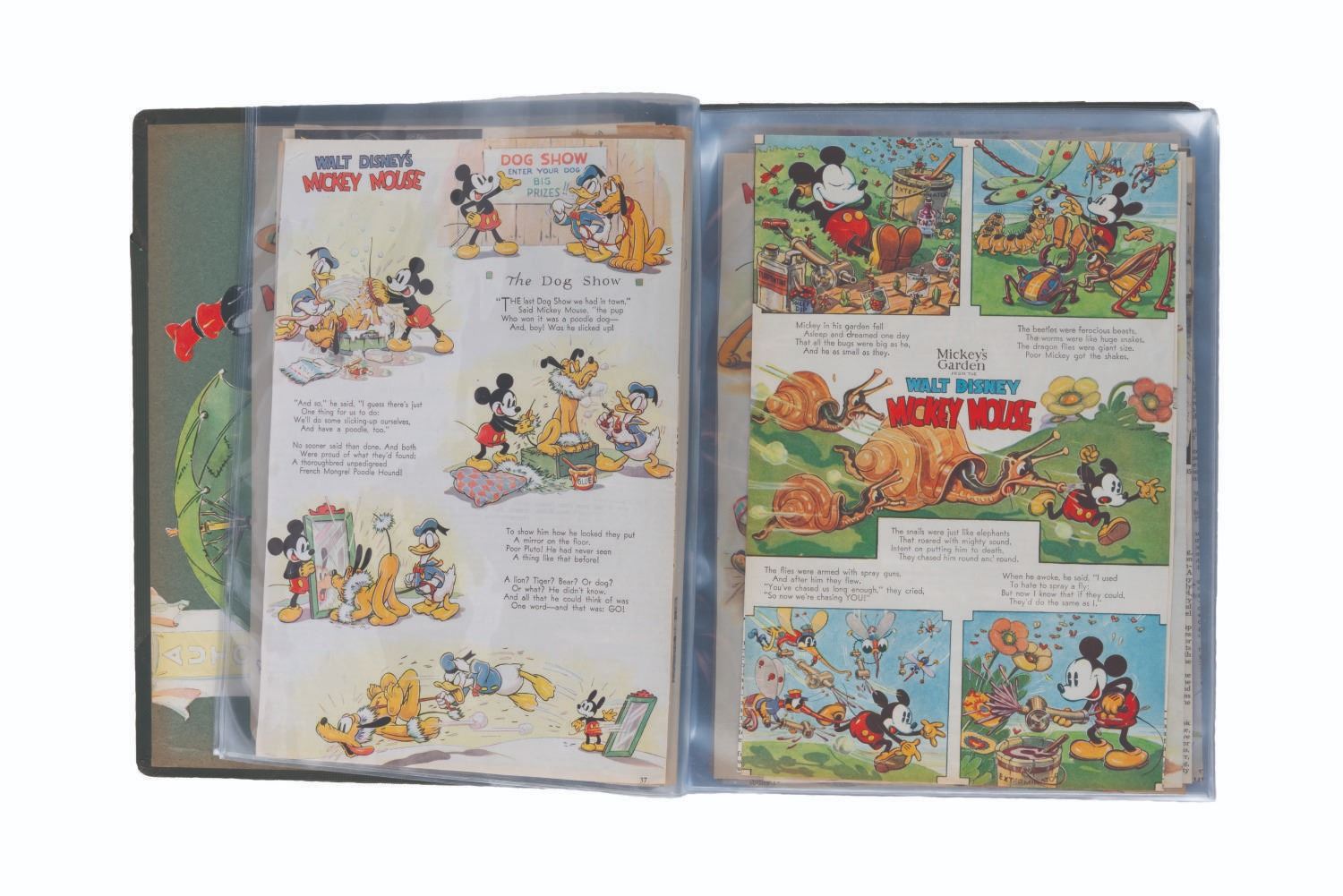 (Disney/Good Housekeeping, 1930s-40s) A collection of 50 Disney children’s pages clipped from Good Housekeeping magazine. In 1934, Good Housekeeping and the Walt Disney Studios joined to have the Studio supply for each issue a single page Children’s feature, including characters from Disney cartoons. Good Housekeeping felt it would increase sales, and Disney liked a permanent advance publicity piece for its latest cartoon shorts. From 1934 until 1944, Disney created and supplied artwork for a page in each issue of the magazine. The pages are considered some of the finest character artwork of the time, and were often clipped and saved in scrapbooks. This collection includes 50 pages, saved loose in protective pages. Each measuring approximately 7 " x 10.5 ", the pages are in good condition, with small creases and light discoloration from age, and irregular edges on the side cut from the magazine.