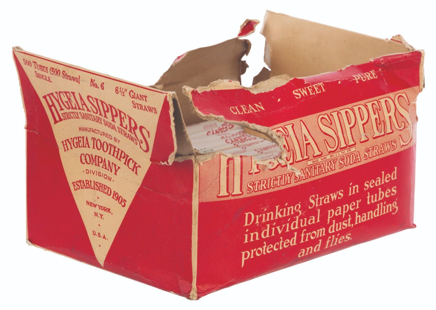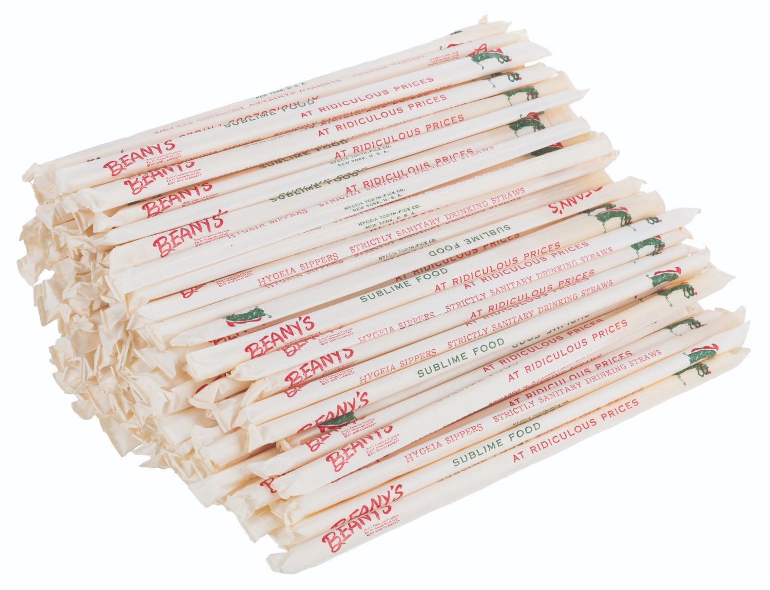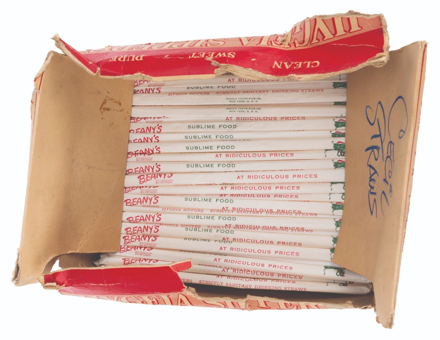 (Beany’s, 1950s) A large collection of 158 unopened straws from Beany’s Drive-In, a “Time for Beany”-themed restaurant in Newport Beach. The straw wrappers feature the restaurant’s logo, Cecil, and the tagline “Sublime food at ridiculous prices.” Measuring 9.25” each in a 9.5” x 7” x 6” tall box, the straws and their wrappers are in very good to fine condition, while the box is in fair condition with heavy tears, creases, wear, and material loss.
