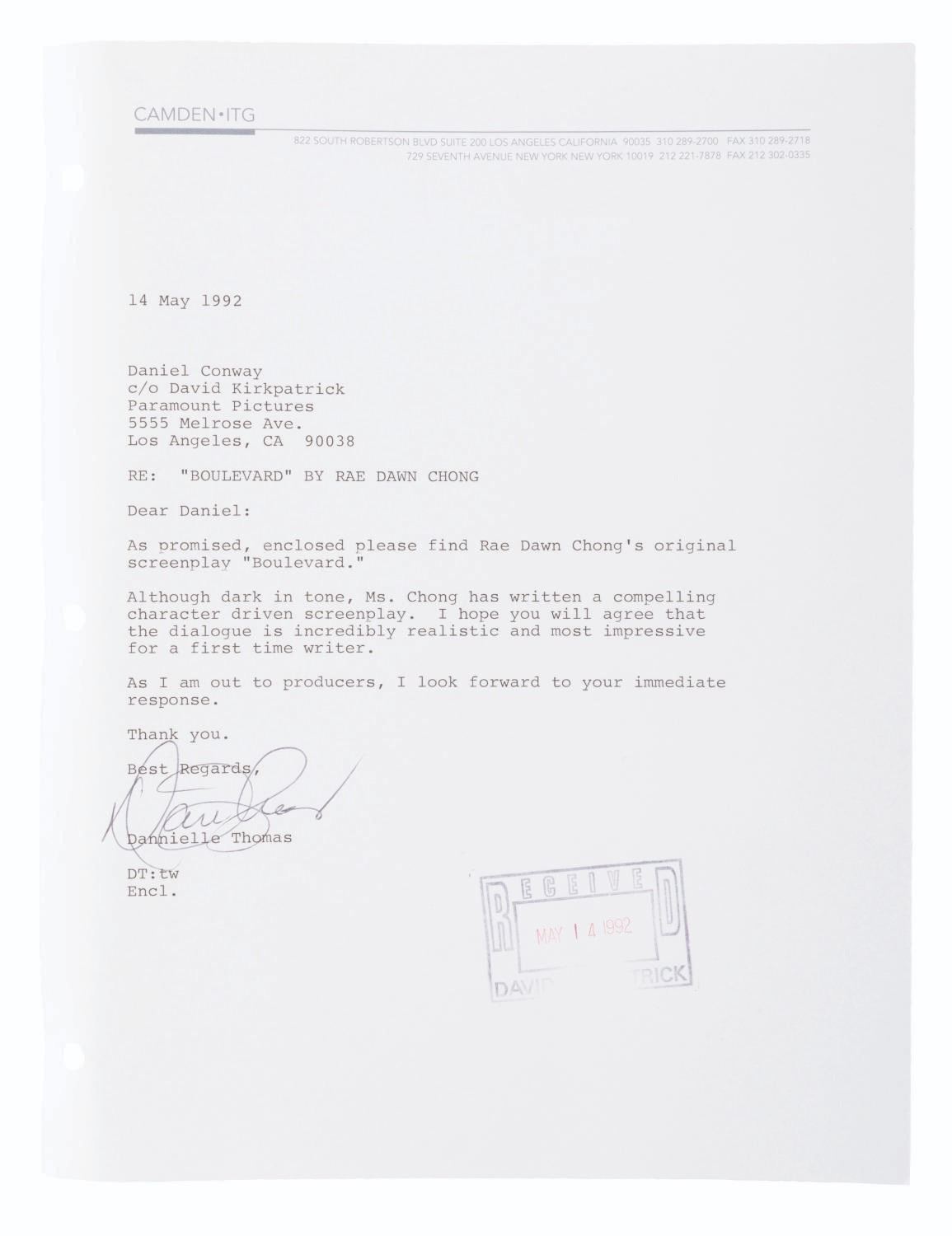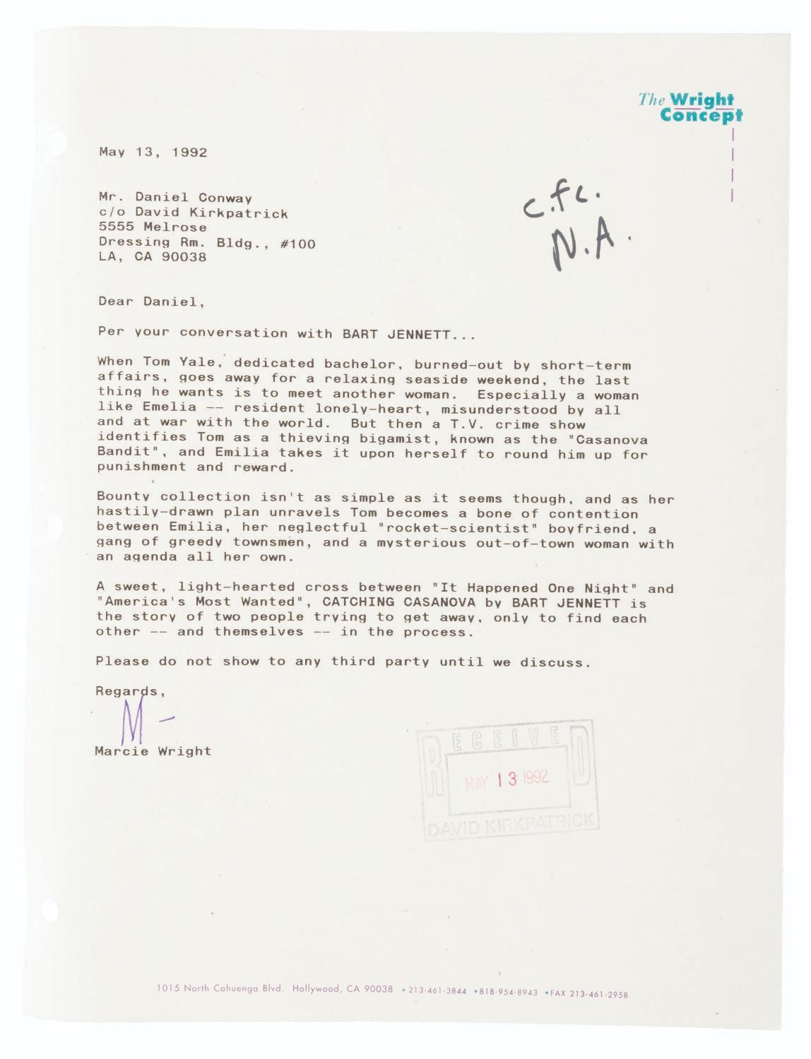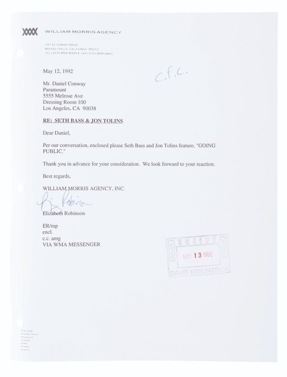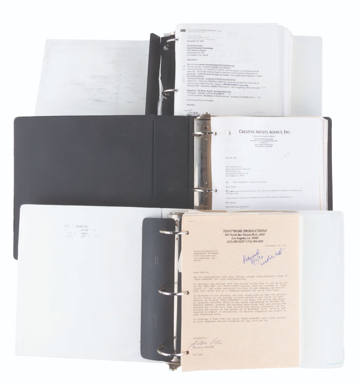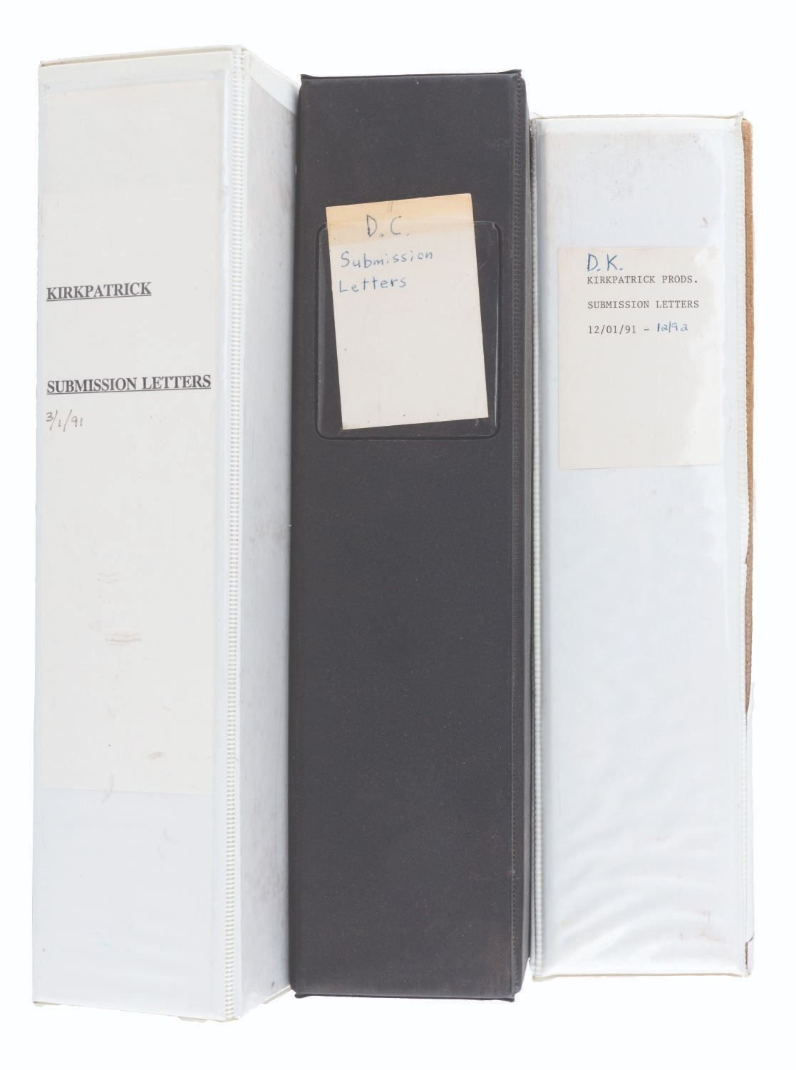(Kirkpatrick, 1991-92) Three binders containing many dozens of cover letters submitted to producer David Kirkpatrick for consideration in 1991 and 1992. Before the internet and email, Hollywood deals were made over the phone, in person, and entirely through physical copies of scripts changing hands between writers, agents, and producers. Cover letters served as both a handshake and an introduction to the attached work. Included within are signatures including Garry Marshall, Steve Guttenberg, and many more; and stationery samples from dozens of Hollywood agencies and production companies both still with us and long gone. With letters measuring up to 8.5" x 11", the collection is overall in very good condition with typical handling wear.