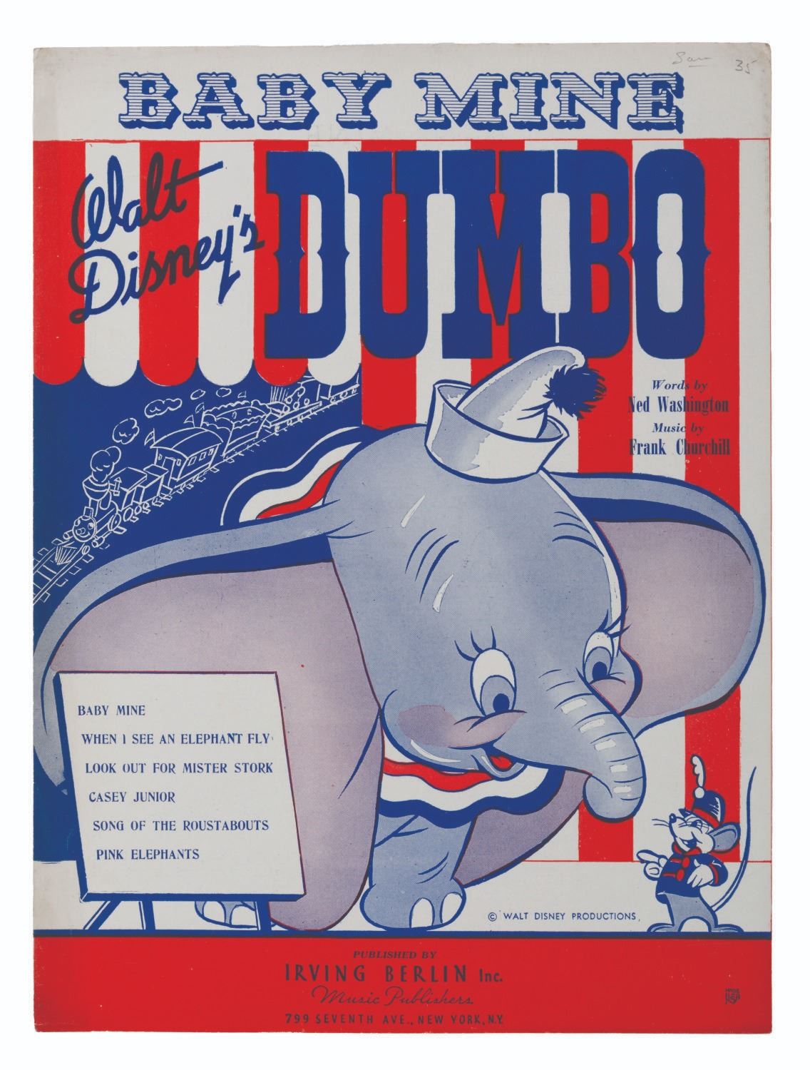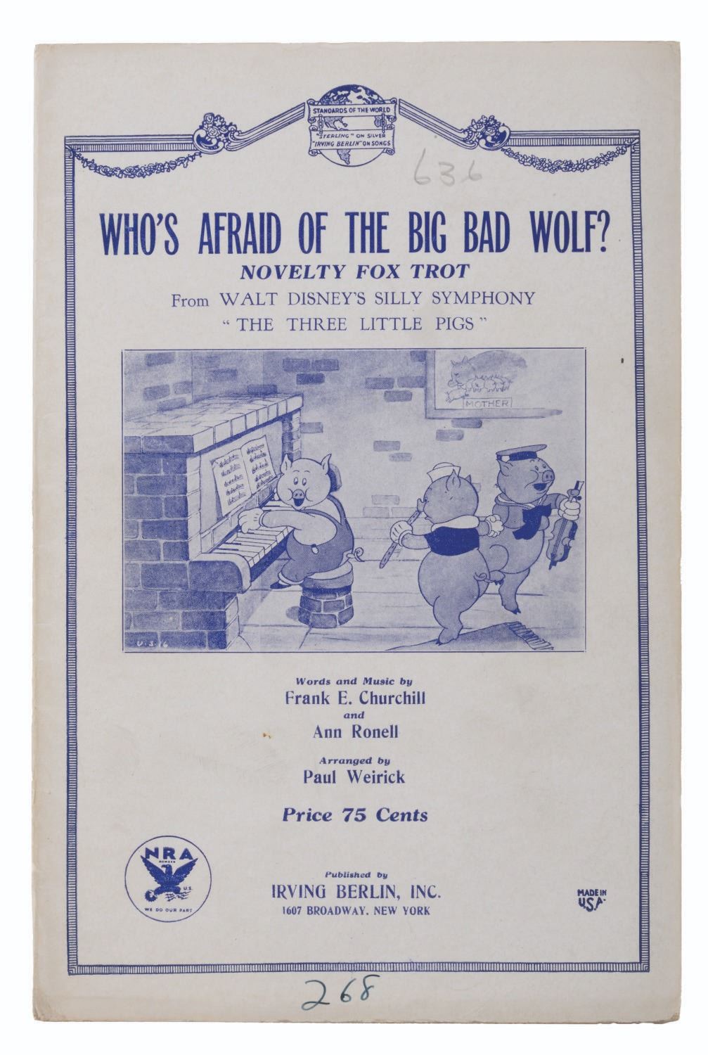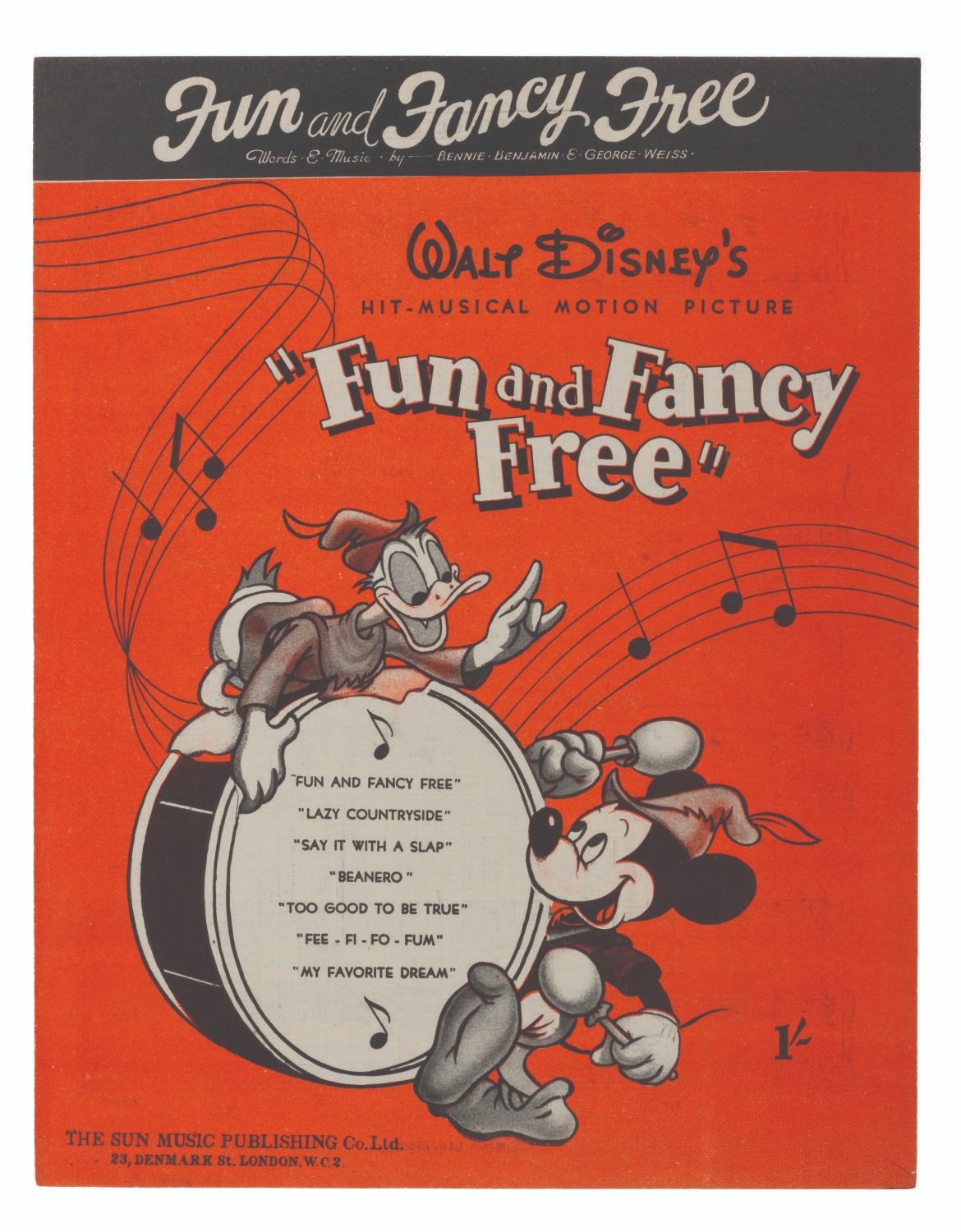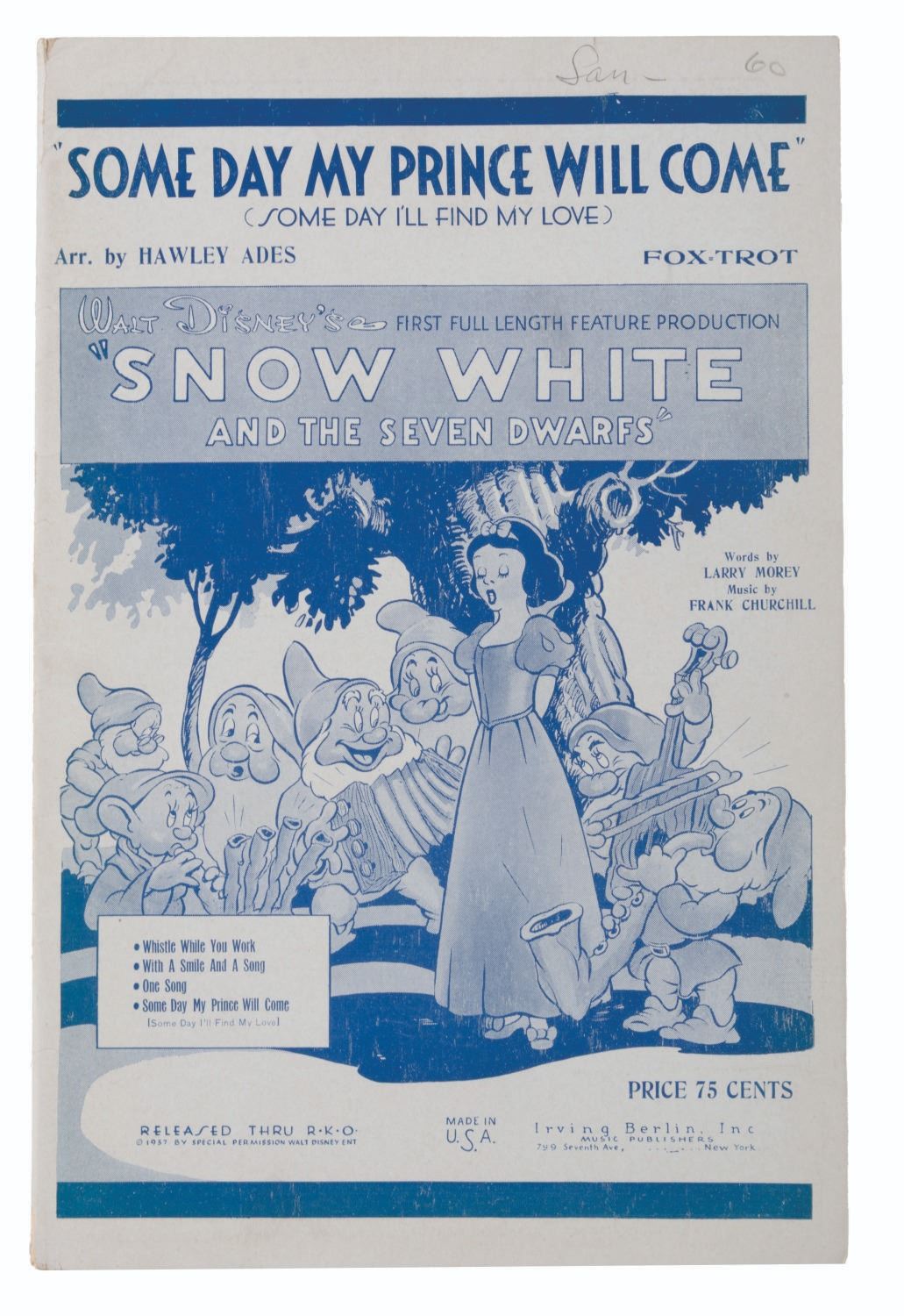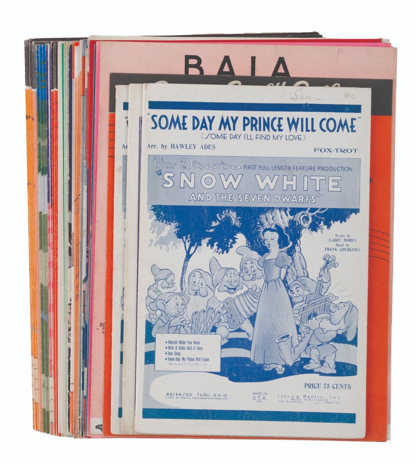 (Disney, 1940s-70s) A collection of 62 pieces of sheet music from Disney animated classics. Included are musical numbers from "Three Little Pigs," "Snow White and the Seven Dwarfs," "Fun and Fancy Free," "The Three Caballeros," "Lady and the Tramp," "Make Mine Music," "Dumbo," "Melody Time," "Pinocchio," "Bambi," "The Adventures of Ichabod and Mr. Toad," "Peter Pan," "The Story of Robin Hood," "Song of the South," "Fun and Fancy Free," "Cinderella," "Alice in Wonderland," and "So Dear to My Heart." Ranging in size from 7" x 10.5" to 9" x 12", the sheet music displays in good to very good condition with handling wear, pencil notations, creases, discoloration from age, edge tears up to 2.5" long, corner folds, scratches, water contact at the top of "When You Wish Upon a Star," and a stamp on "Who's Afraid of the Big Bad Wolf?"