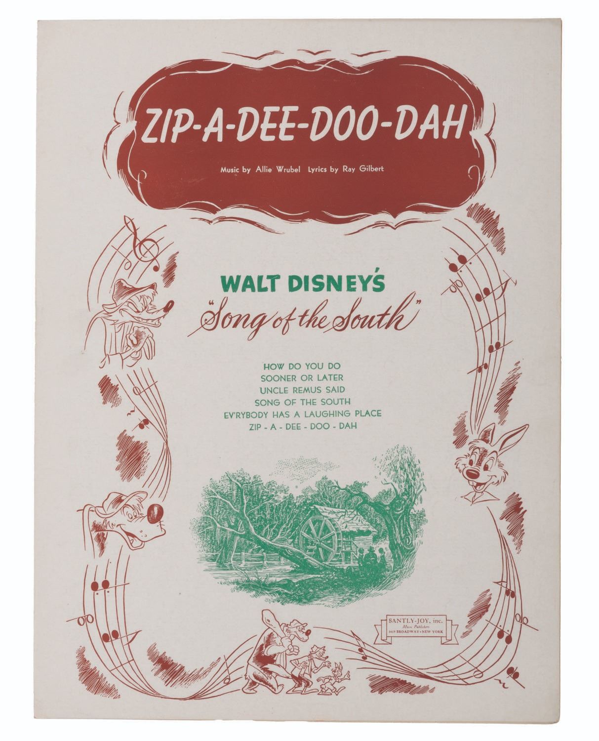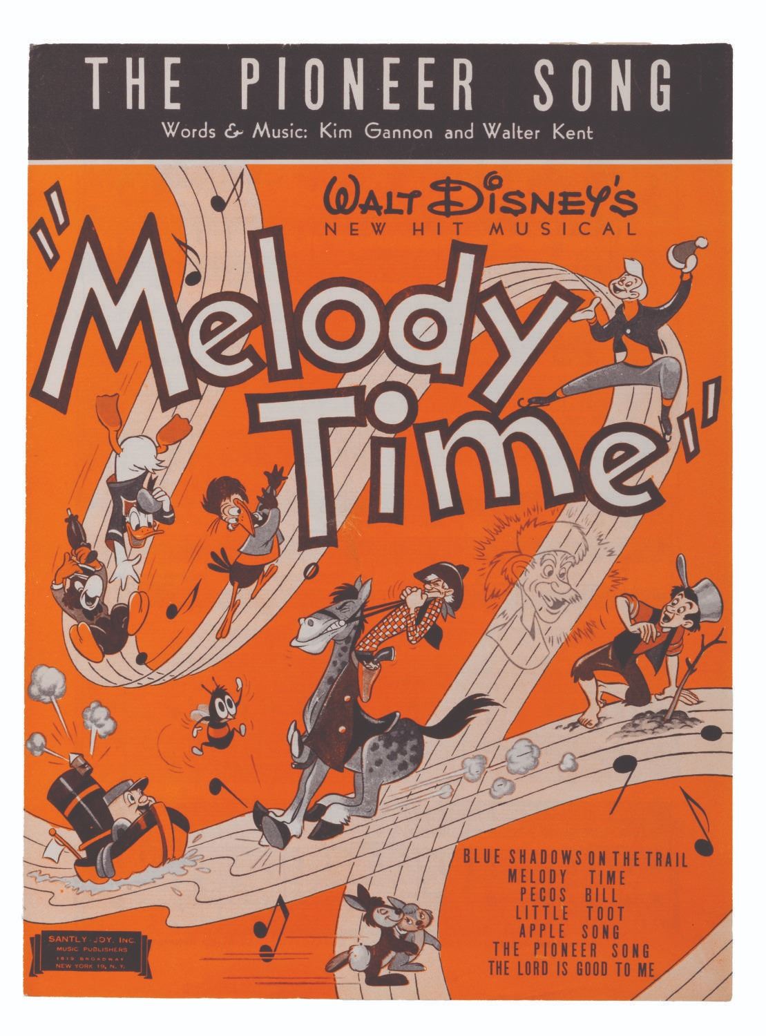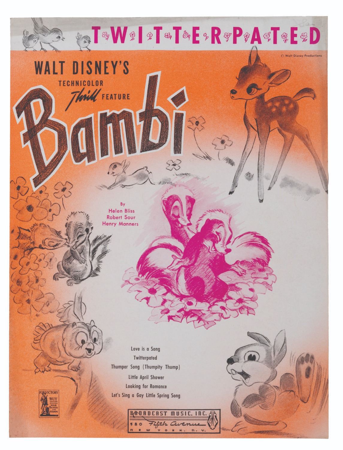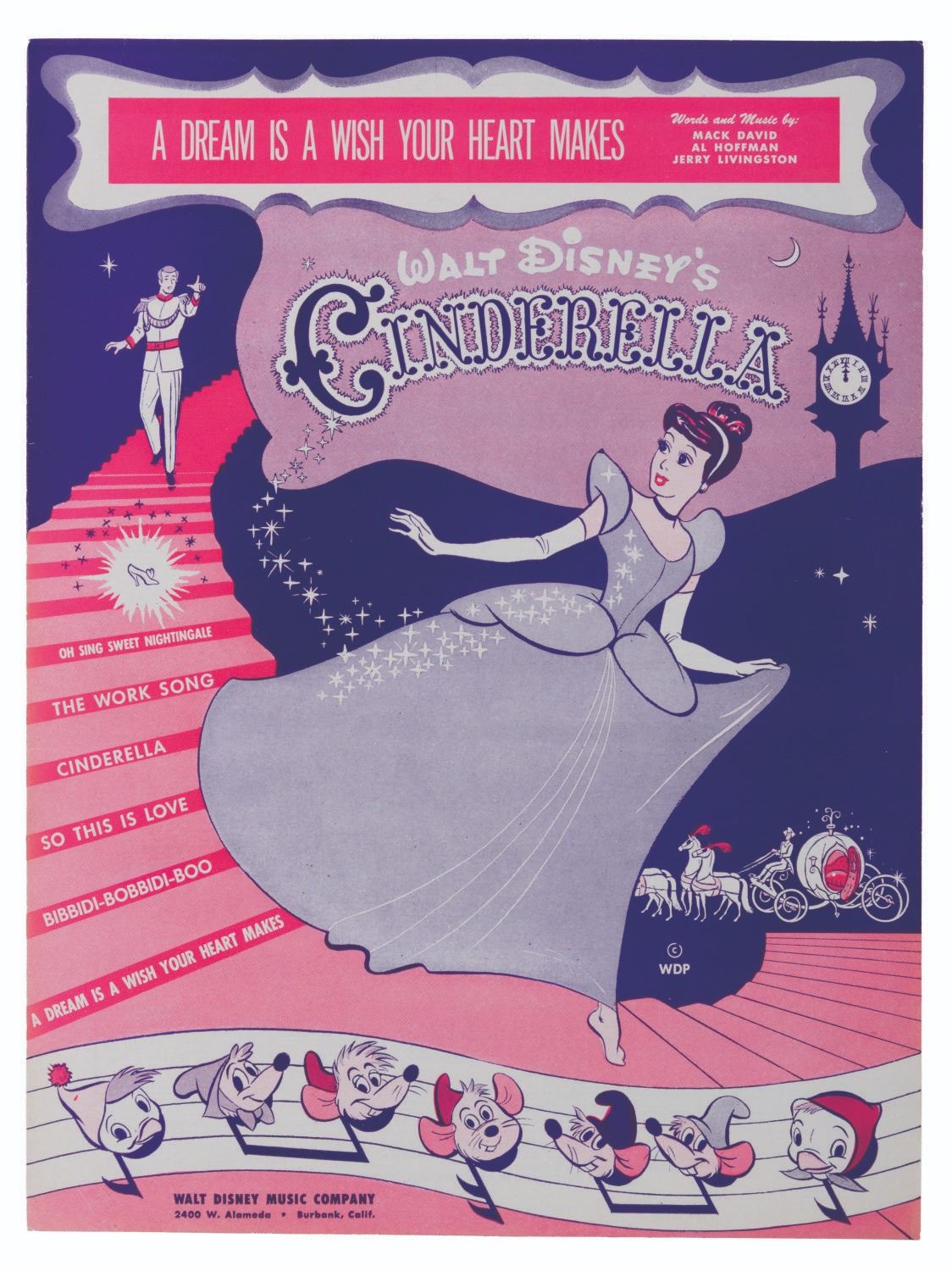 (Disney, 1940s-70s) A collection of 62 pieces of sheet music from Disney animated classics. Included are musical numbers from "Three Little Pigs," "Snow White and the Seven Dwarfs," "Fun and Fancy Free," "The Three Caballeros," "Lady and the Tramp," "Make Mine Music," "Dumbo," "Melody Time," "Pinocchio," "Bambi," "The Adventures of Ichabod and Mr. Toad," "Peter Pan," "The Story of Robin Hood," "Song of the South," "Fun and Fancy Free," "Cinderella," "Alice in Wonderland," and "So Dear to My Heart." Ranging in size from 7" x 10.5" to 9" x 12", the sheet music displays in good to very good condition with handling wear, pencil notations, creases, discoloration from age, edge tears up to 2.5" long, corner folds, scratches, water contact at the top of "When You Wish Upon a Star," and a stamp on "Who's Afraid of the Big Bad Wolf?"