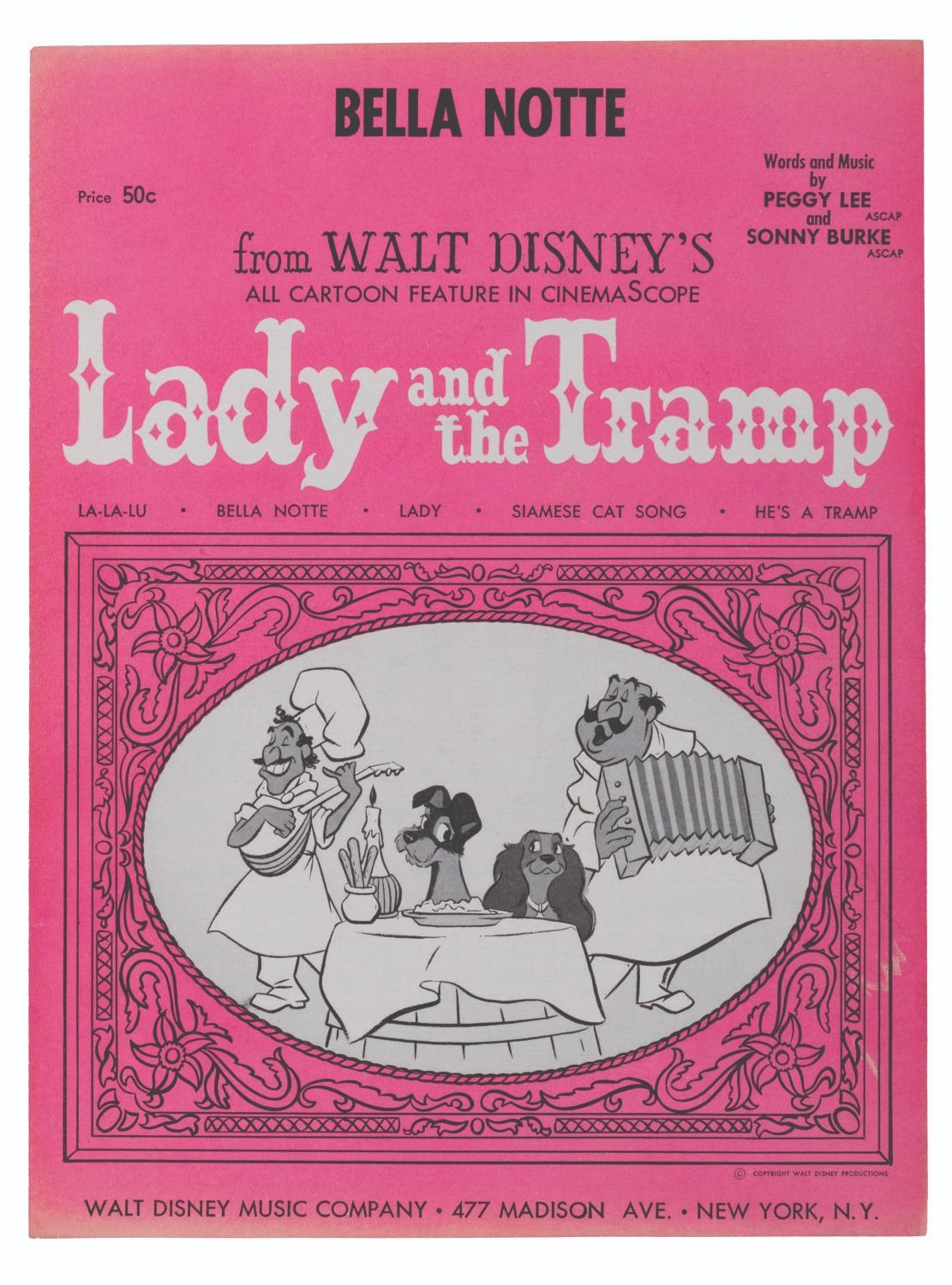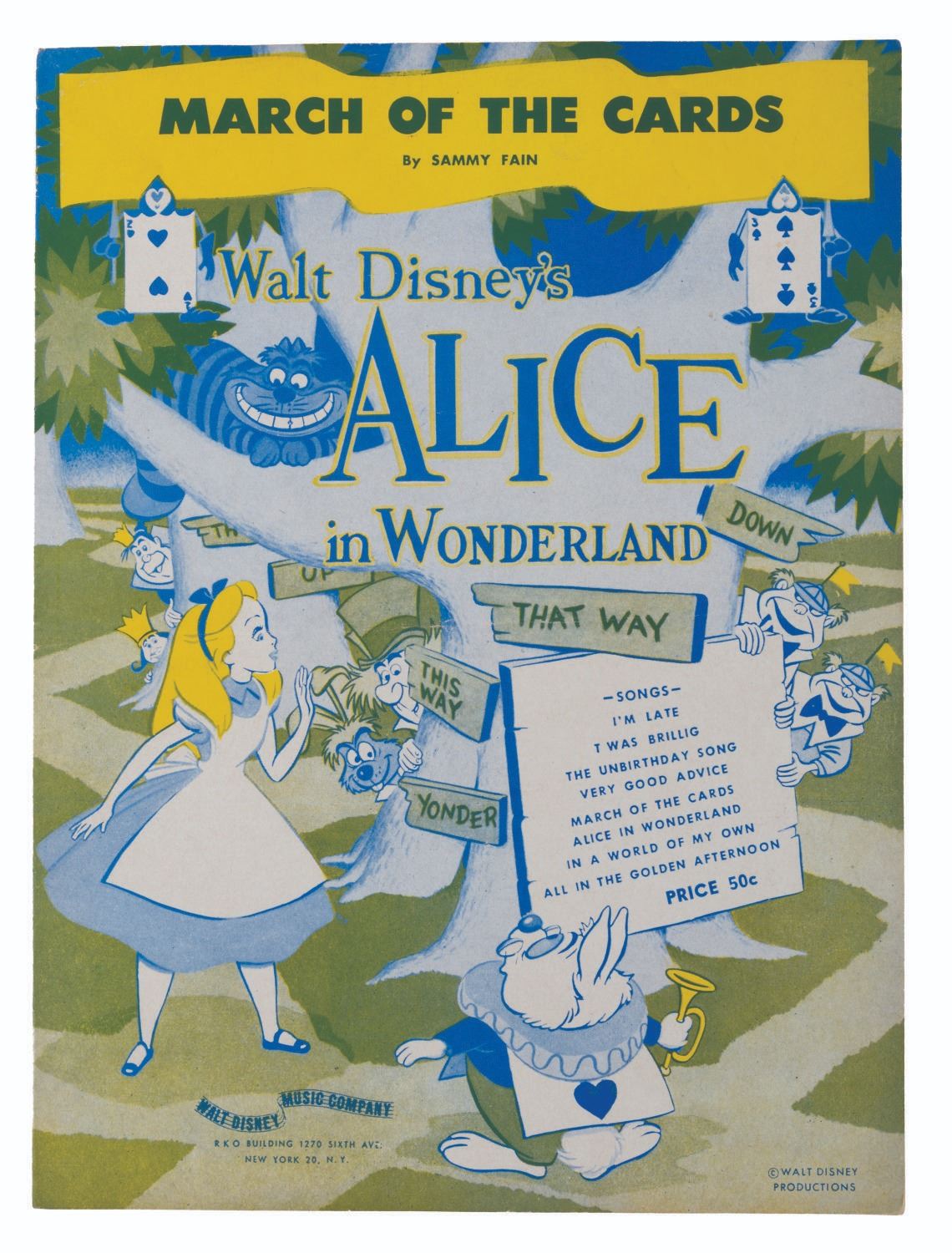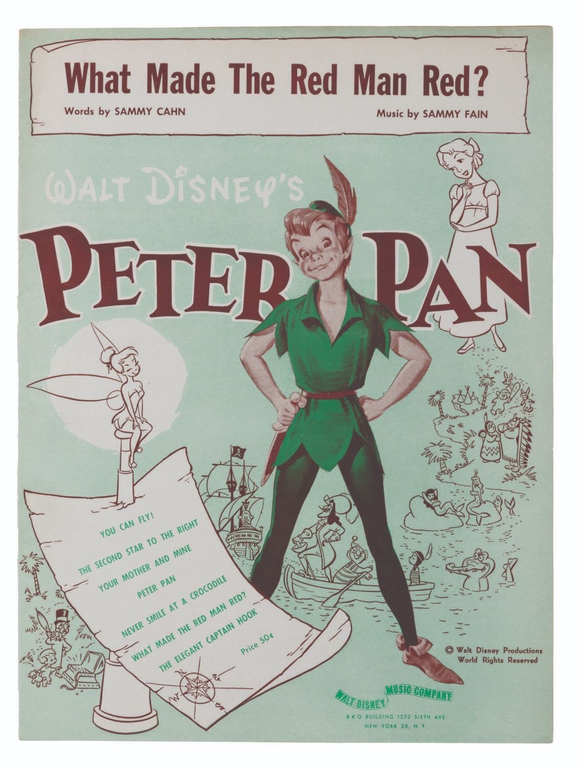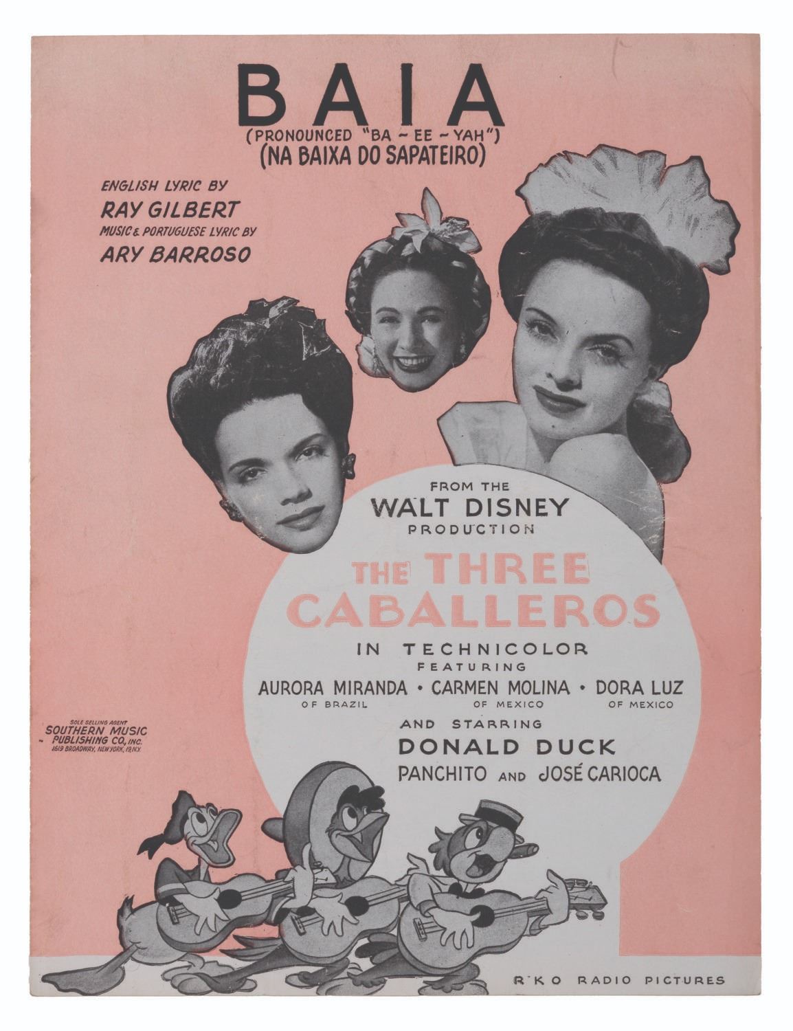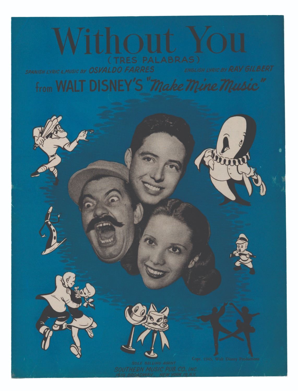 (Disney, 1940s-70s) A collection of 62 pieces of sheet music from Disney animated classics. Included are musical numbers from "Three Little Pigs," "Snow White and the Seven Dwarfs," "Fun and Fancy Free," "The Three Caballeros," "Lady and the Tramp," "Make Mine Music," "Dumbo," "Melody Time," "Pinocchio," "Bambi," "The Adventures of Ichabod and Mr. Toad," "Peter Pan," "The Story of Robin Hood," "Song of the South," "Fun and Fancy Free," "Cinderella," "Alice in Wonderland," and "So Dear to My Heart." Ranging in size from 7" x 10.5" to 9" x 12", the sheet music displays in good to very good condition with handling wear, pencil notations, creases, discoloration from age, edge tears up to 2.5" long, corner folds, scratches, water contact at the top of "When You Wish Upon a Star," and a stamp on "Who's Afraid of the Big Bad Wolf?"