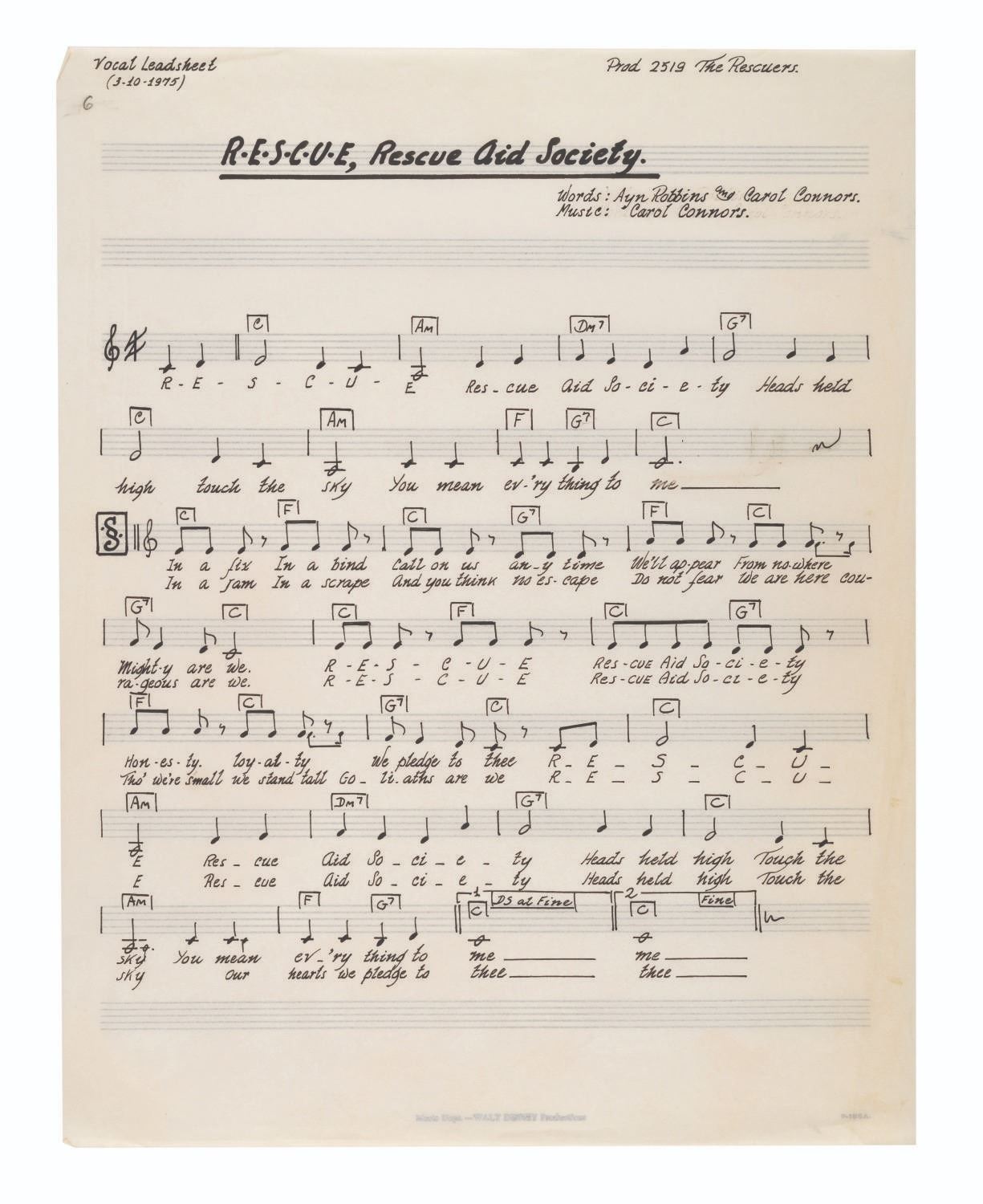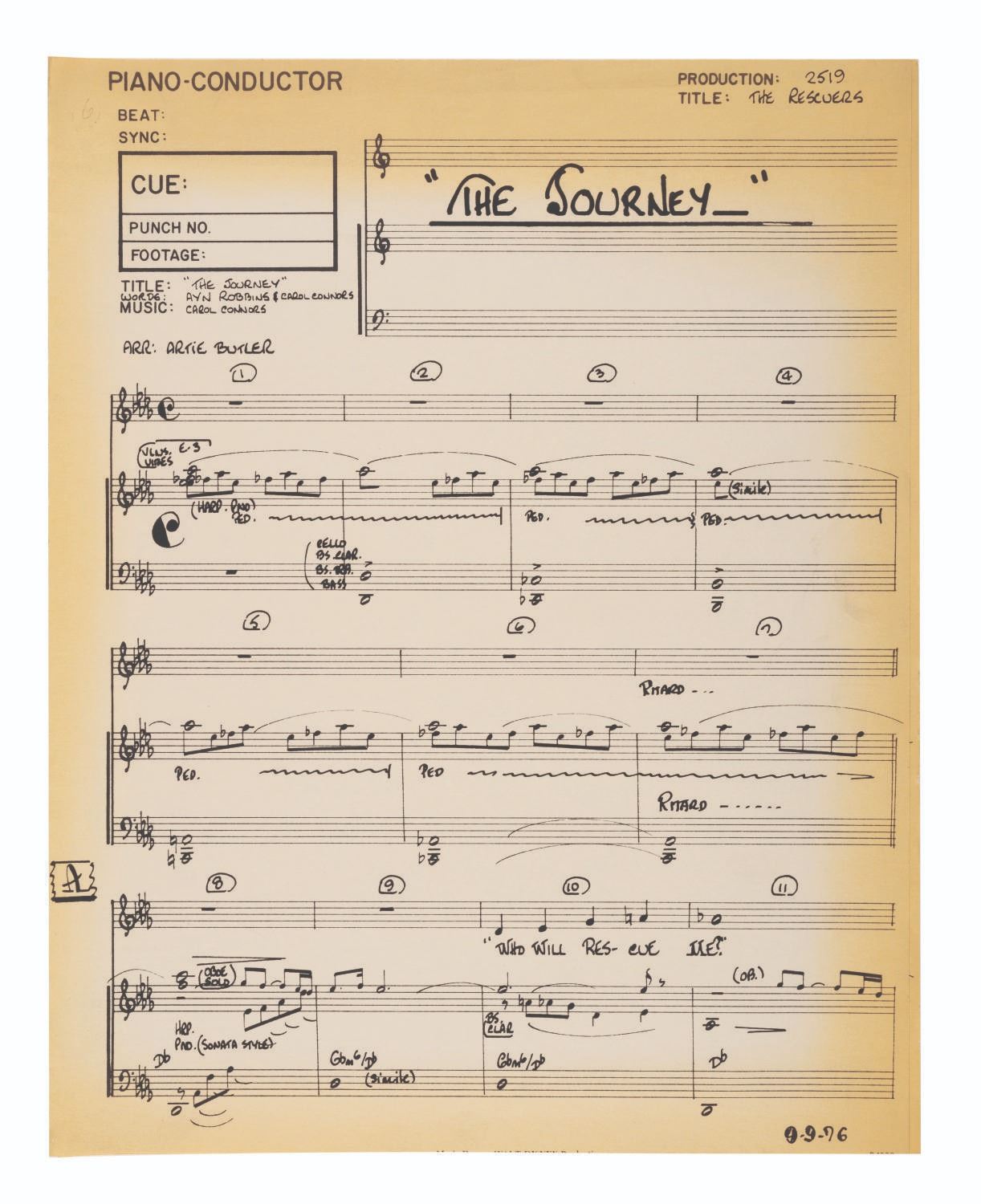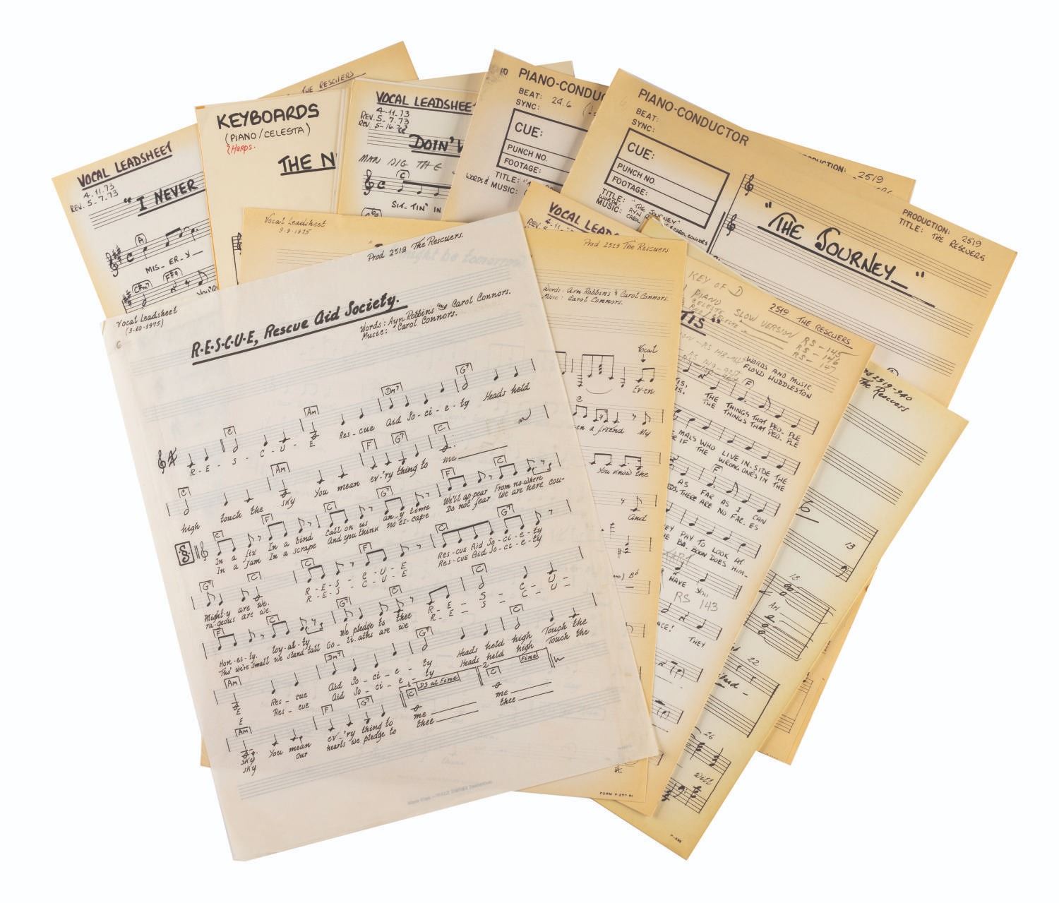 (Disney, 1977) An extensive collection of Disney Studio music scores from the animated feature The Rescuers. The (13) oversized 12"x15" files hold hundreds of pages of original score sheets for the songs from the film. Included are many deleted songs: Never had It So Good, Peoplitis, The Need to Be Loved, Just Might Be Tomorrow, and Doin' What I Really Do Best. Each folder typically contains a handwritten copy of the music and lyrics on vellum, and several printed copies, many with pencil annotations from production use indicating a change to instrument or lyric that may have existed for a single take. The file for Tomorrow is Another Day, the song played as Bernard and Bianca fly south to the bayou, includes extensive copies of score for the different instruments used in the orchestration. Also included is a rarely seen orchestra call sheet for that song's recording session, listing every musician who performed. All in all, hundreds of pages are included, giving a unique look into the Rescuers and Disney Studio recordings overall. The scores measuring 9.5"x13" each are in very good production used condition, inside the 12.5"x15" Studio manila file folders.