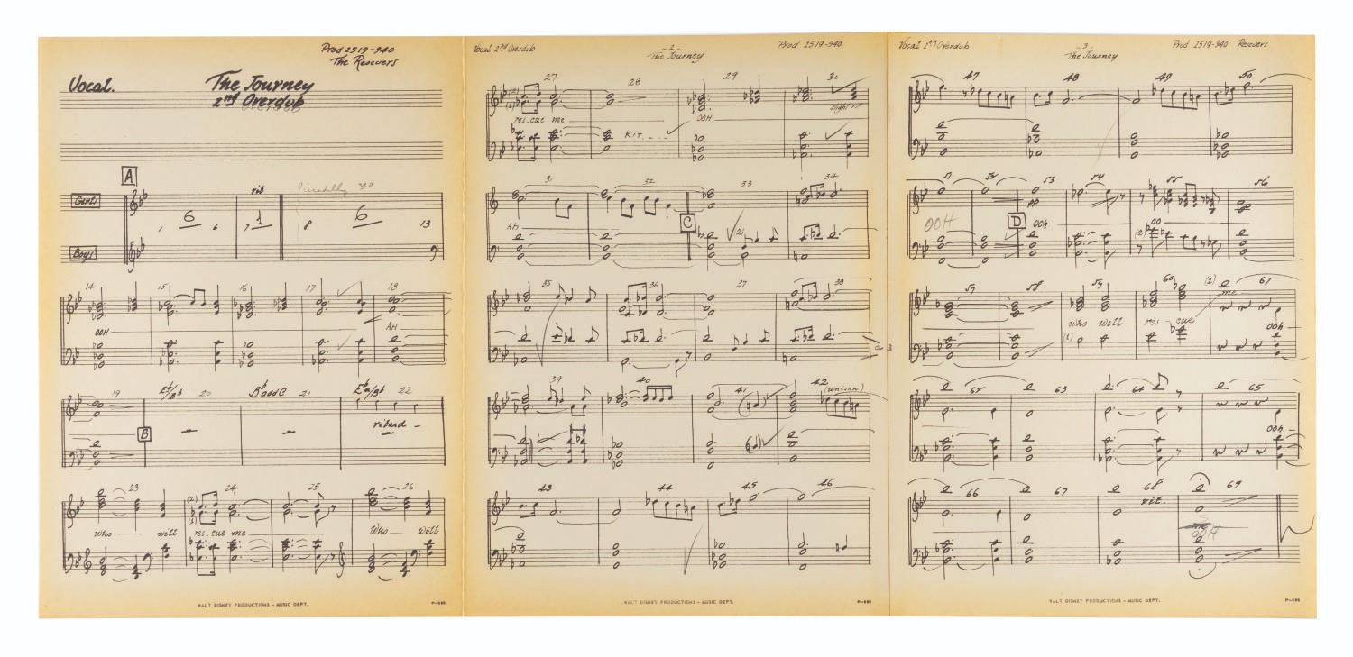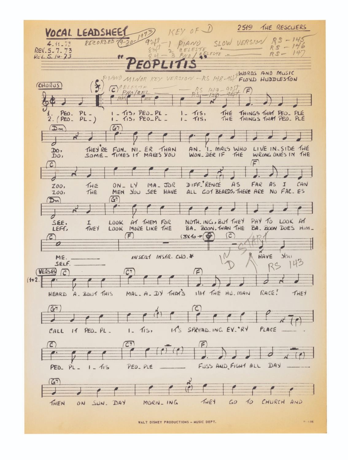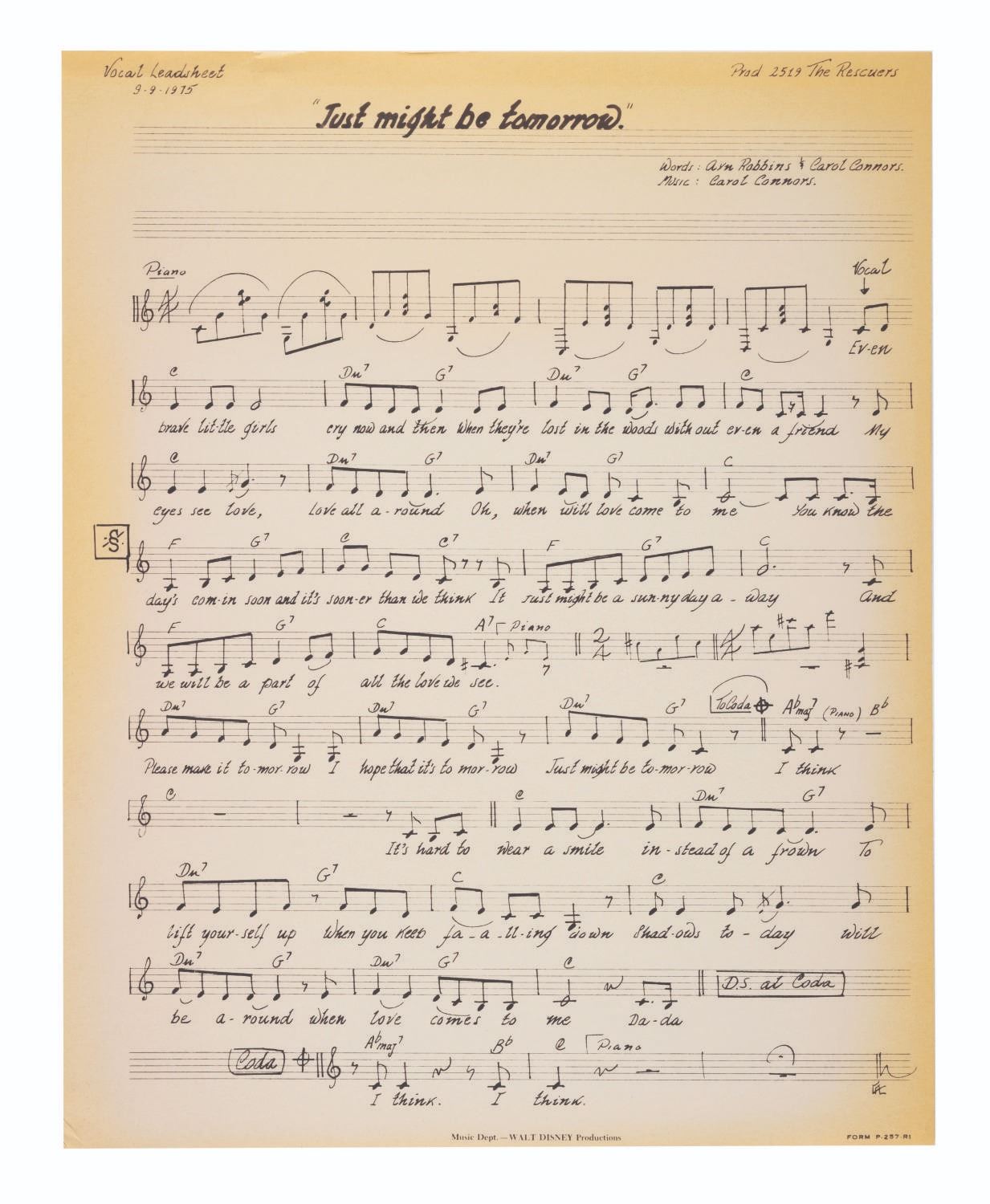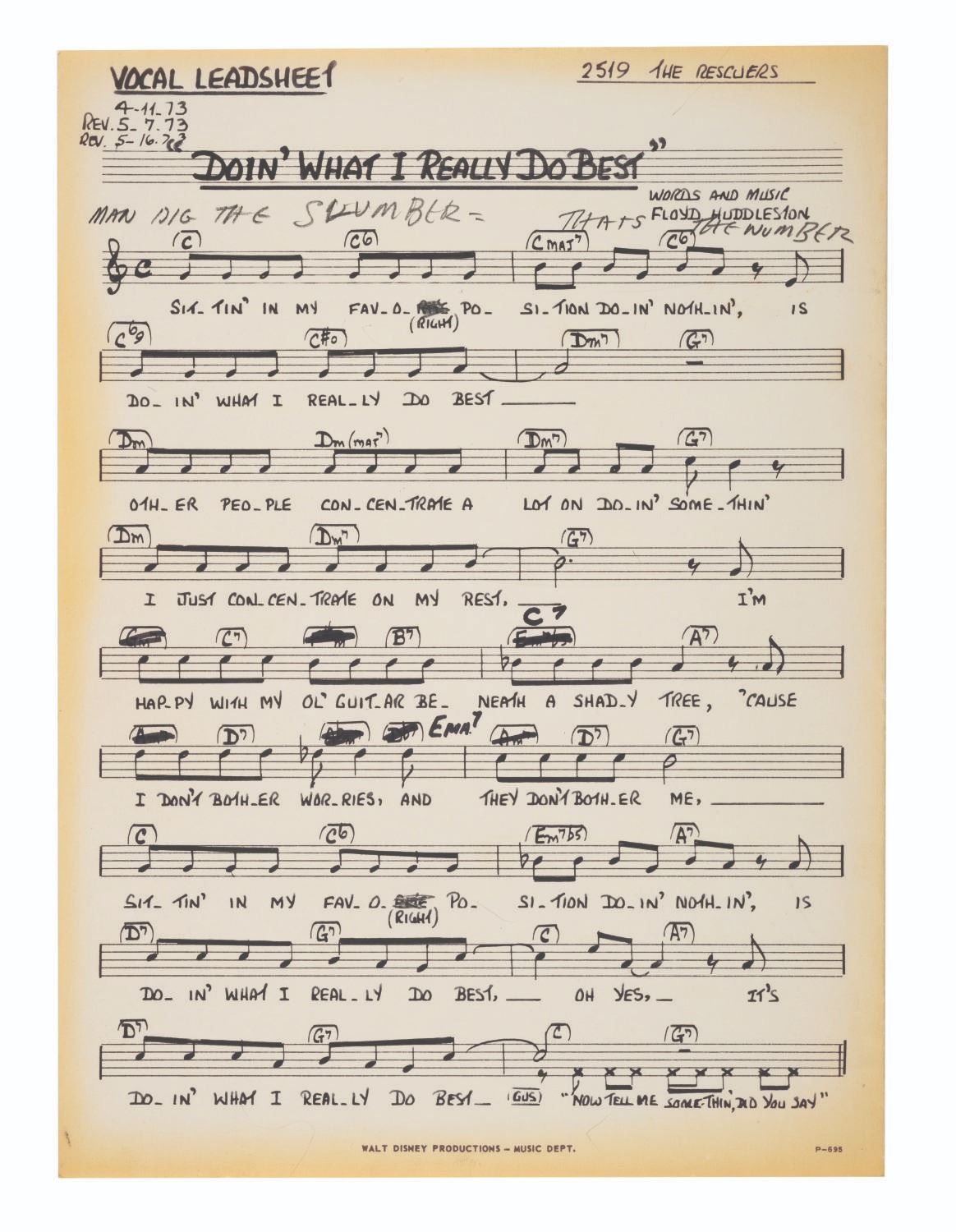 (Disney, 1977) An extensive collection of Disney Studio music scores from the animated feature The Rescuers. The (13) oversized 12"x15" files hold hundreds of pages of original score sheets for the songs from the film. Included are many deleted songs: Never had It So Good, Peoplitis, The Need to Be Loved, Just Might Be Tomorrow, and Doin' What I Really Do Best. Each folder typically contains a handwritten copy of the music and lyrics on vellum, and several printed copies, many with pencil annotations from production use indicating a change to instrument or lyric that may have existed for a single take. The file for Tomorrow is Another Day, the song played as Bernard and Bianca fly south to the bayou, includes extensive copies of score for the different instruments used in the orchestration. Also included is a rarely seen orchestra call sheet for that song's recording session, listing every musician who performed. All in all, hundreds of pages are included, giving a unique look into the Rescuers and Disney Studio recordings overall. The scores measuring 9.5"x13" each are in very good production used condition, inside the 12.5"x15" Studio manila file folders.