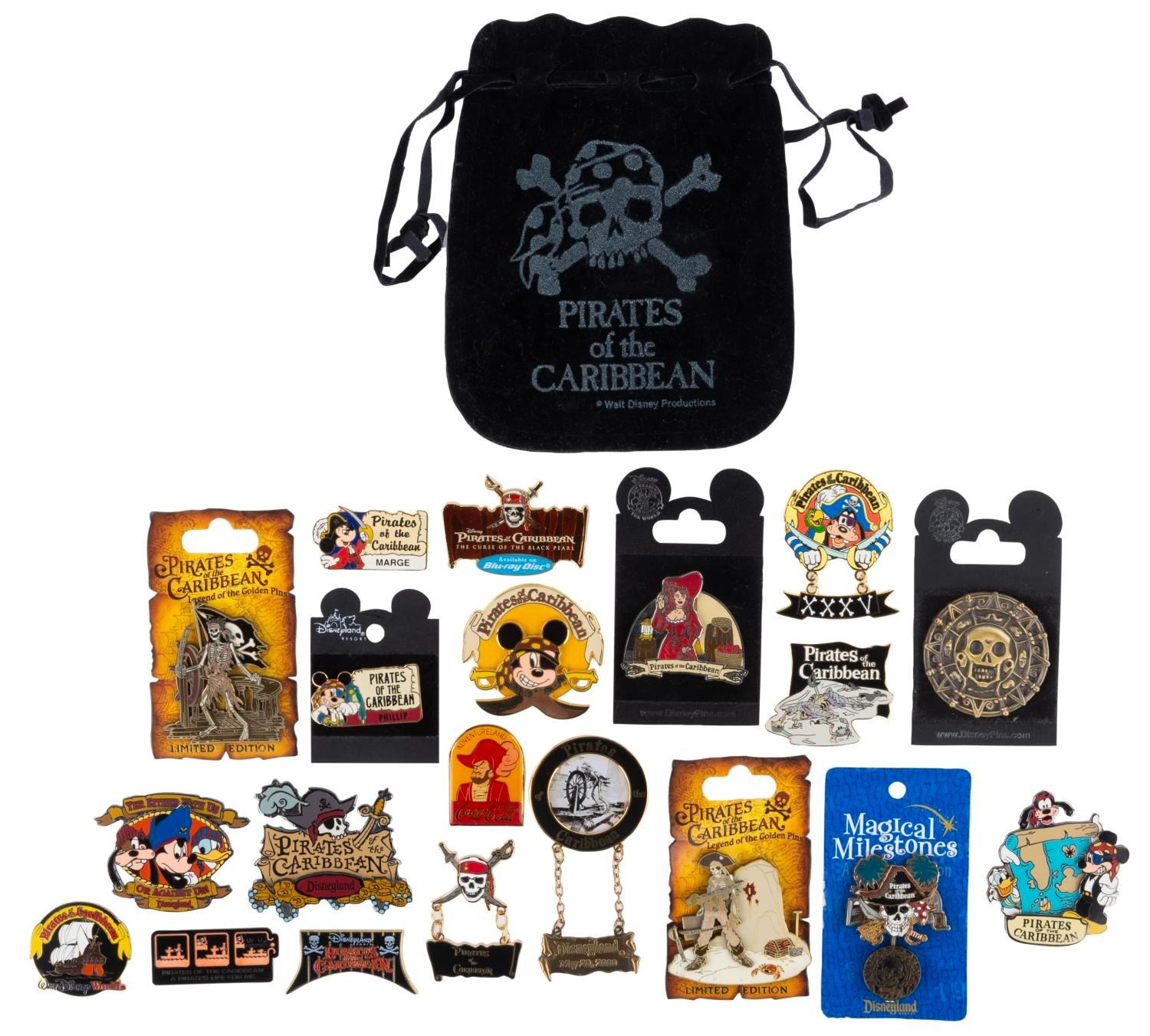 (Disney Parks, 1980s-200s) A collection of 20 early Pirates of the Carribean pins. Included are nine from Disneyland, two from Walt Disney World including a very early Coca Cola pin, two from Disneyland Paris, and eleven general Parks releases, or relating to the films. The set includes limited edition pins, with all in very good to fine condition, seven on the original cards. Also included is a small Pirates of the Carribean pouch.