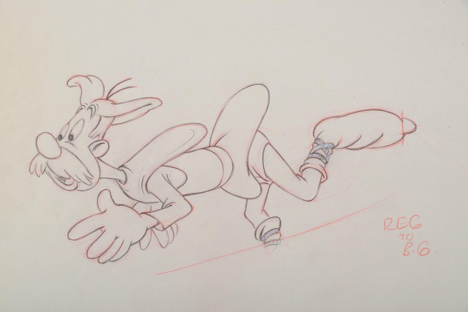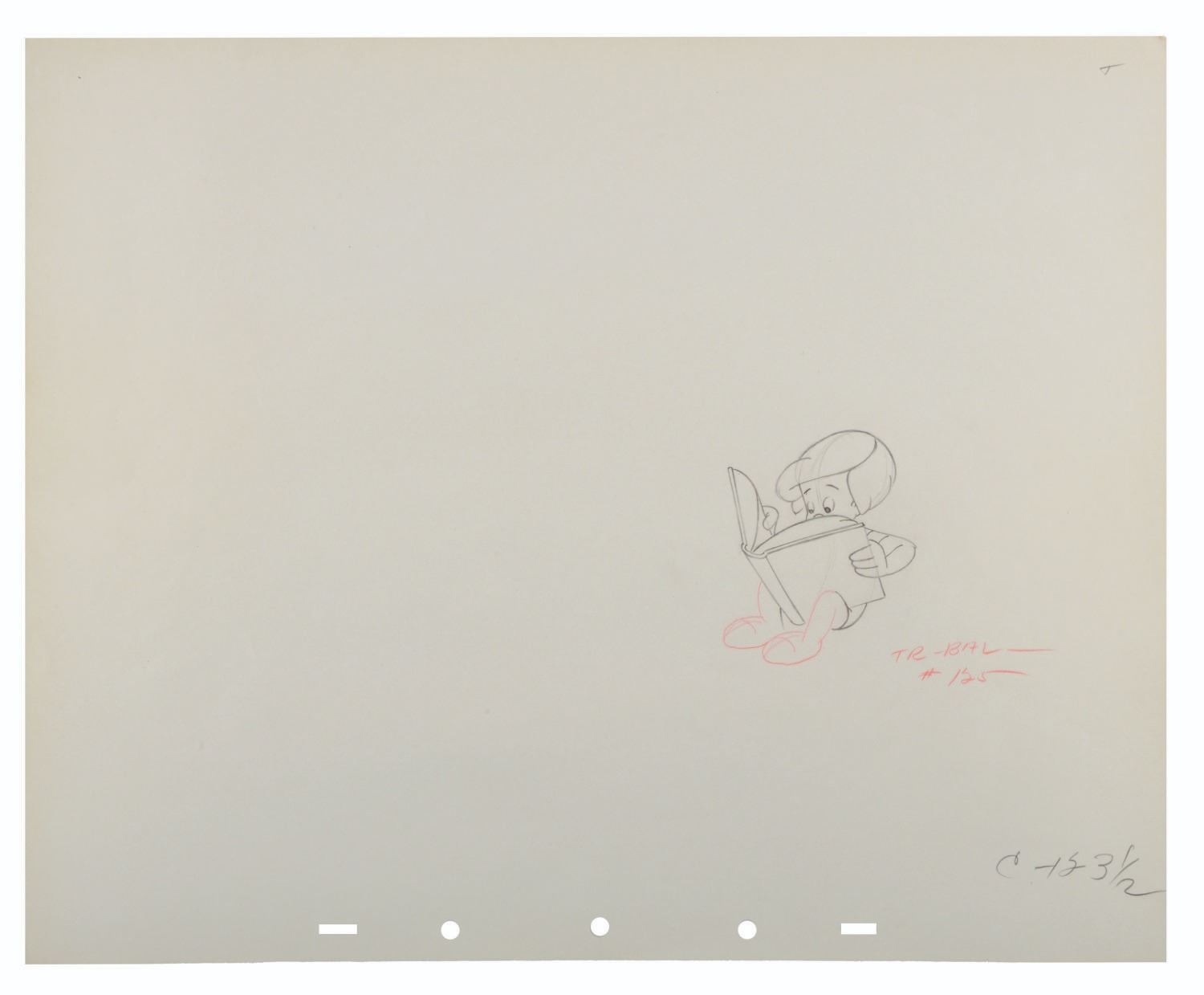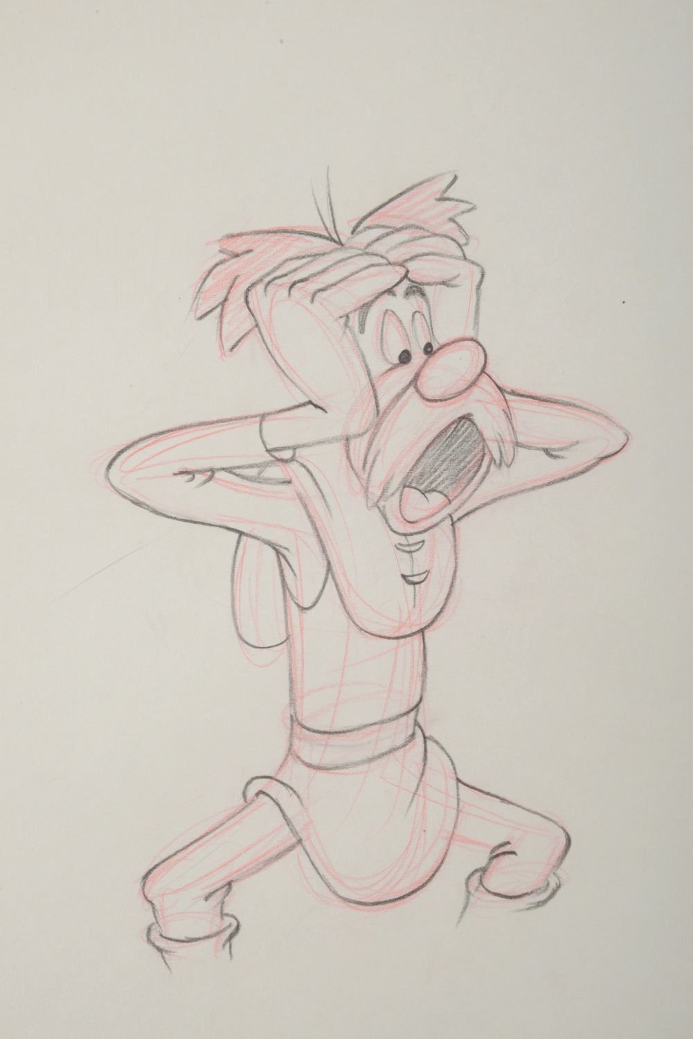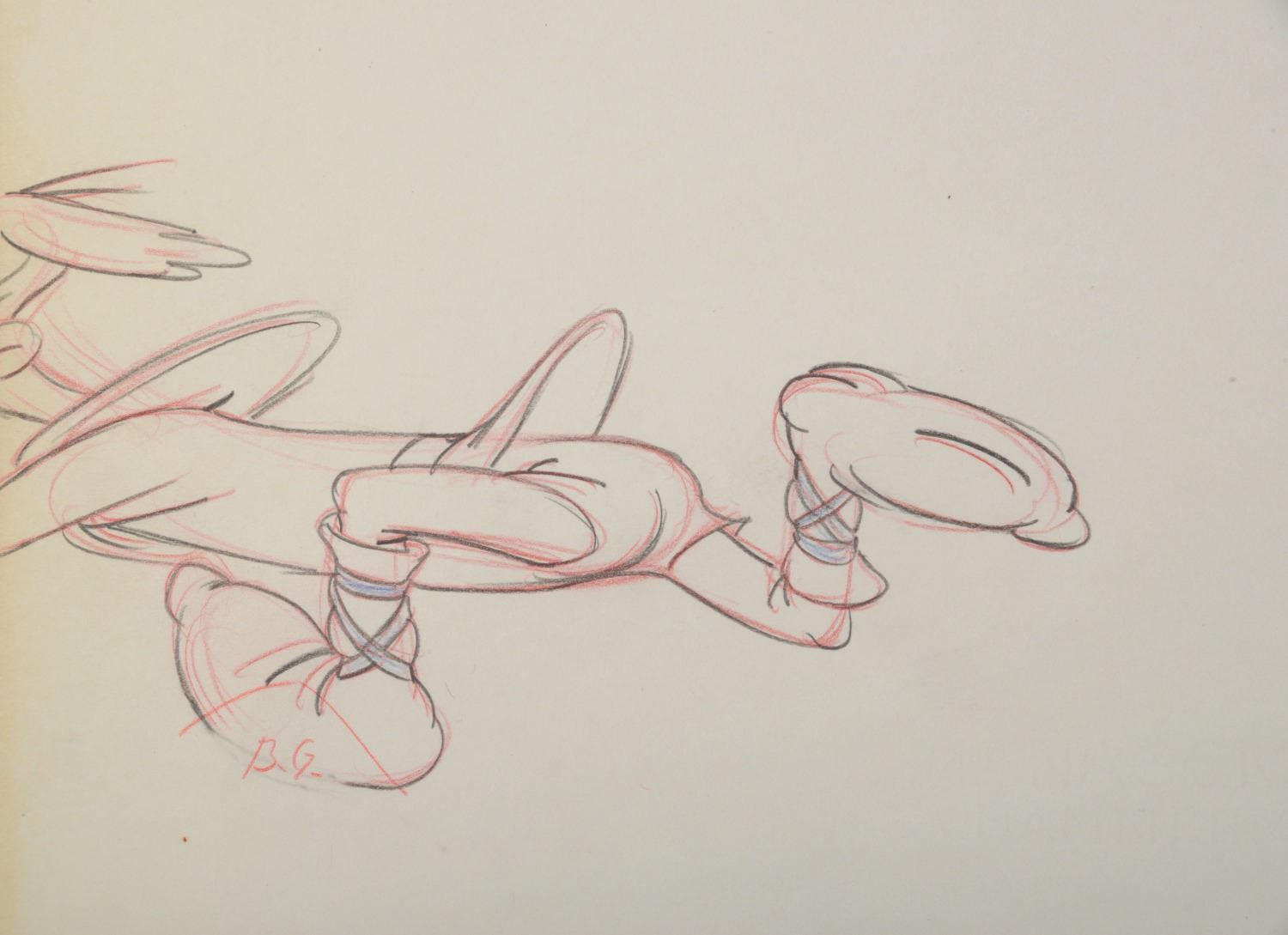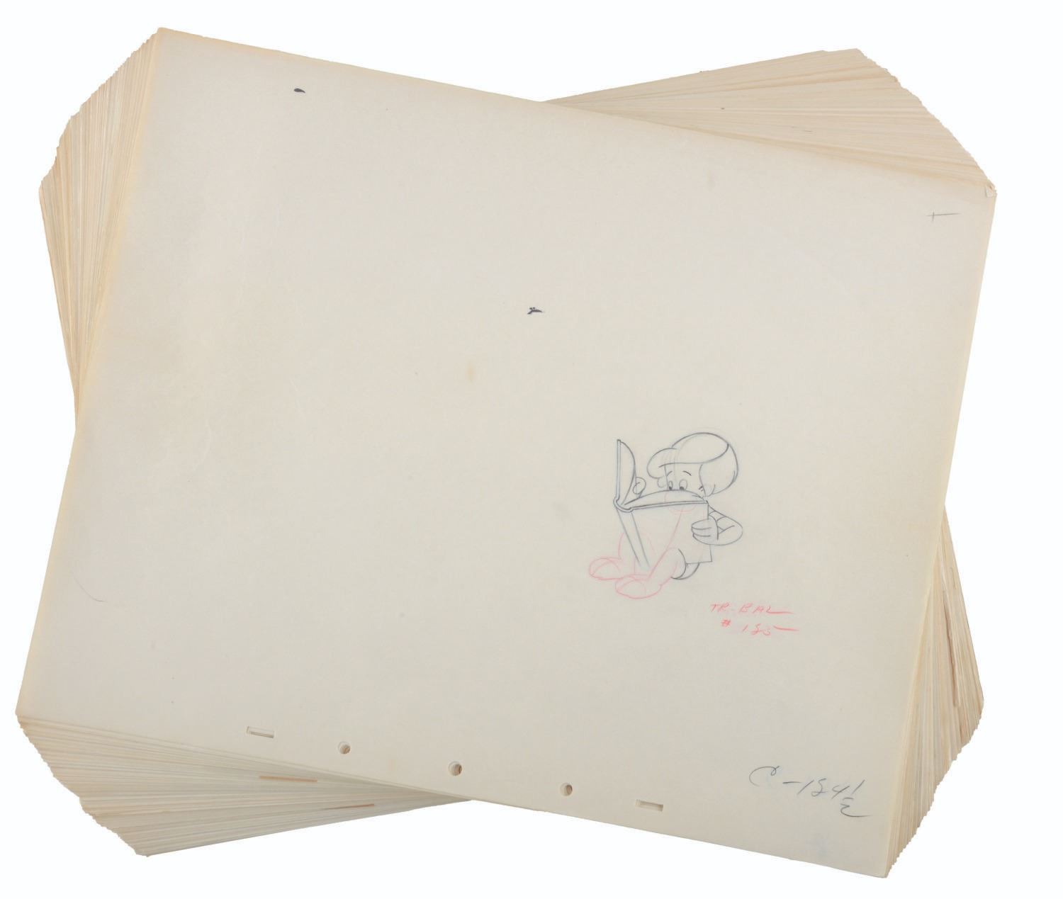 (Disney, 1941) A very large collection of 188 production drawings from the animated"The Reluctant Dragon." Included are sequences of The Boy reading a book and The Father worried about the dragon. This is an exceptional lot of drawings from the first live-action and animated Disney film, which featured a rare behind-the-scenes tour of the Walt Disney Studios. With image sizes ranging from 1" x 1" to 4.25" x 8.25" on 12.5" x 15.5" animation paper, the graphite and colored pencil drawings display in good to very good condition with edge wear and discoloration from age.