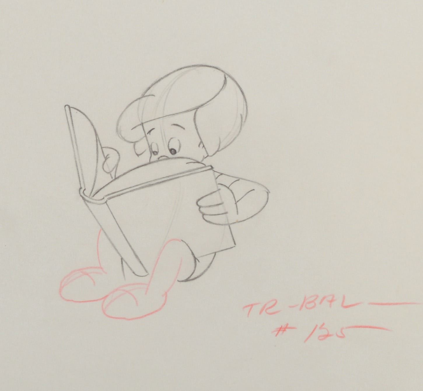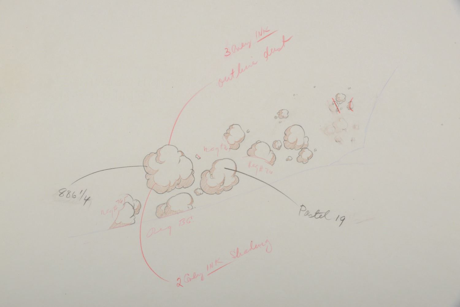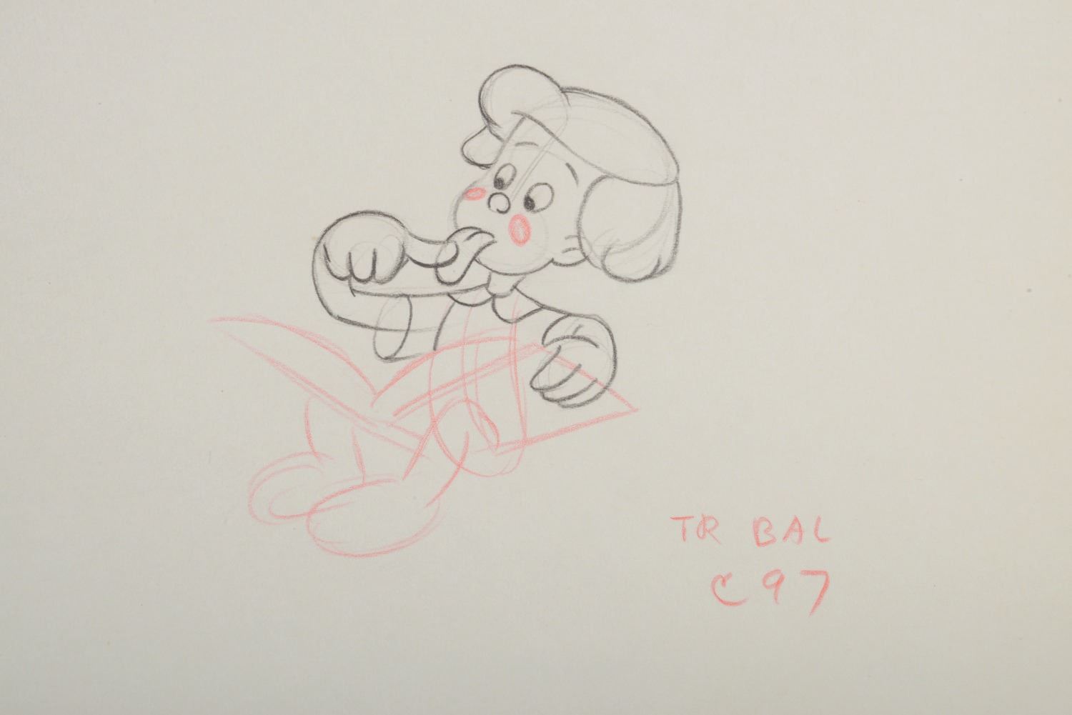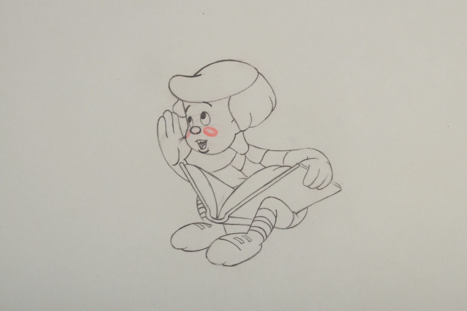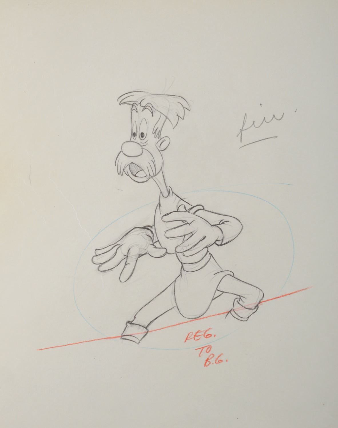 (Disney, 1941) A very large collection of 188 production drawings from the animated"The Reluctant Dragon." Included are sequences of The Boy reading a book and The Father worried about the dragon. This is an exceptional lot of drawings from the first live-action and animated Disney film, which featured a rare behind-the-scenes tour of the Walt Disney Studios. With image sizes ranging from 1" x 1" to 4.25" x 8.25" on 12.5" x 15.5" animation paper, the graphite and colored pencil drawings display in good to very good condition with edge wear and discoloration from age.