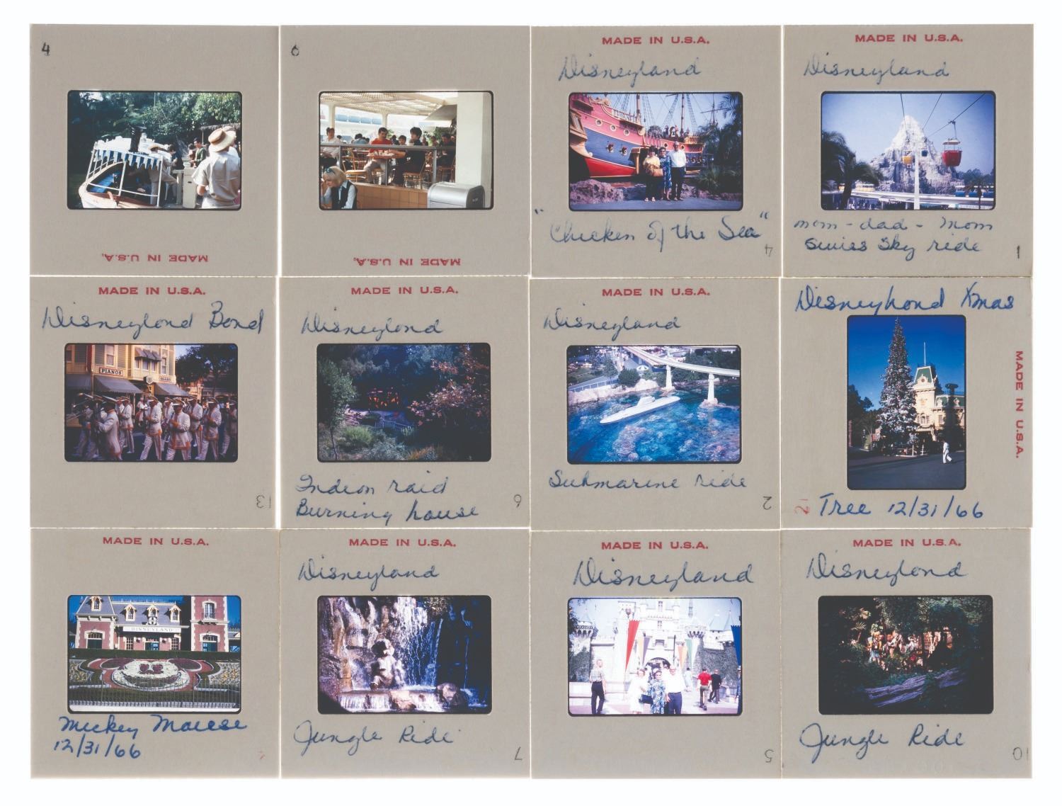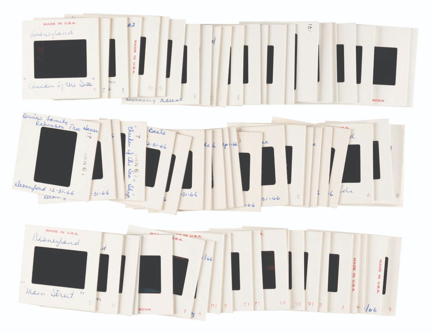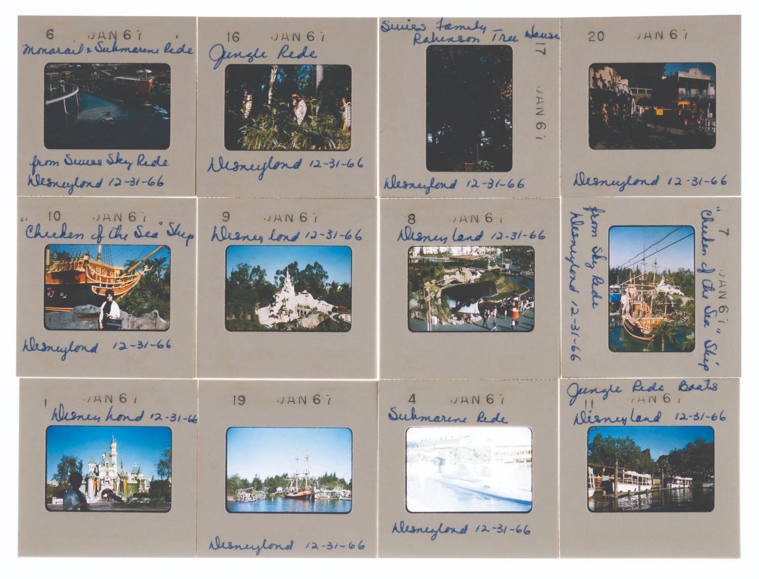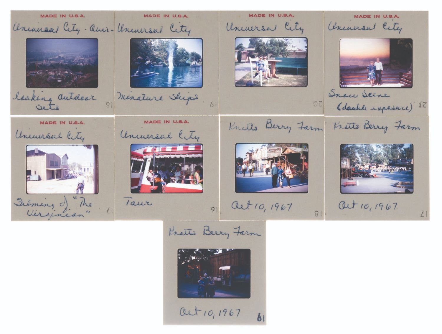 (Disneyland/Southern California, 1966-1970) A collection of eighty-one slides from Disneyland, Universal Studios, and Knott’s Berry Farm. The slides include photographs of the Chicken of the Sea Pirate Ship and Restaurant, the Submarine Voyage, the Universal Studios Backlot Tour, and the filming of the TV series “The Virginian.” These are just a few of the many great attractions and moments captured in the collection. Measuring 2” x 2” each, the slides are in very good condition with light scratches, wear, and descriptions written in pen.