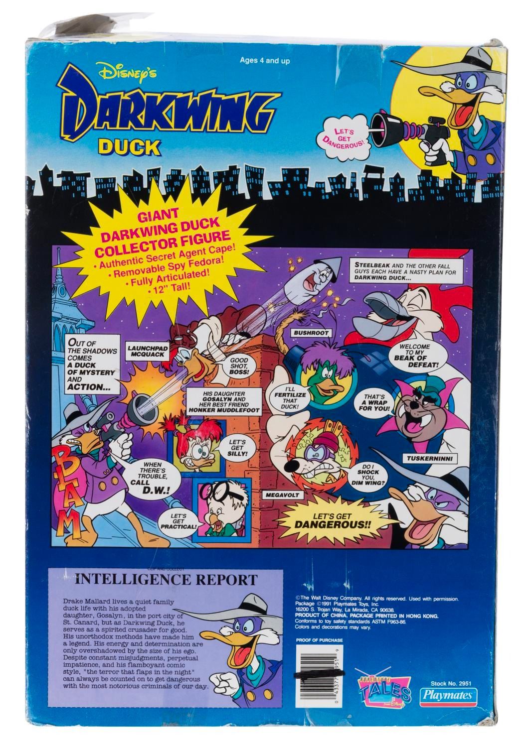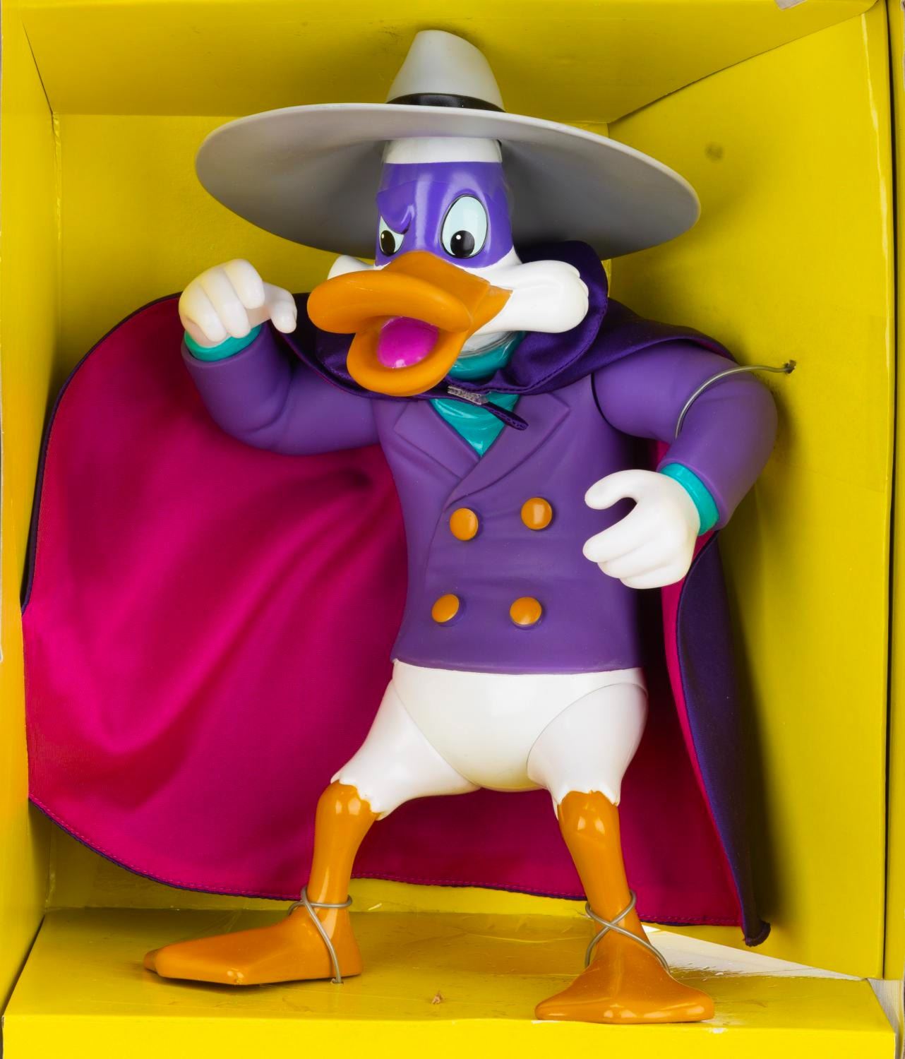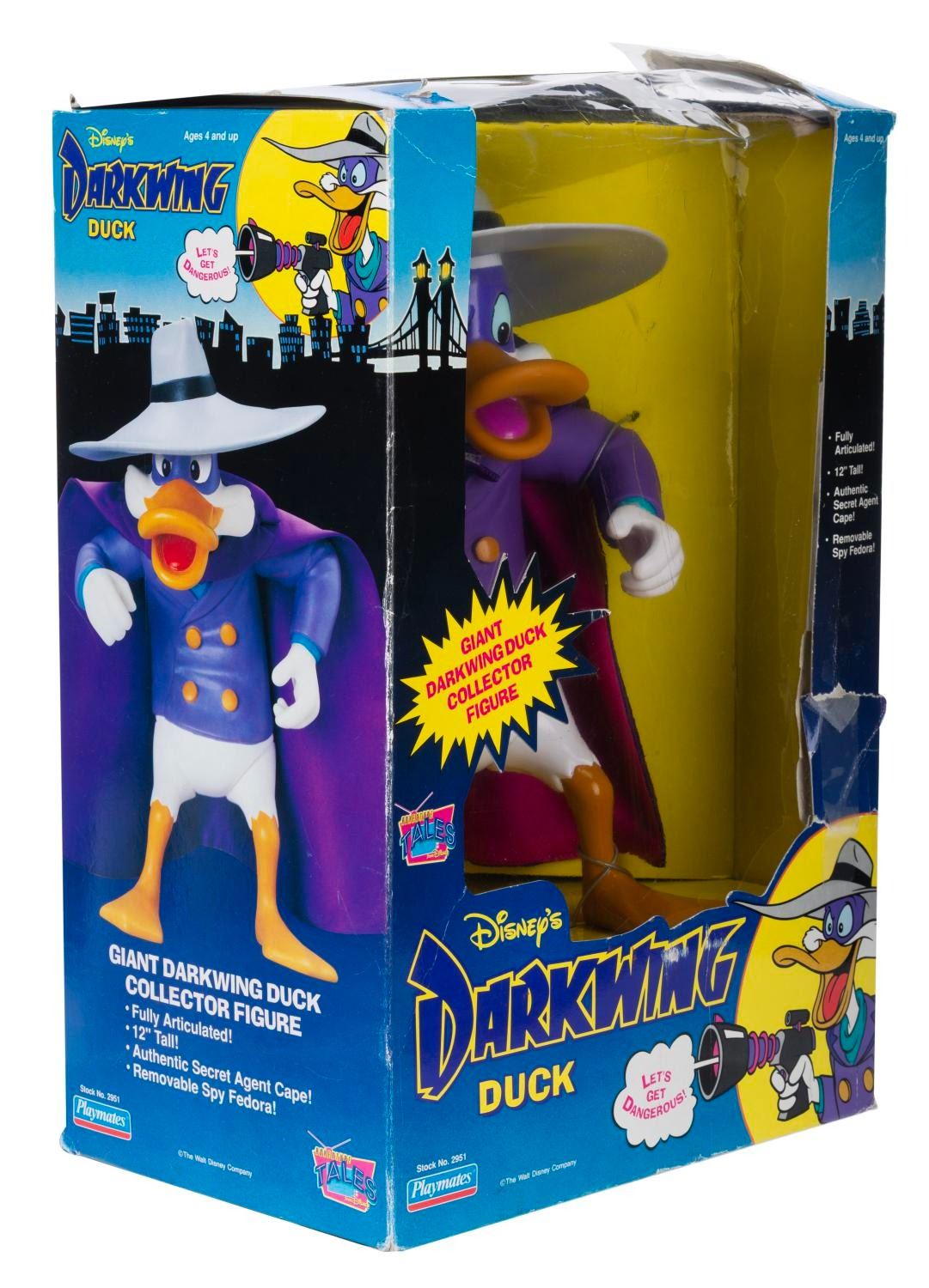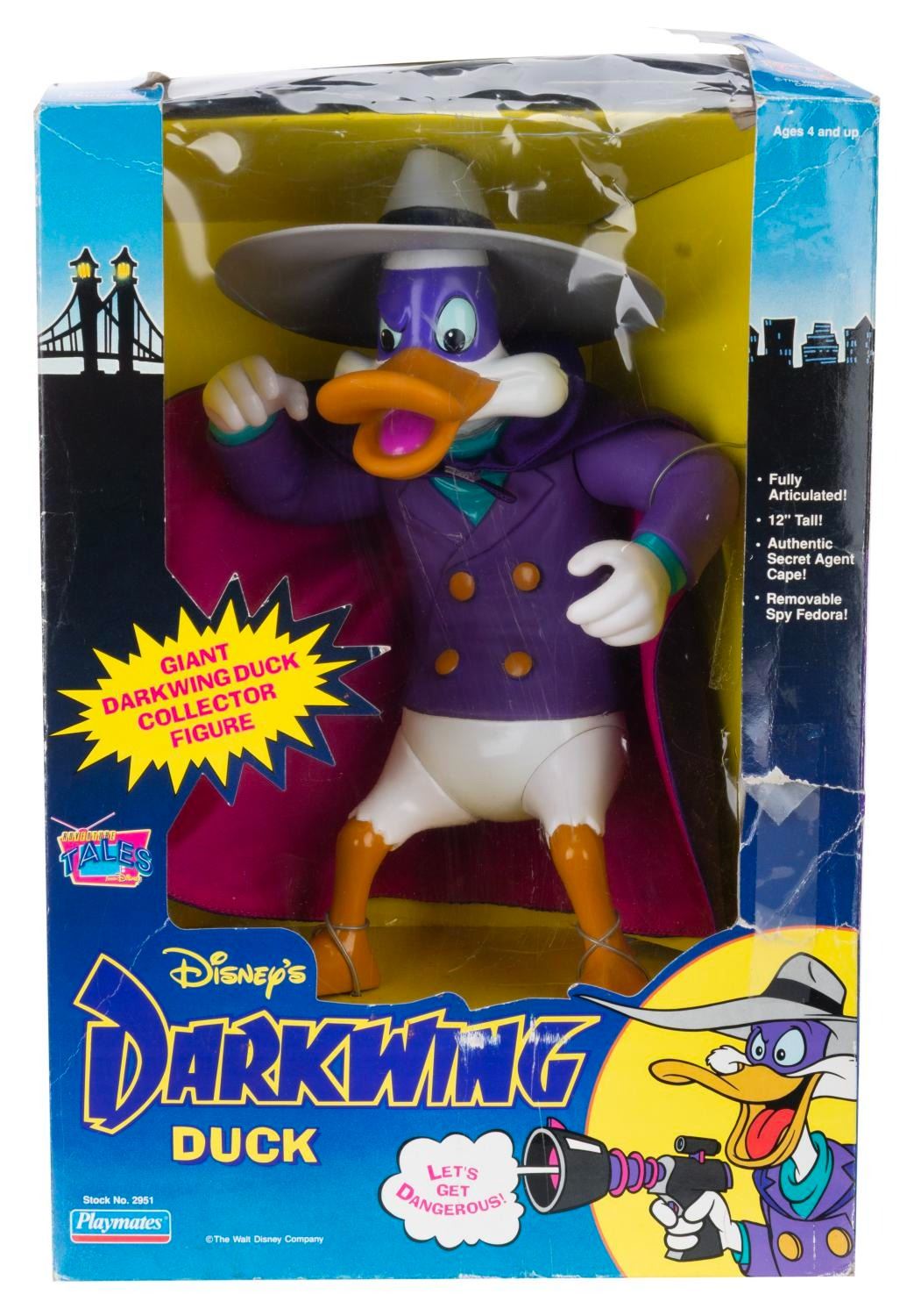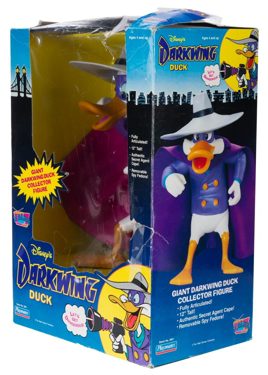 (Playmates, 1991) A "Darkwing Duck" collector figure, still in the original box. The figure is poseable with a cape and removable spy fedora. Standing 11" tall, the figure is in fine condition. The box is in fair condition with heavy wear overall.