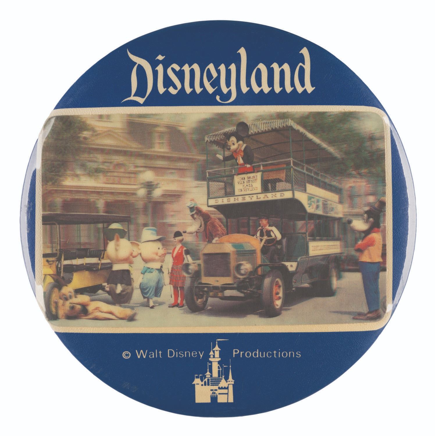 (ASCO, 1966) A large Disneyland souvenir button. This unusually large button features lenticular imagery of Disney Characters and a Tour Guide near the Omnibus on Main Street. The button was manufactured by Advertising Specialty Company, who manufactured buttons, pennants and other souvenirs for Disneyland. This large novelty button has a pinback and punch out tabs on its back for display mounting. Measuring an incredible 6" in diameter, it is in very good condition with faint discoloration from age and minor wear to the punch tabs on its back.
