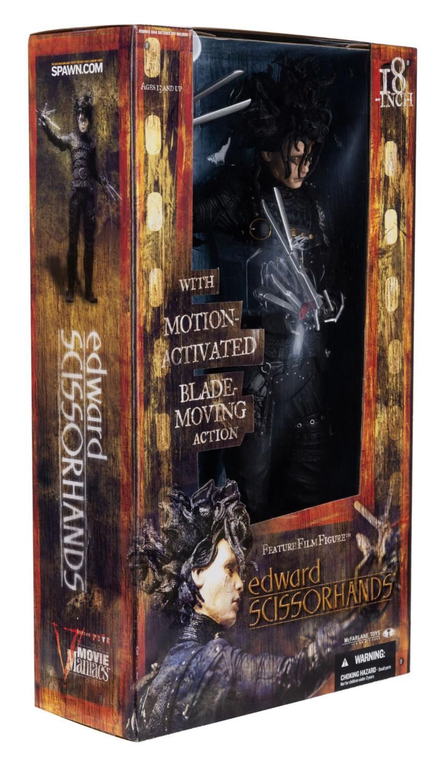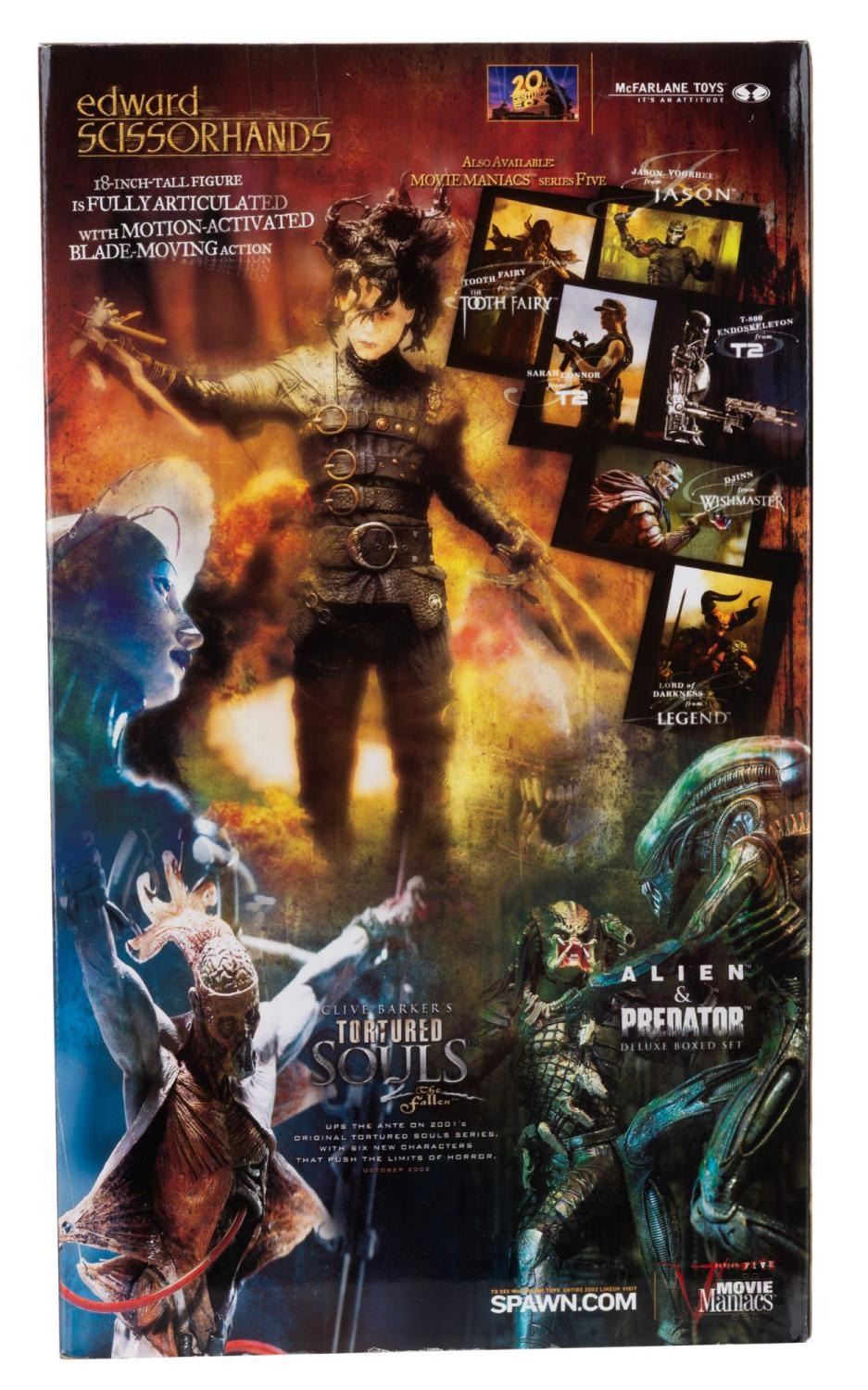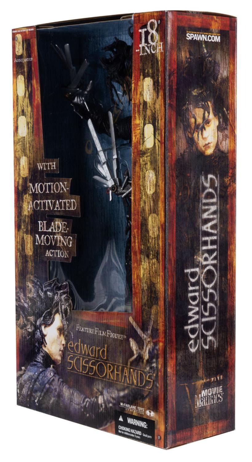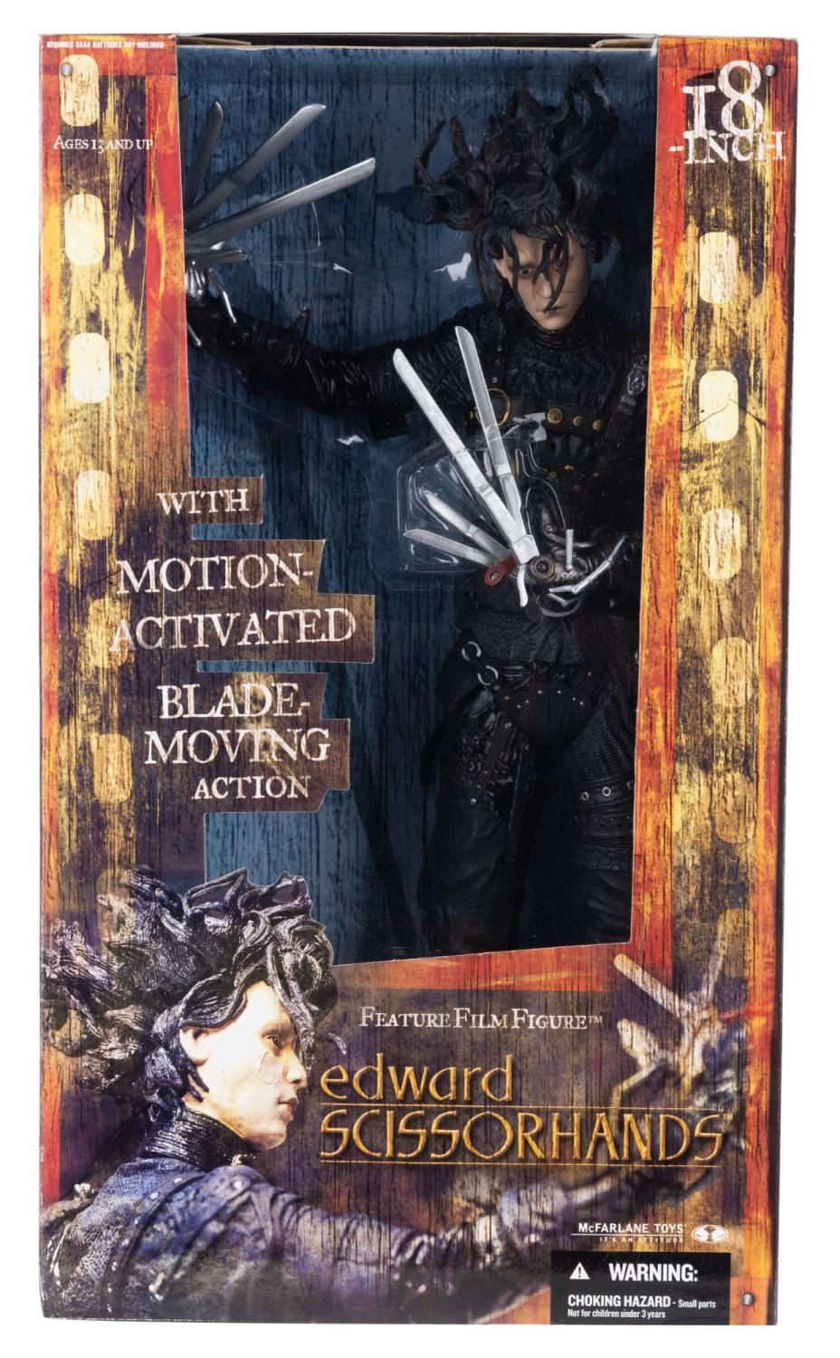 (McFarlane Toys, 2002) An "Edward Scissorhands" action figure with blade-moving action. The unopened figure has a motion-activated blade moving feature, which cannot be tested for function with included demonstration batteries expired. Measuring 18" tall, the figure is in fine condition within the very good condition box with typical light handling wear.