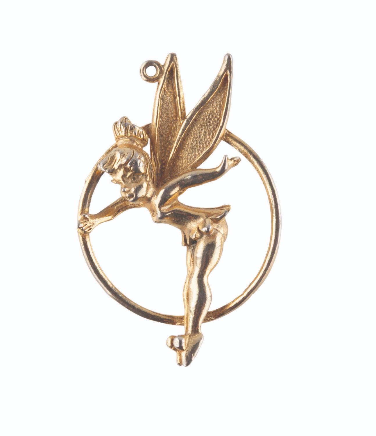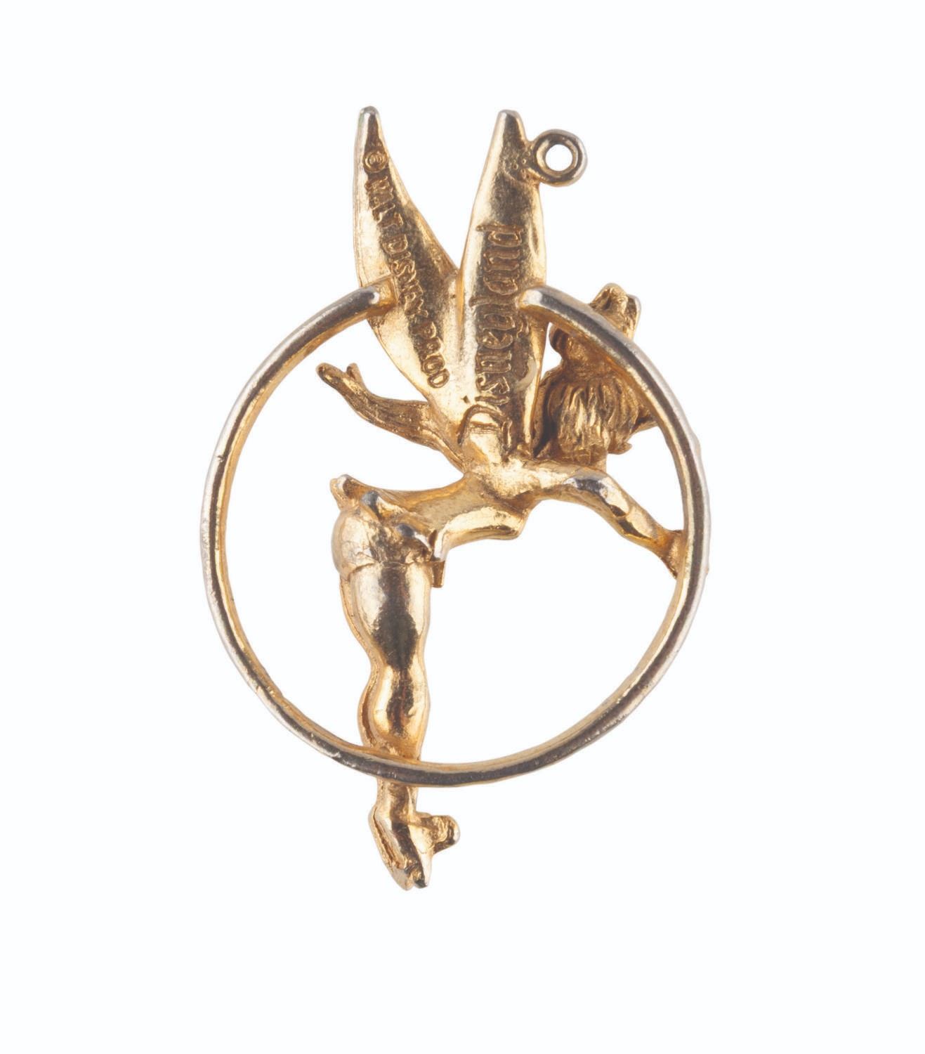 (Disneyland, 1950s) A large gold-colored metal charm of Tinker Bell with "Disneyland " on the back. Measuring 2 " x 1.25 ", the charm is in very good condition with light wear from handling.