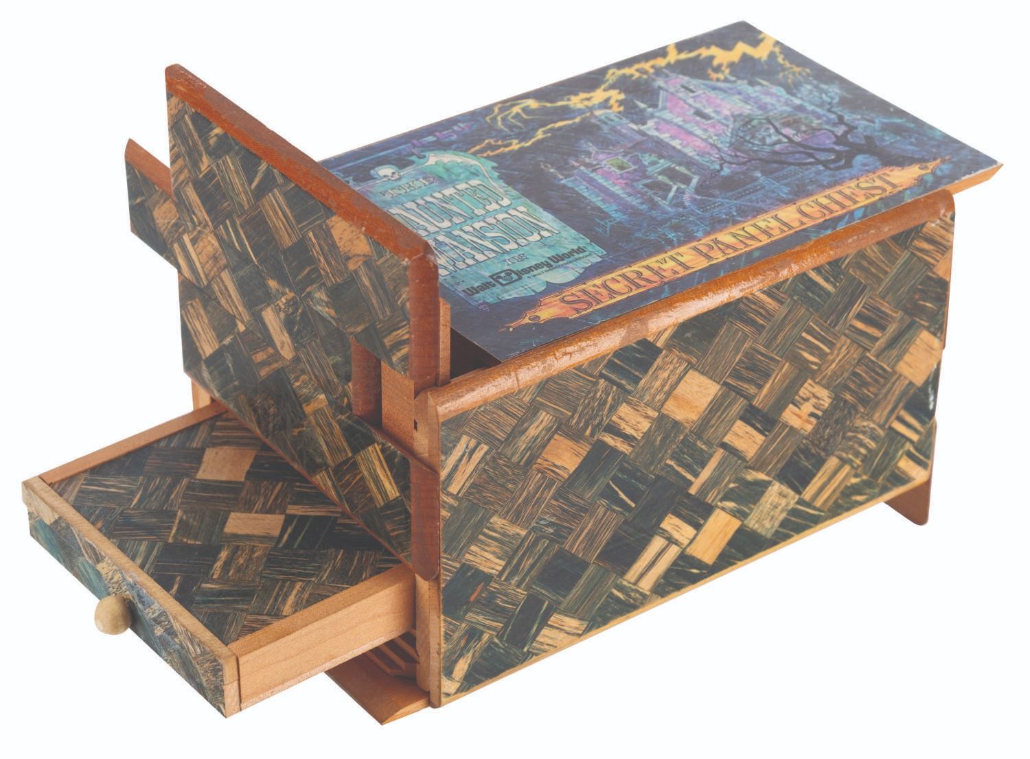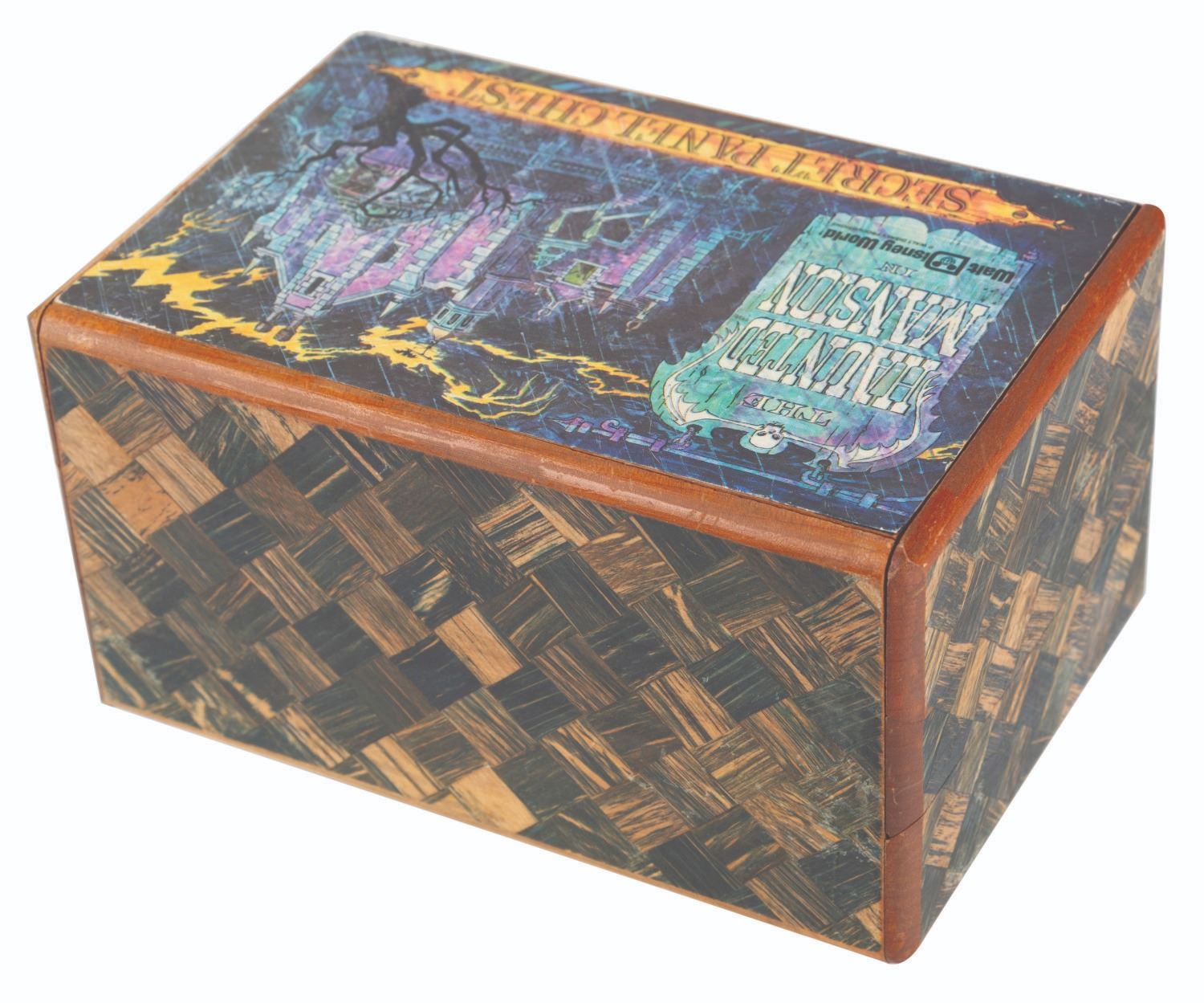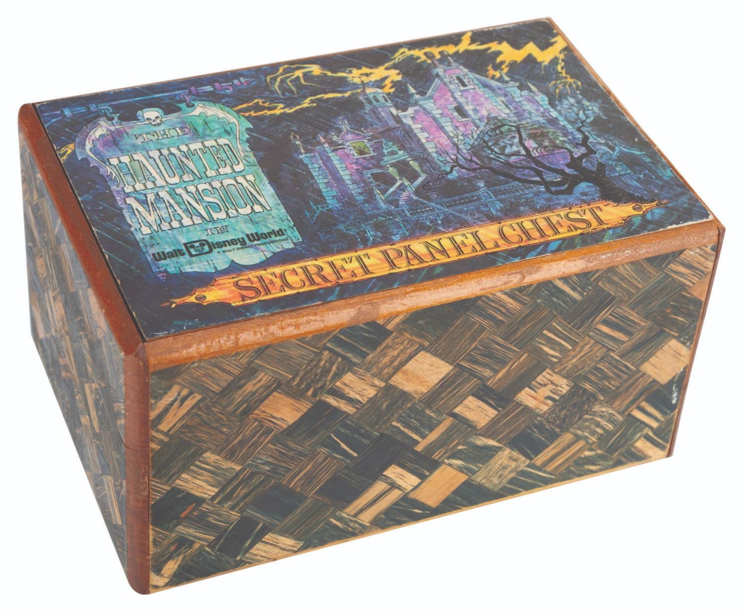 (Walt Disney World, 1970s) A very rare large-sized Walt Disney World Haunted Mansion Secret Panel Chest puzzle box. A series of small moves in a specific pattern reveals hidden compartments. Available in three sizes, this large chest measures 6" x 4" x 3" tall. These toys were frequently damaged by frustrated owners, but this one is in very good working condition, with light wear from use.