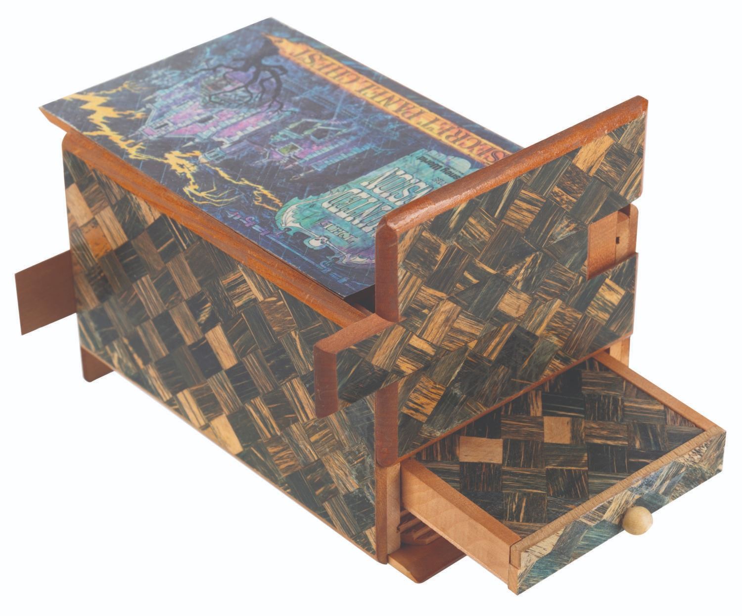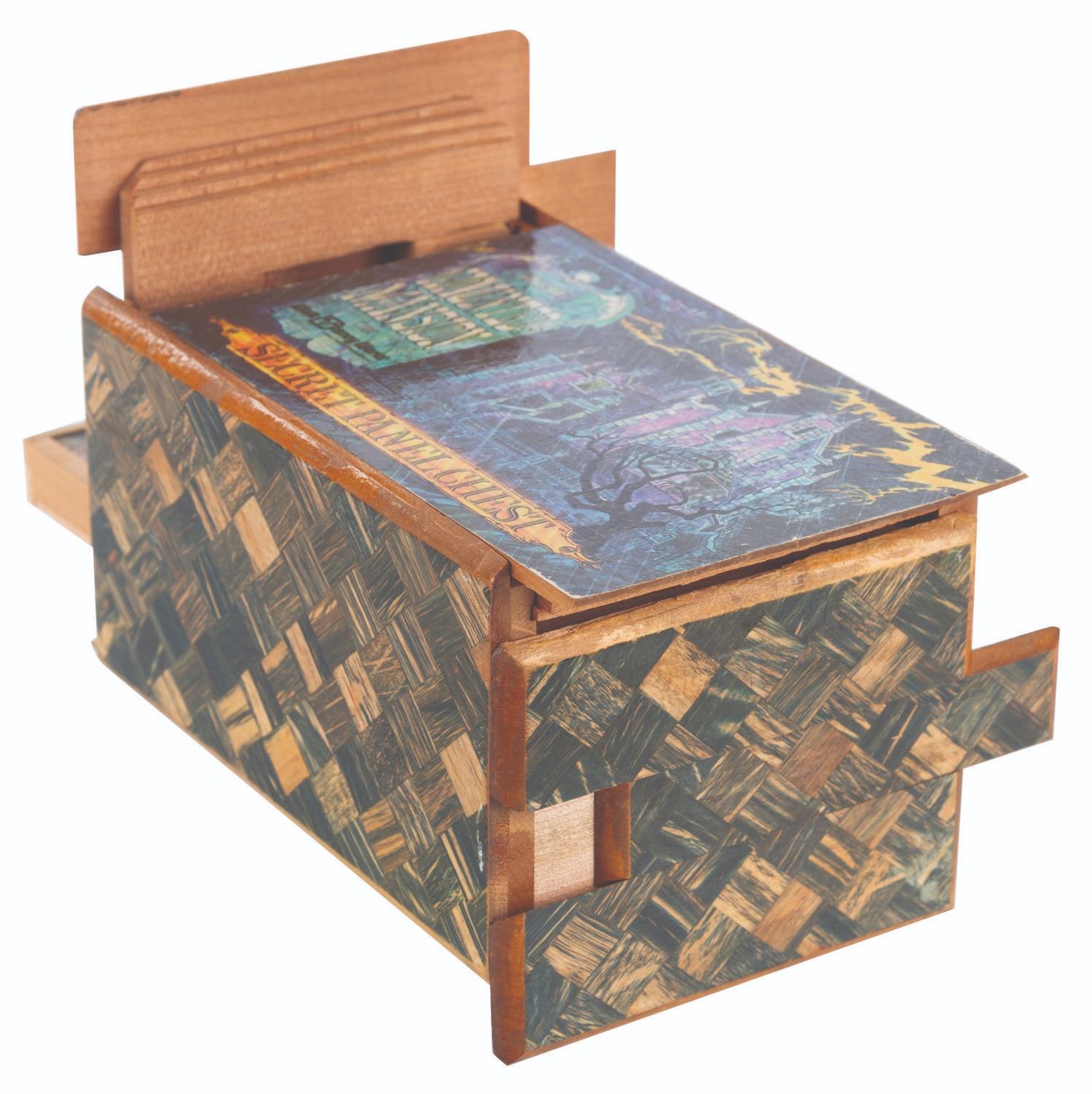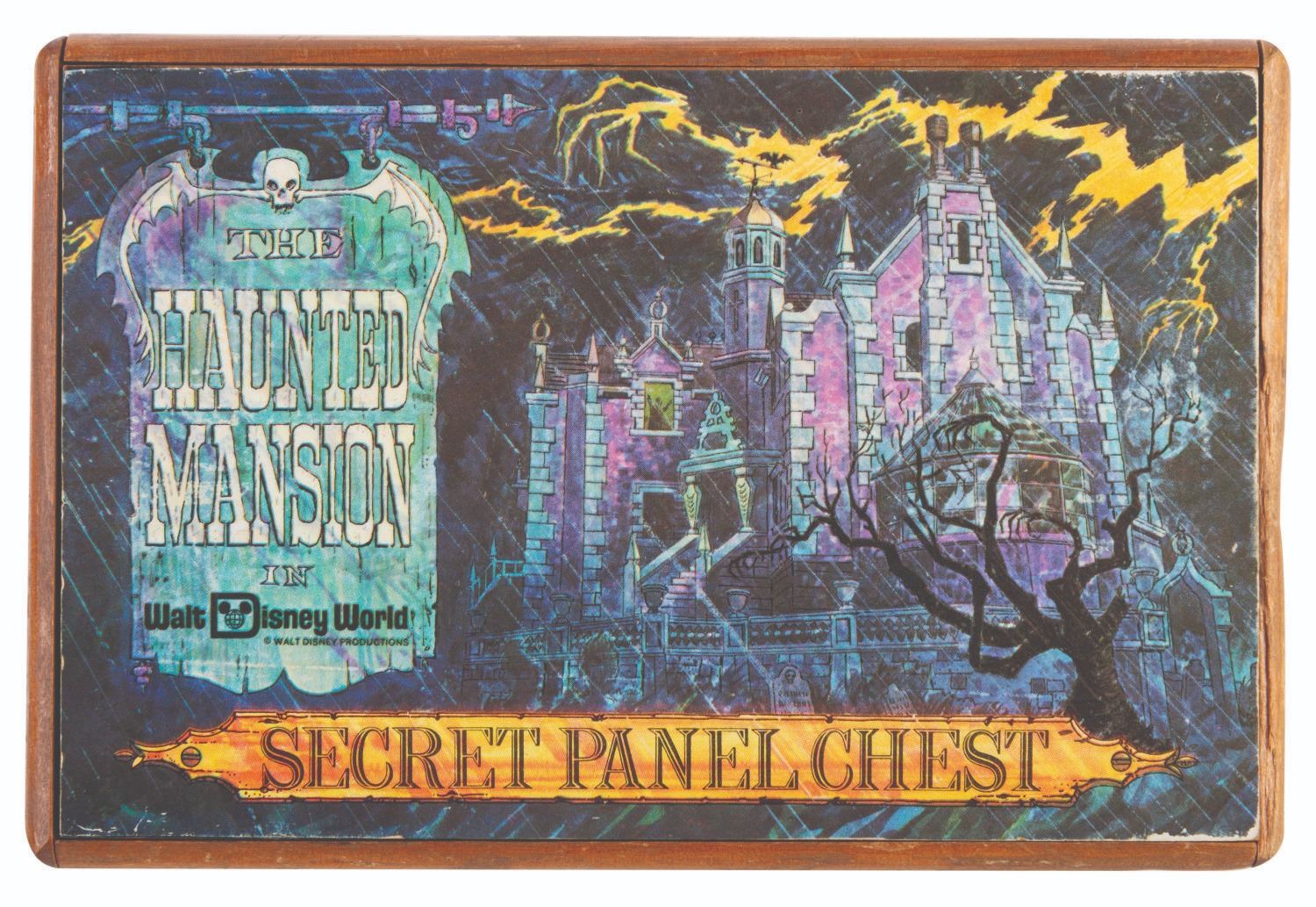 (Walt Disney World, 1970s) A very rare large-sized Walt Disney World Haunted Mansion Secret Panel Chest puzzle box. A series of small moves in a specific pattern reveals hidden compartments. Available in three sizes, this large chest measures 6" x 4" x 3" tall. These toys were frequently damaged by frustrated owners, but this one is in very good working condition, with light wear from use.