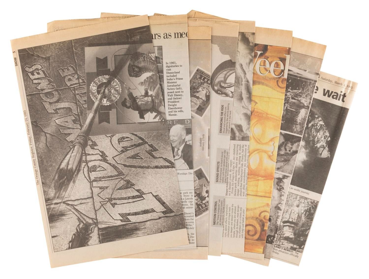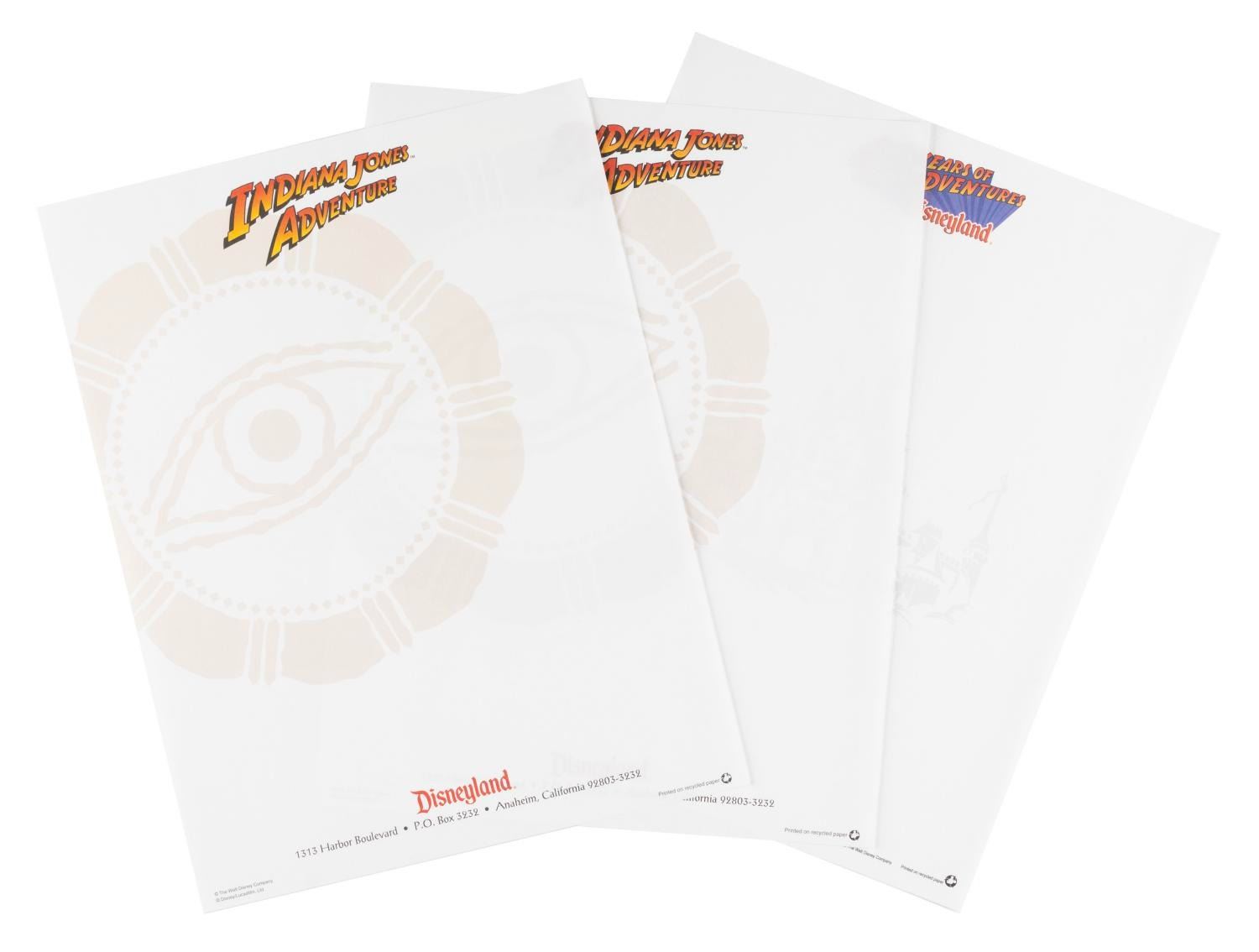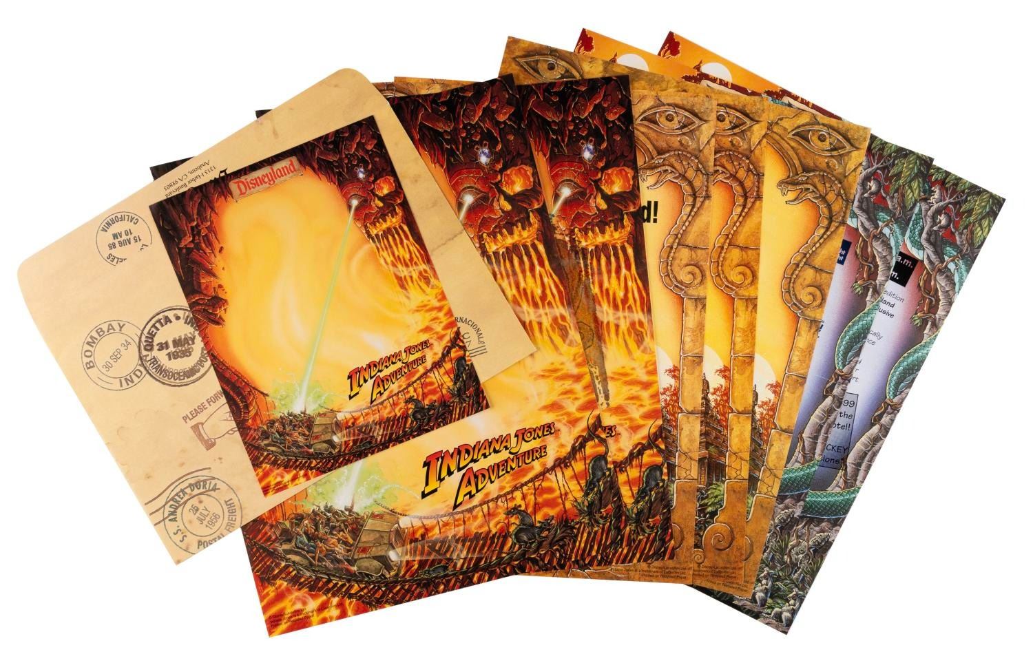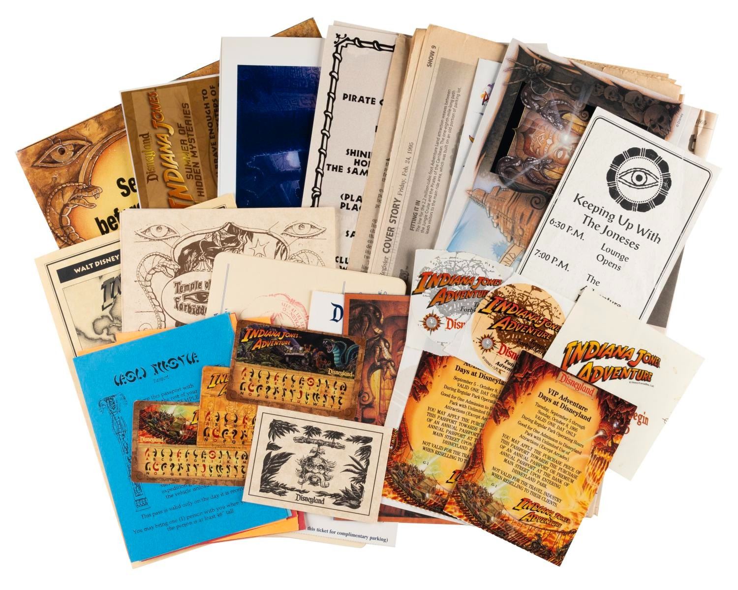 (WDI/Disneyland, 1994-2015) A truly massive collection of ephemera from Disneyland’s Indiana Jones Adventure. Included among the 90 pieces are decoder cards, invitations, game cards, a commemorative Adventureland card featuring Mara, “Future Adventurer” stickers given out to children, Child Switch passes, Boarding Passes distributed at limited attendance events, magazine and newspaper clippings, stationery samples, flyers for special events, and more. The items date from early Imagineering articles about the attraction’s creation in 1994 until at least the 20th anniversary in 2015. This fantastic lot of ephemera is mostly in very good condition with typical handling wear, and one boarding pass intentionally distressed.