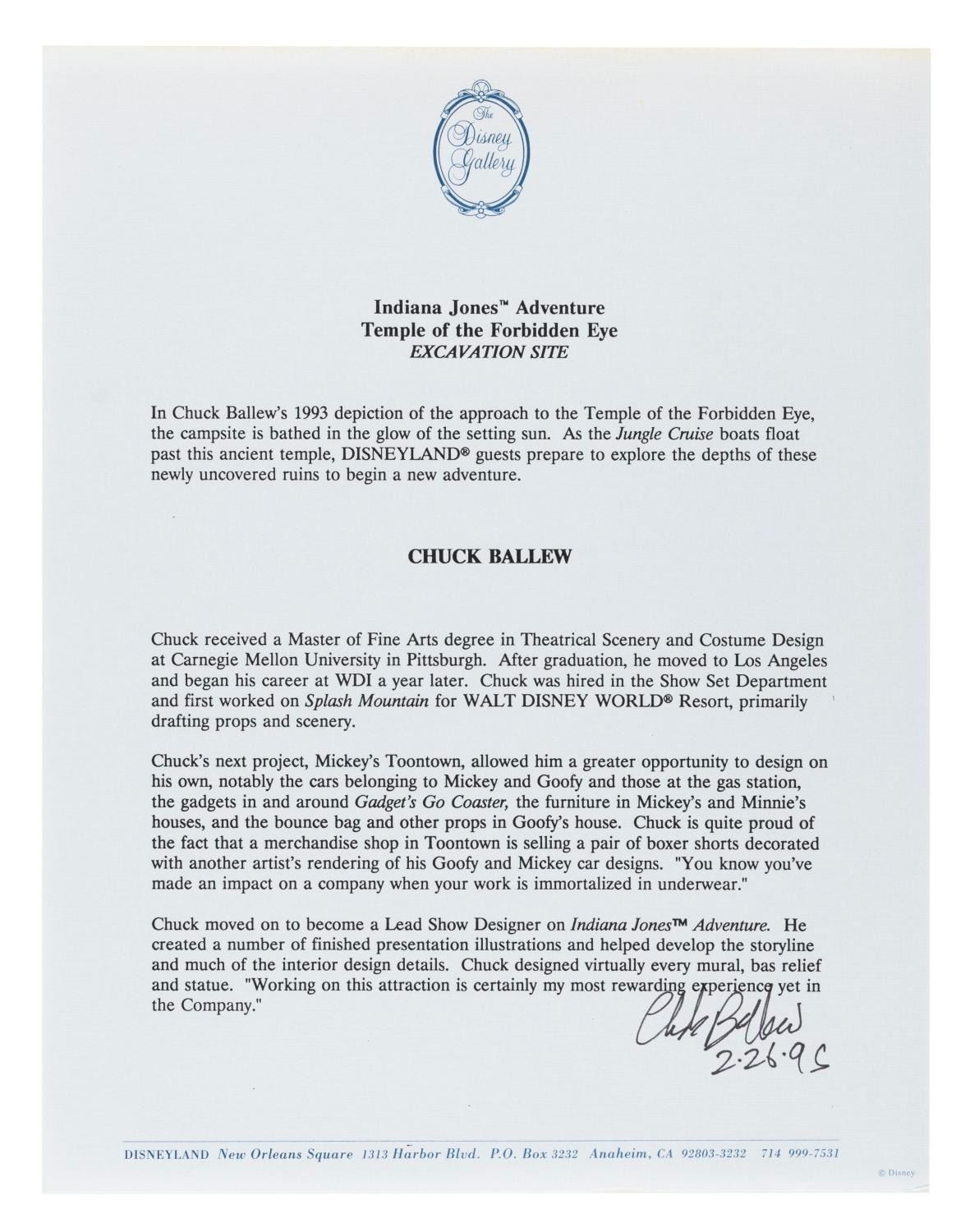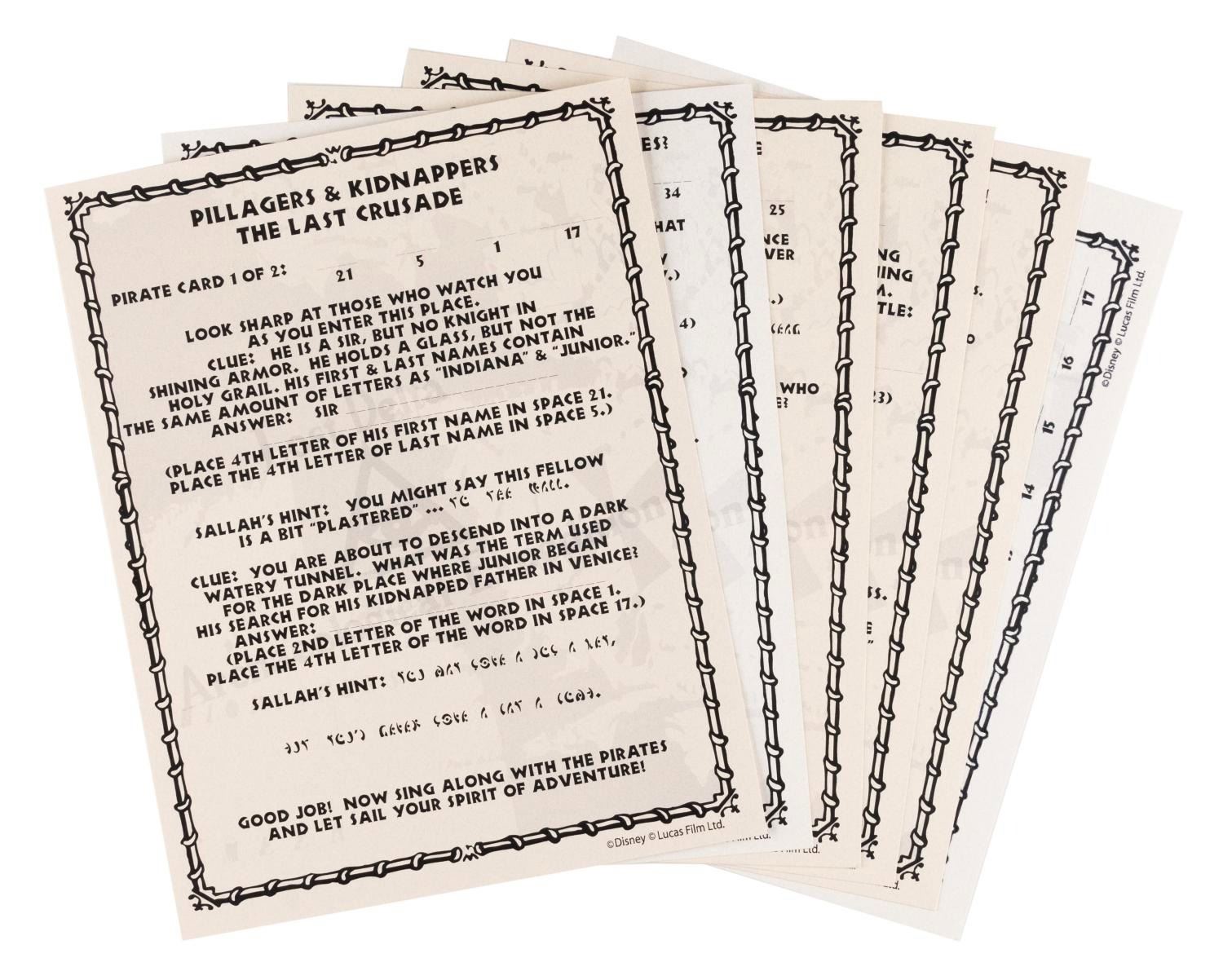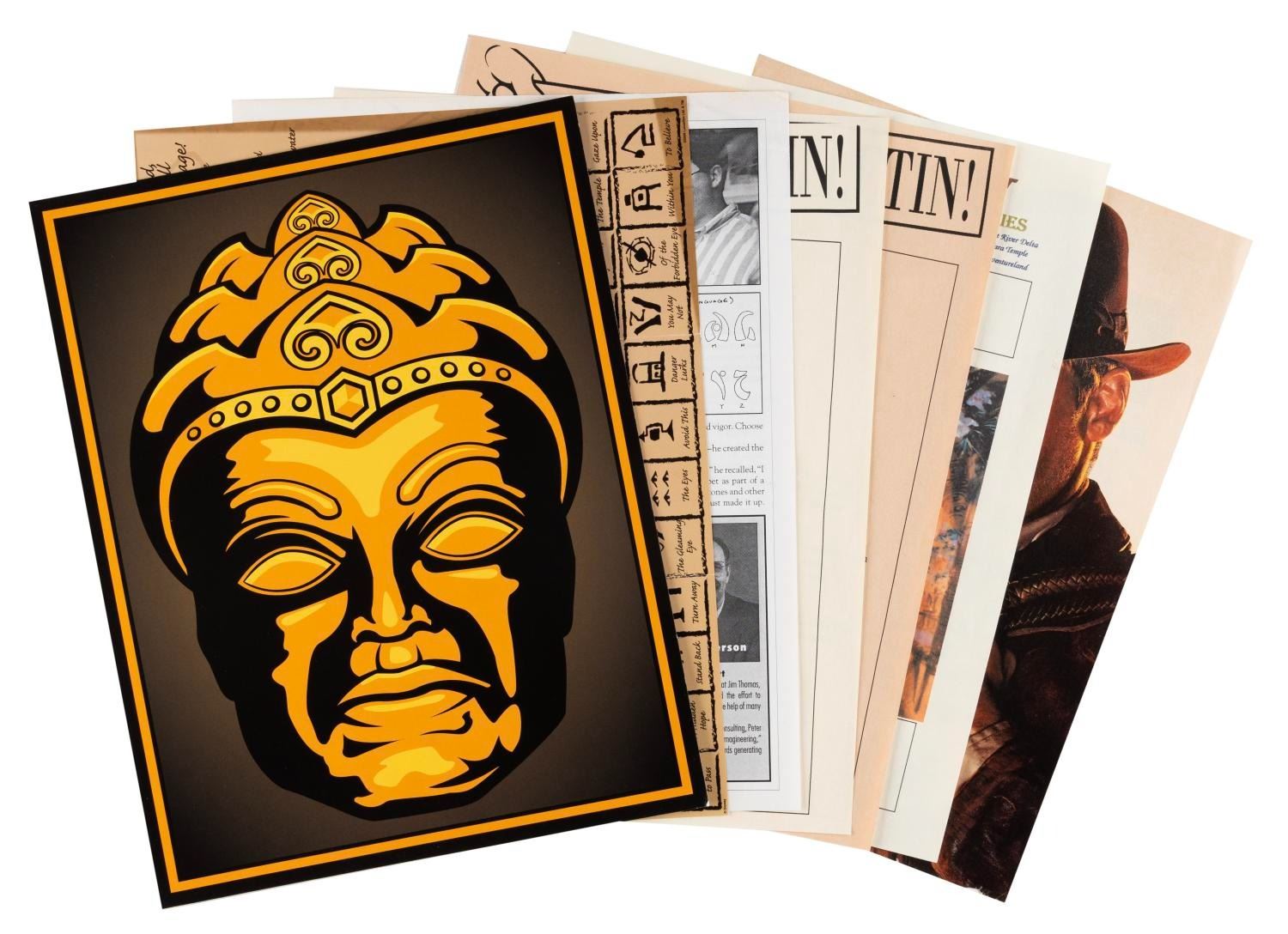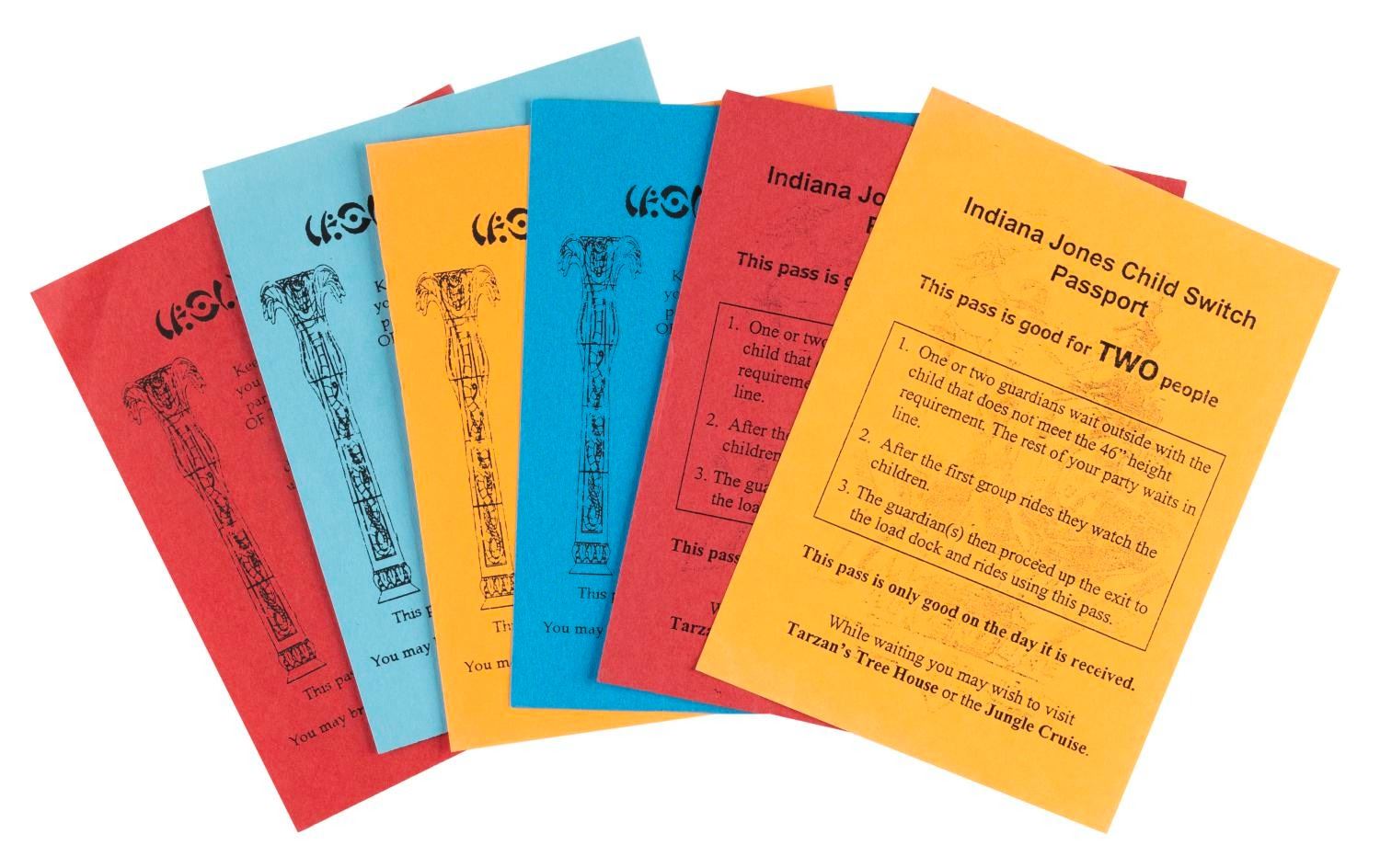 (WDI/Disneyland, 1994-2015) A truly massive collection of ephemera from Disneyland’s Indiana Jones Adventure. Included among the 90 pieces are decoder cards, invitations, game cards, a commemorative Adventureland card featuring Mara, “Future Adventurer” stickers given out to children, Child Switch passes, Boarding Passes distributed at limited attendance events, magazine and newspaper clippings, stationery samples, flyers for special events, and more. The items date from early Imagineering articles about the attraction’s creation in 1994 until at least the 20th anniversary in 2015. This fantastic lot of ephemera is mostly in very good condition with typical handling wear, and one boarding pass intentionally distressed.