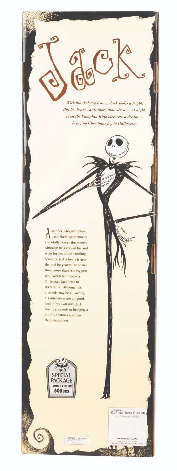 (JUN Planning, 1998) A large plush doll of Jack Skellington from “Tim Burton’s The Nightmare Before Christmas,” released in a limited edition of 600. The doll measuring 12” x 6” x 53” tall is in fine condition, still in the original packaging with tags attached. The box measures 14.5” x 1.25” x 47.5” and displays in very good condition with light wear and creasing. Due to size and weight, this item requires special shipping arrangements. Please inquire before bidding.