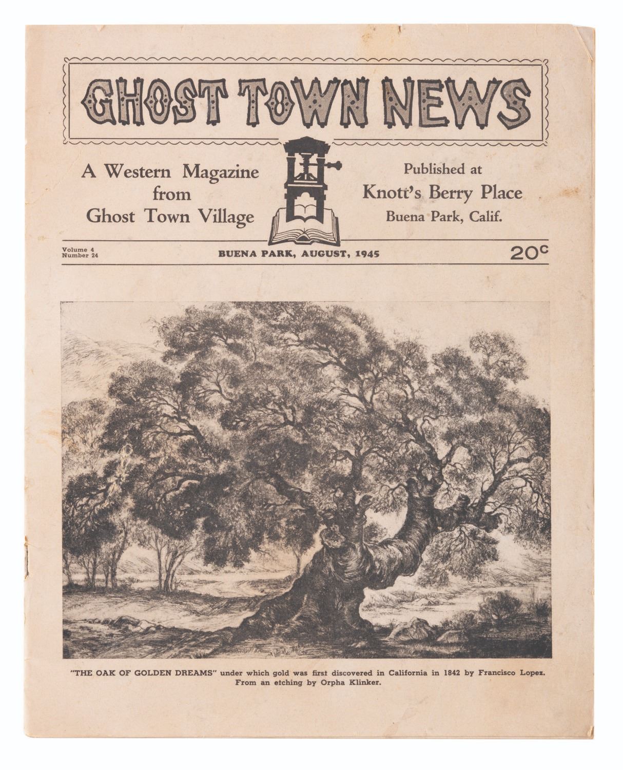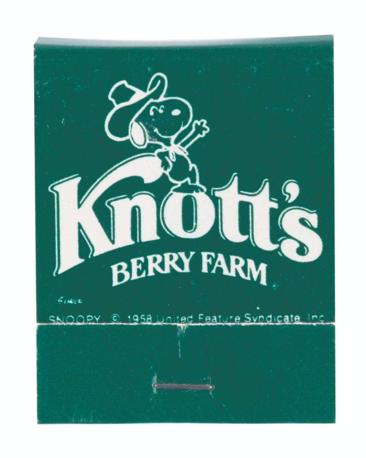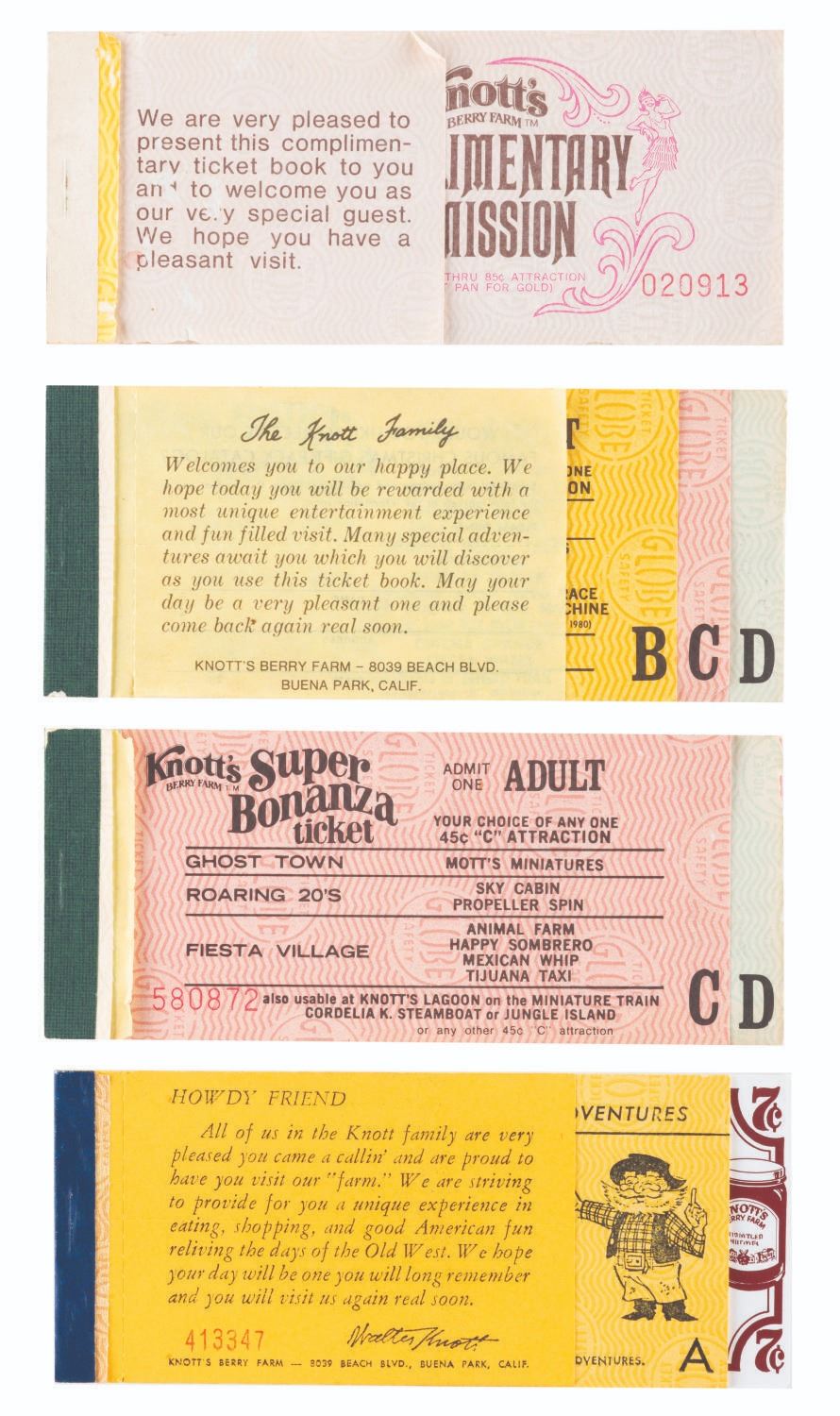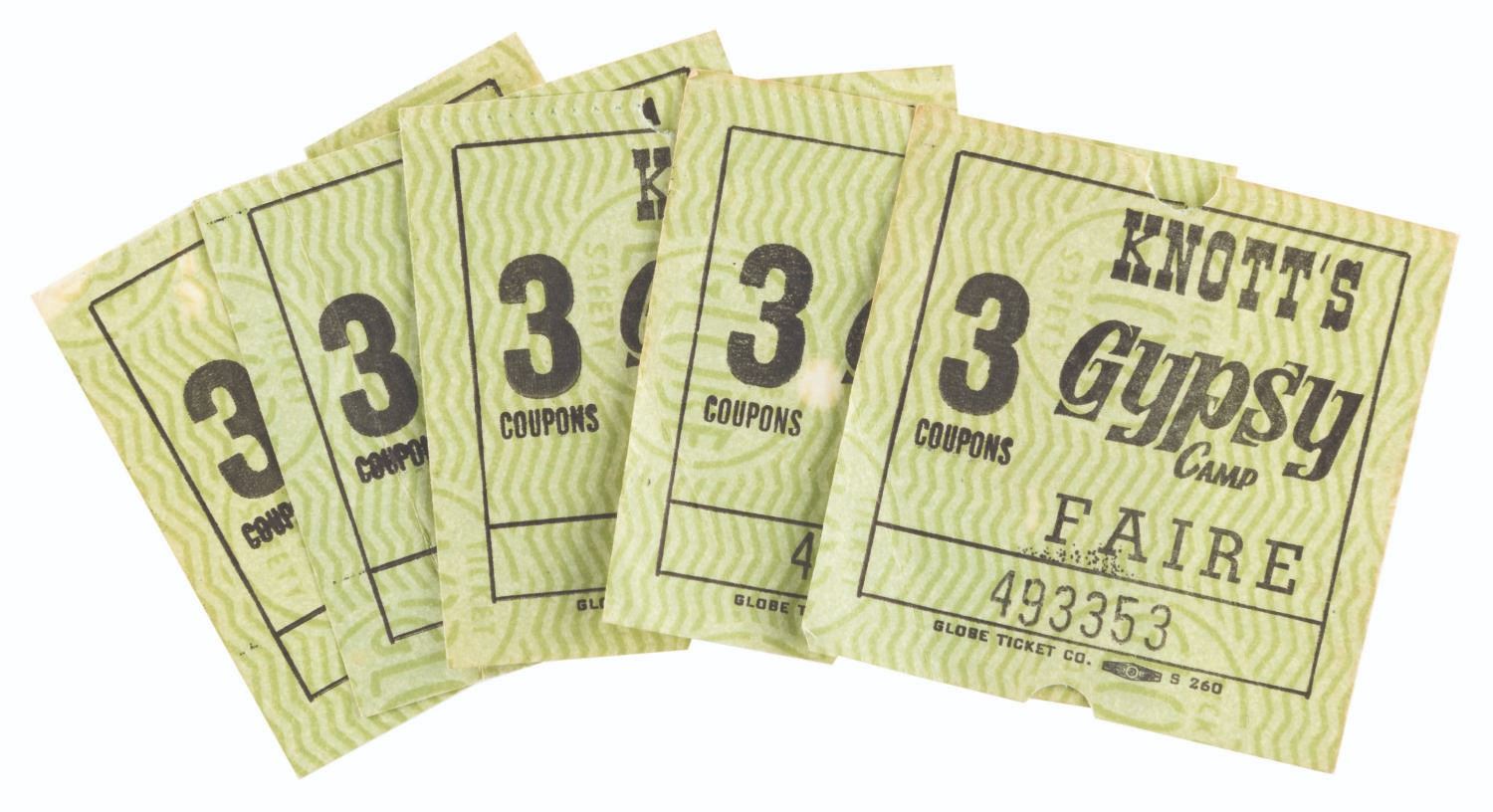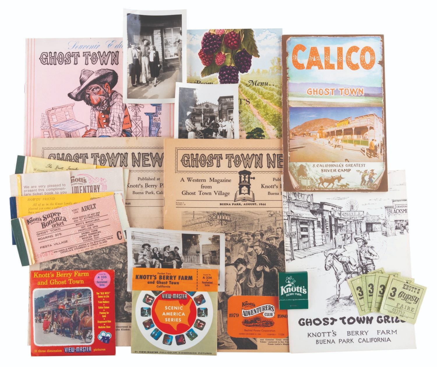 (Knott’s Berry Farm, 1940s-80s) A large collection of Knott’s Berry Farm memorabilia including three early issues of the Ghost Town News, a 1942 Tea Room menu, two 1956 View-Master packets, a 1959 Calico Ghost Town souvenir booklet, a 1960s era Ghost Town Grill menu, five loose coupons for the 1971 Gypsy Camp Faire, three 1970s partial ticket books and one partial complimentary admission book, a 1979-1980 Adventurer’s Club card, and a 1980s Snoopy matchbook. Also included are three very early photos of guests and performers in the Ghost Town. Measuring various standard sizes up to the 8.5” x 11” magazines, the collection is overall in very good condition, with wear to the Ghost Town News magazines from handling and age.