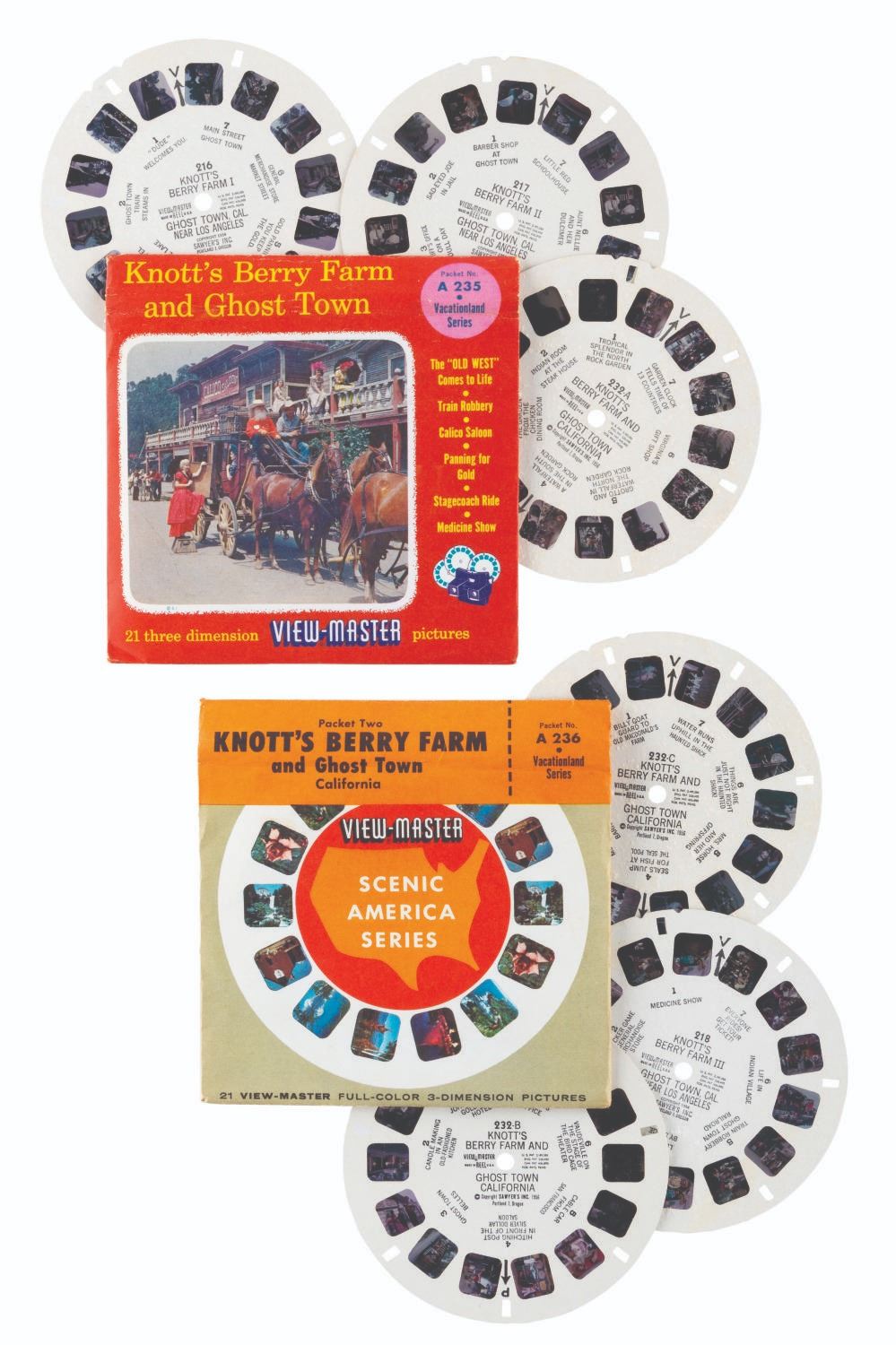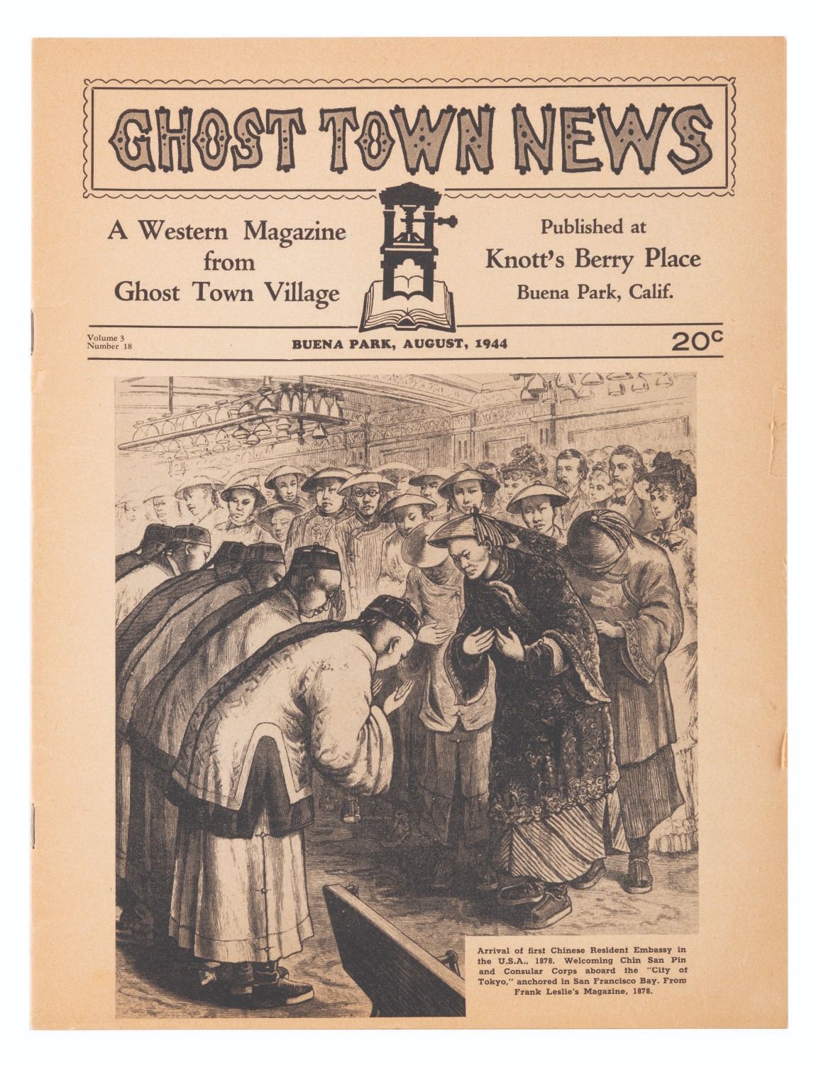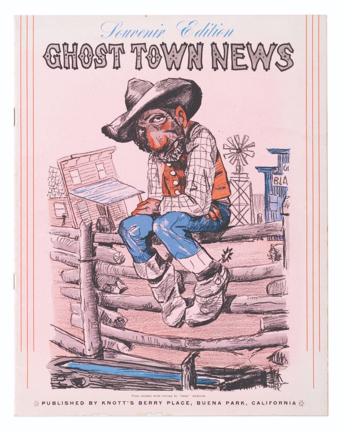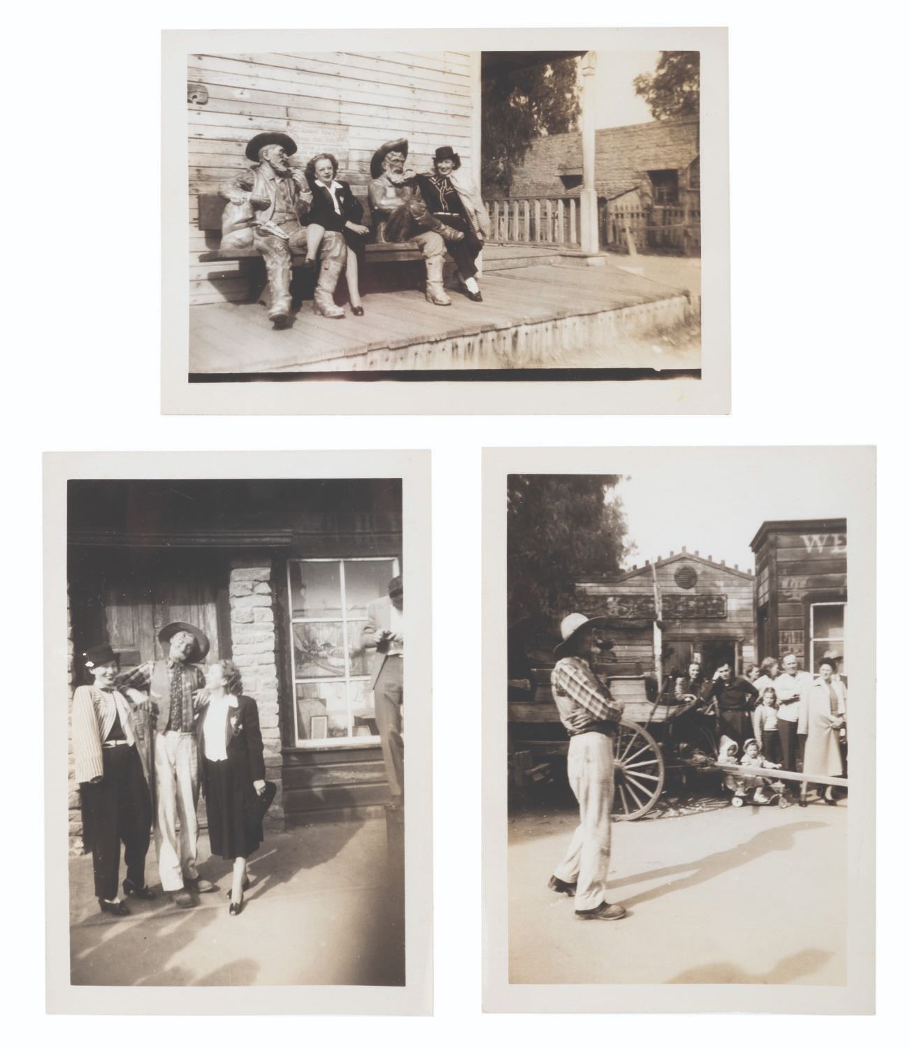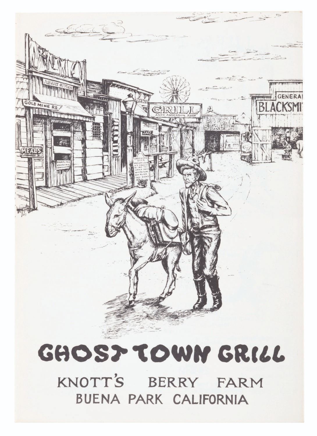 (Knott’s Berry Farm, 1940s-80s) A large collection of Knott’s Berry Farm memorabilia including three early issues of the Ghost Town News, a 1942 Tea Room menu, two 1956 View-Master packets, a 1959 Calico Ghost Town souvenir booklet, a 1960s era Ghost Town Grill menu, five loose coupons for the 1971 Gypsy Camp Faire, three 1970s partial ticket books and one partial complimentary admission book, a 1979-1980 Adventurer’s Club card, and a 1980s Snoopy matchbook. Also included are three very early photos of guests and performers in the Ghost Town. Measuring various standard sizes up to the 8.5” x 11” magazines, the collection is overall in very good condition, with wear to the Ghost Town News magazines from handling and age.