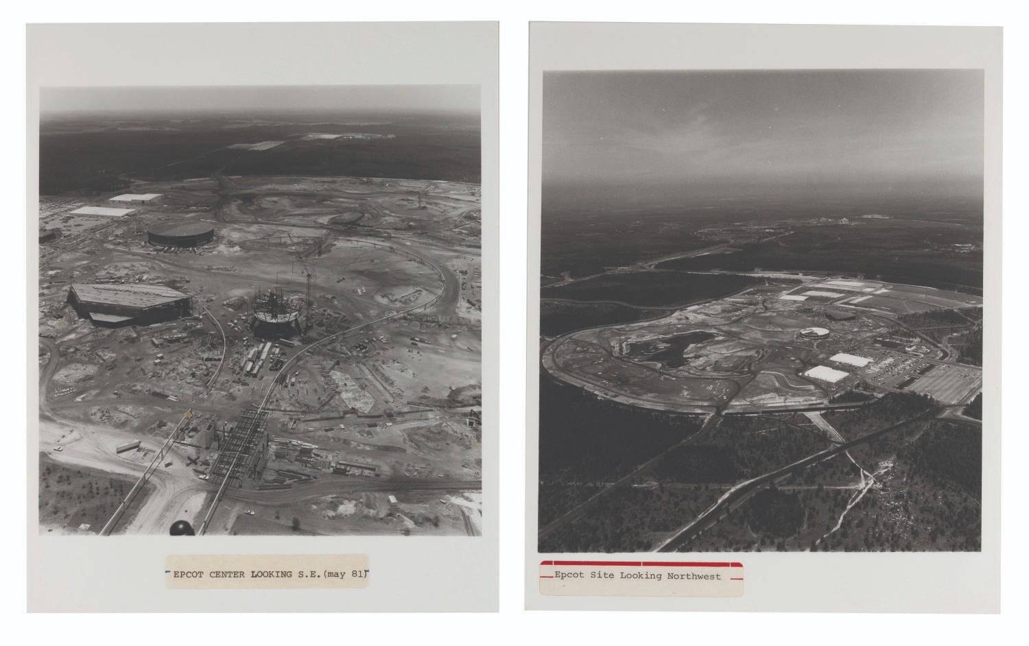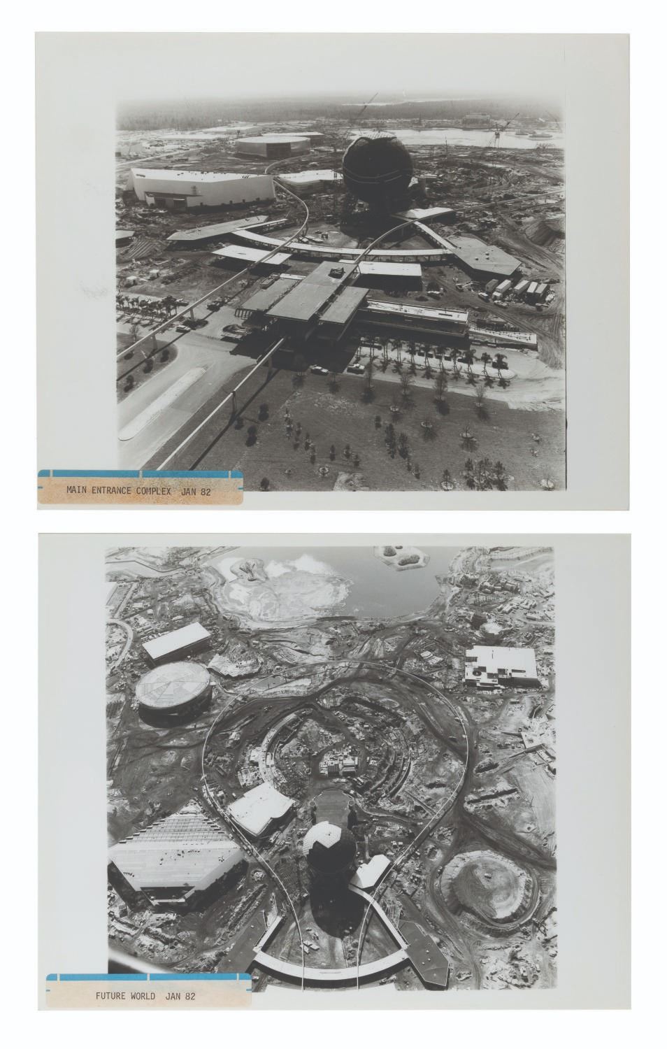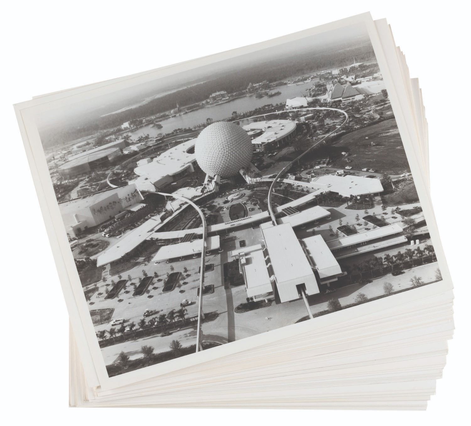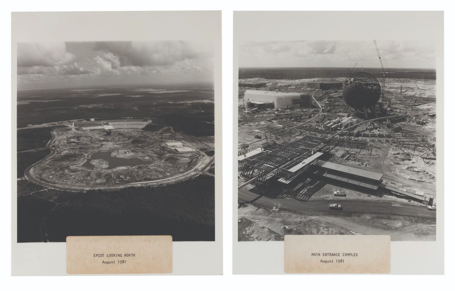 (EPCOT Center, 1980s) A large collection of fifty-nine black and white glossy photos chronicling construction of EPCOT Center. Measuring 8” x 10” each, the photos are in fine to very good condition with minor edge discoloration from age, several labeling stickers, and light wear.