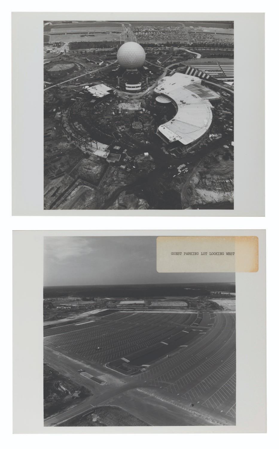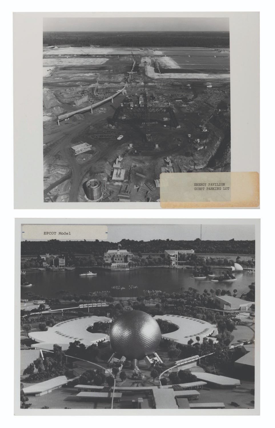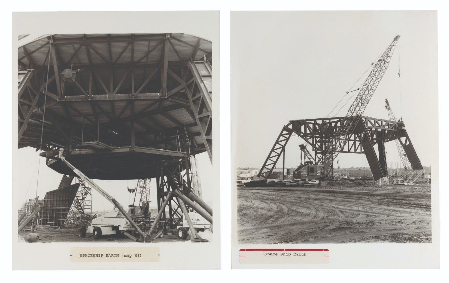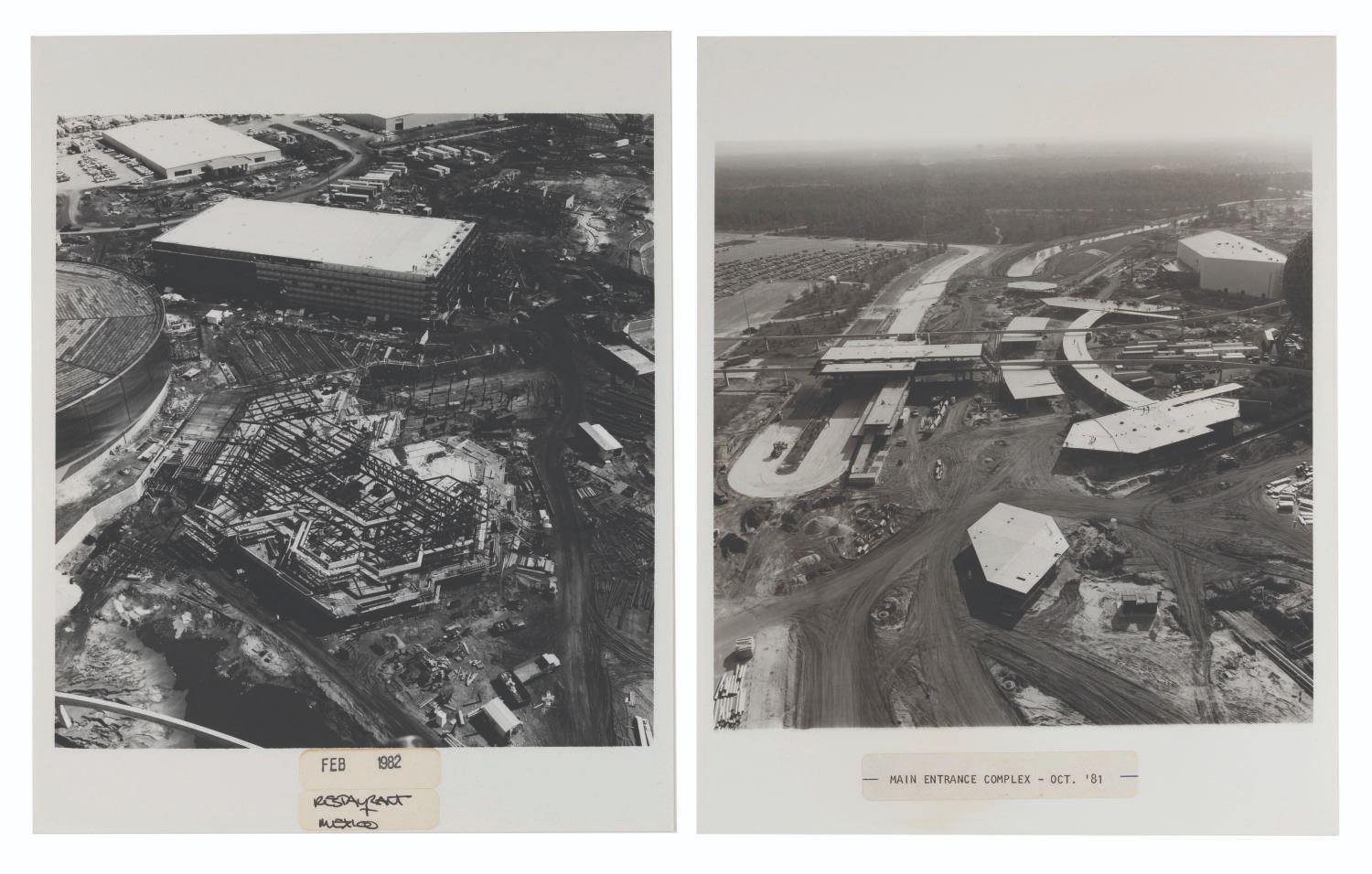 (EPCOT Center, 1980s) A large collection of fifty-nine black and white glossy photos chronicling construction of EPCOT Center. Measuring 8” x 10” each, the photos are in fine to very good condition with minor edge discoloration from age, several labeling stickers, and light wear.
