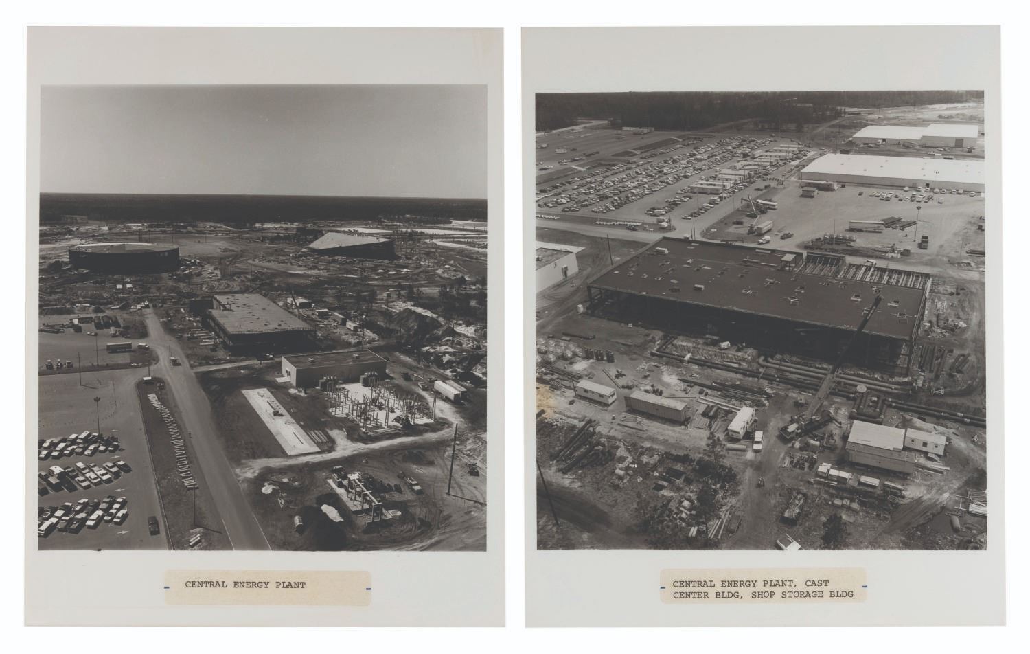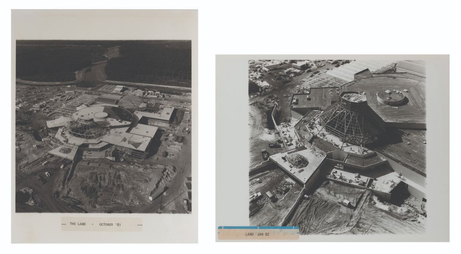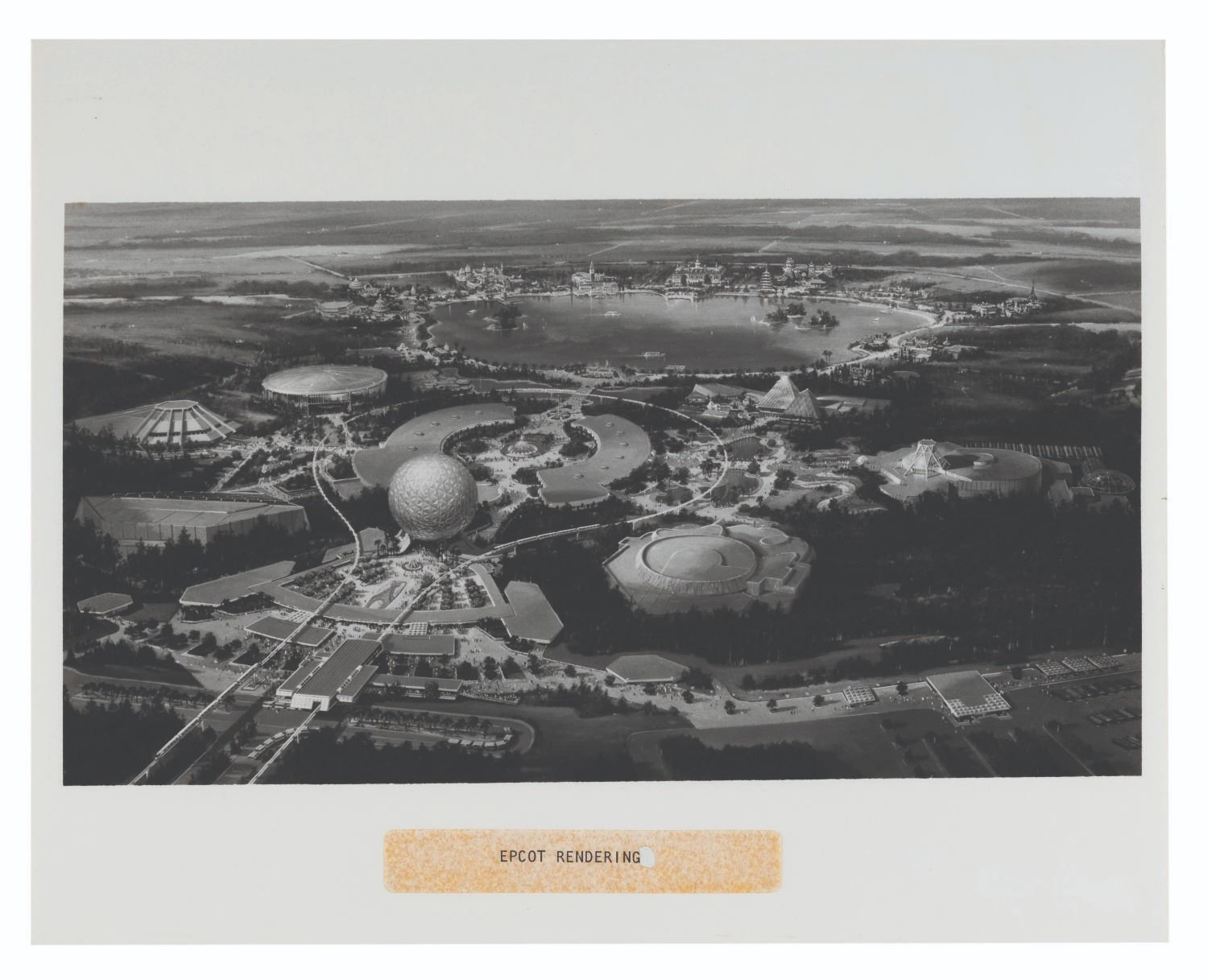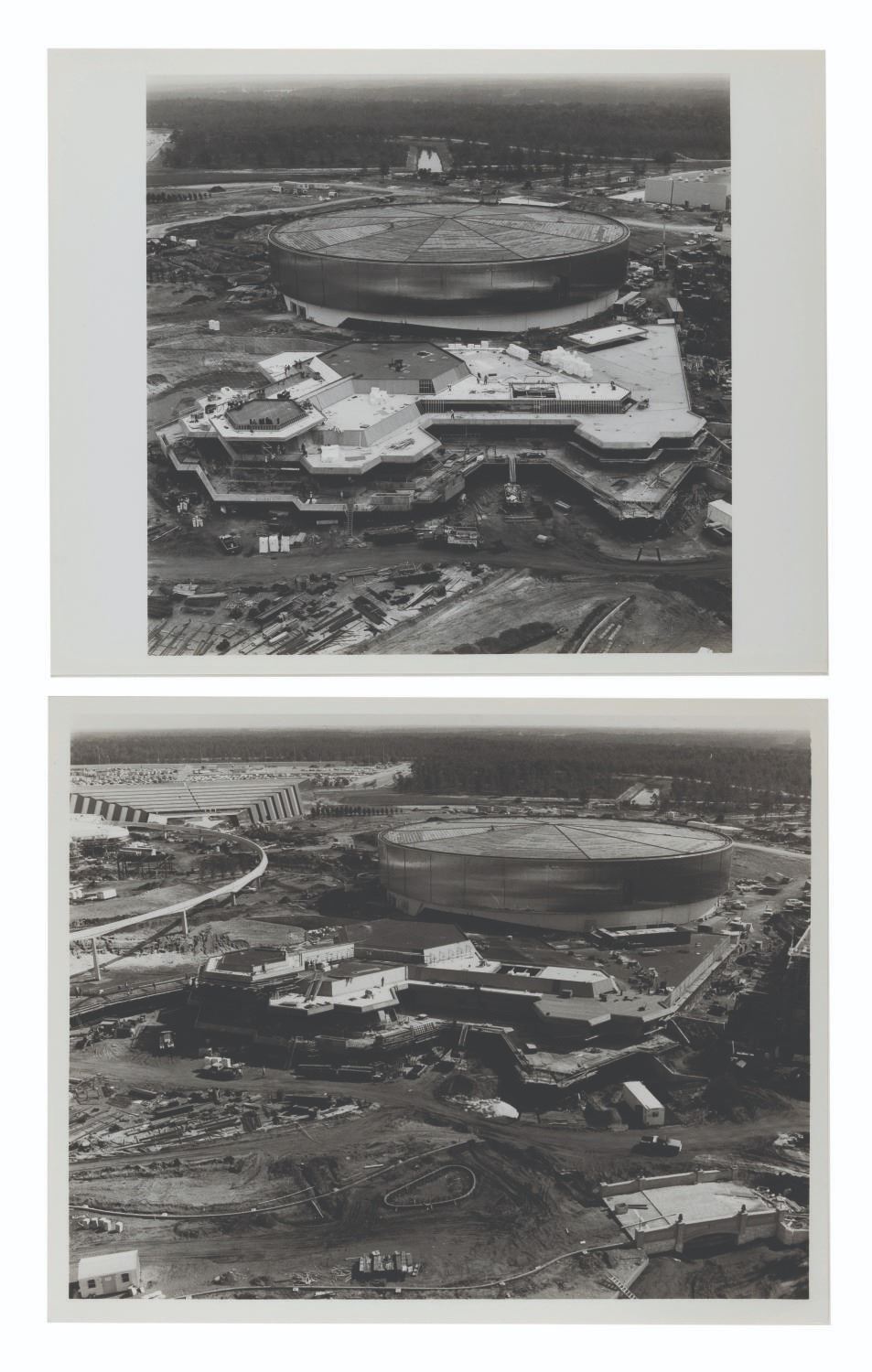 (EPCOT Center, 1980s) A large collection of fifty-nine black and white glossy photos chronicling construction of EPCOT Center. Measuring 8” x 10” each, the photos are in fine to very good condition with minor edge discoloration from age, several labeling stickers, and light wear.