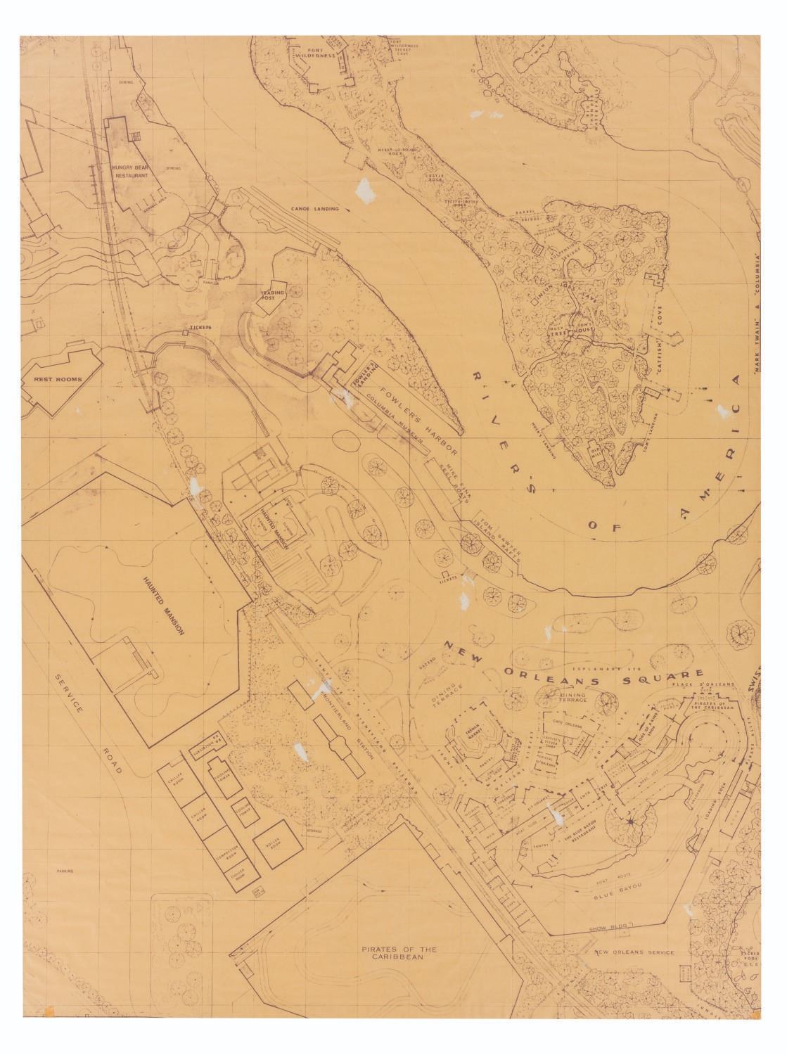 (Disneyland, 1970s) A Large New Orleans Square Site Plan Section. Measuring 48"x36.25", this massive blueprint section does not contain an architectural title block and depicts New Orleans Square including Backstage Areas hidden behind the periphery Frontierland Station, part of the Rivers of America fronting The Haunted Mansion, and part of Bear Country. This print is in good condition, exhibiting some tears to surface, creases and wear from handling and age.