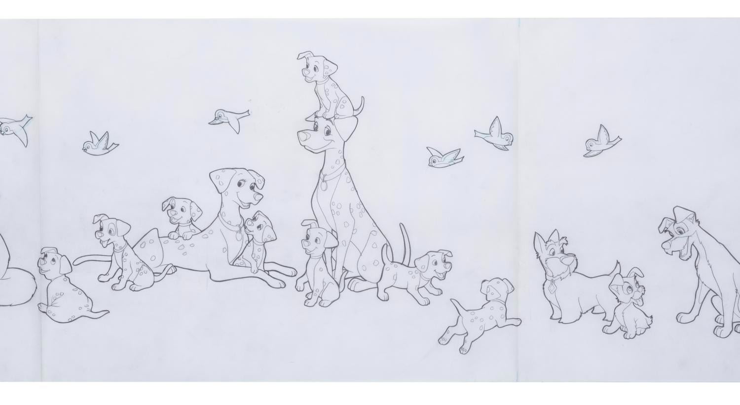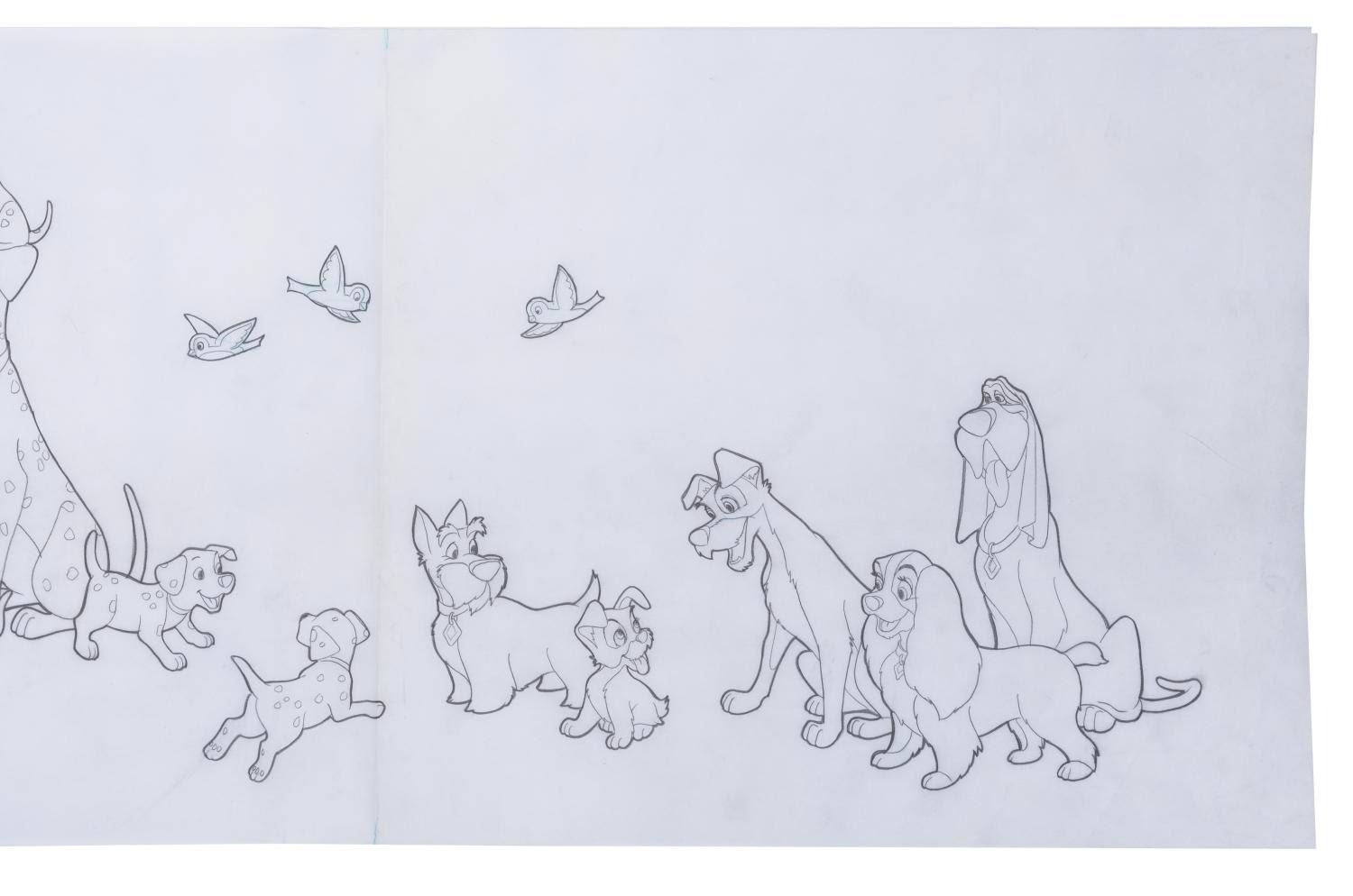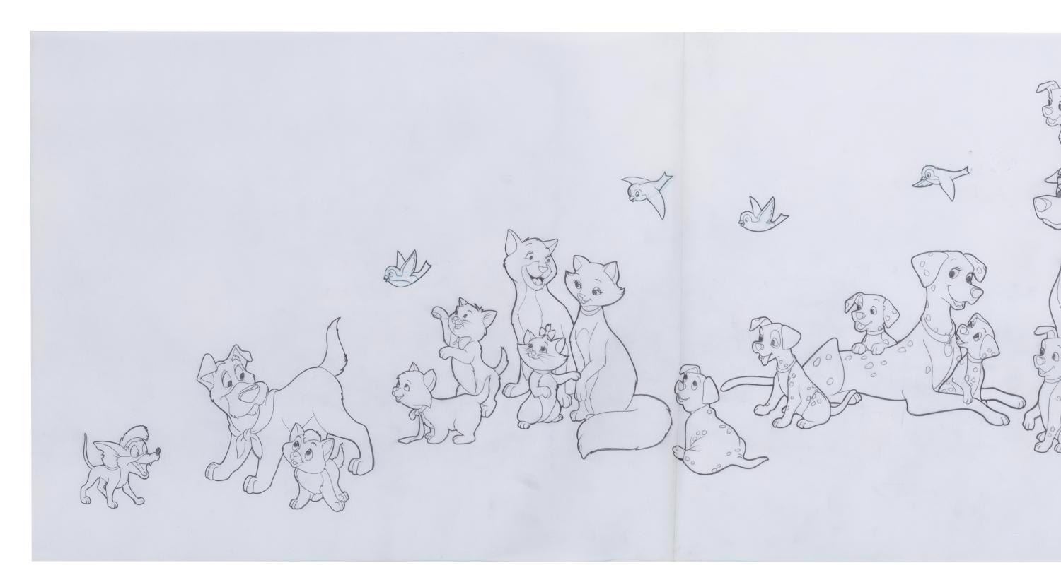 (Disney, 1980s-90s) A large pan drawing of Disney cats and dogs, likely used for merchandising. Included are characters from “Oliver & Company,” “The Aristocats,” “101 Dalmatians,” and “Lady and the Tramp.” Measuring 17” x 63”, the graphite and colored pencil art on vellum is in very good condition with light creases.