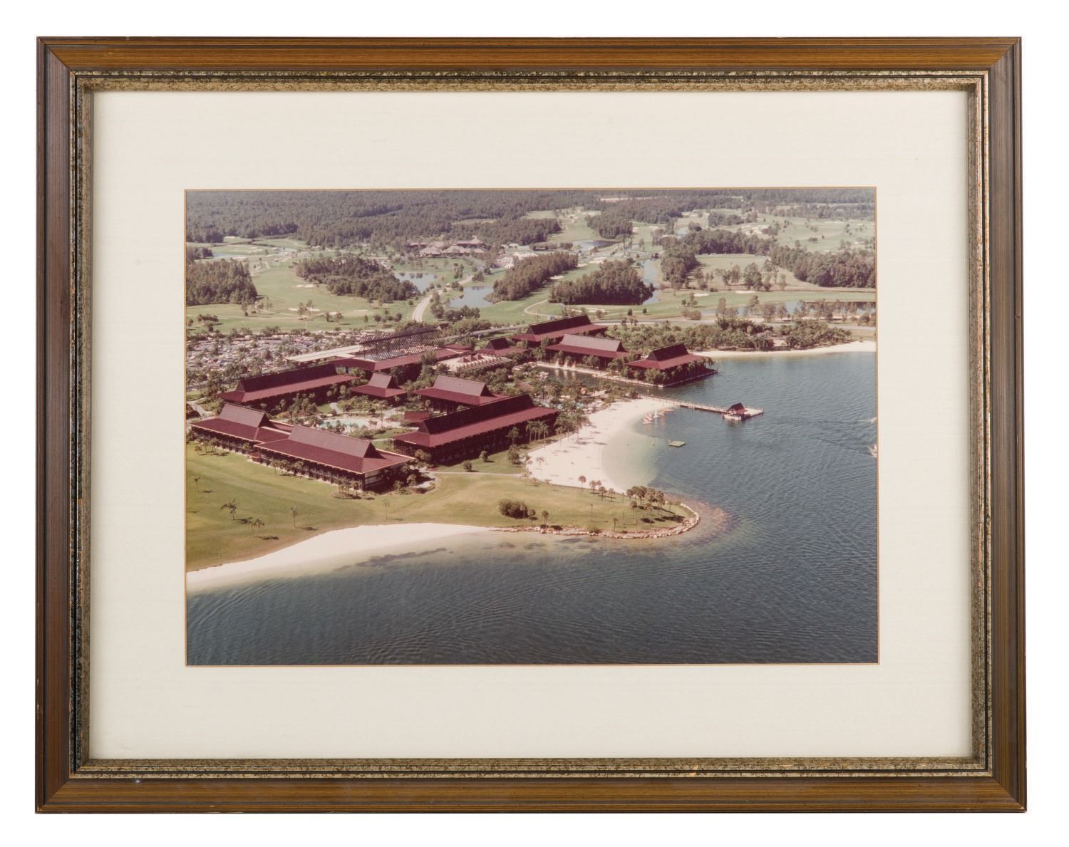 (Walt Disney World, 1970S) A large aerial photo of the Polynesian Village Resort at Walt Disney World Vacation Kingdom. Among the landmarks seen are the Marina, longhouses, and Great Ceremonial House along sandy beaches. The vintage framed print was once displayed on Resort property. The piece has a viewable image size of 13.25"x19.25", has been matted within a 21.75"x27.5" frame, and displays in fine condition, despite slight fading.