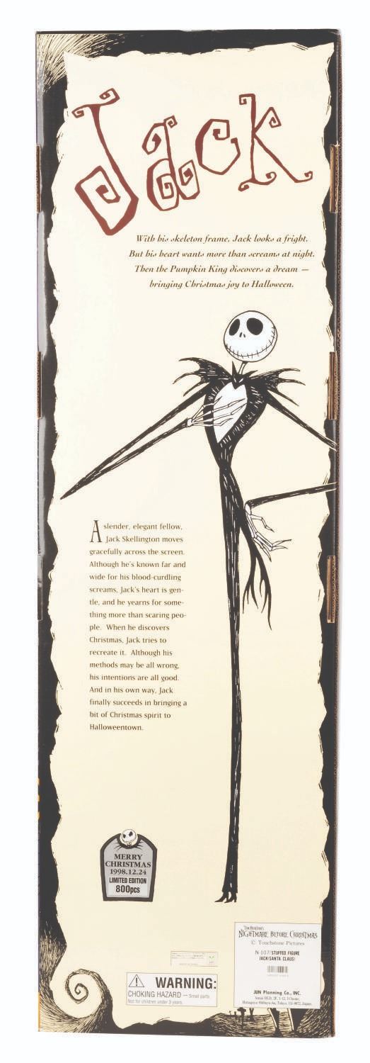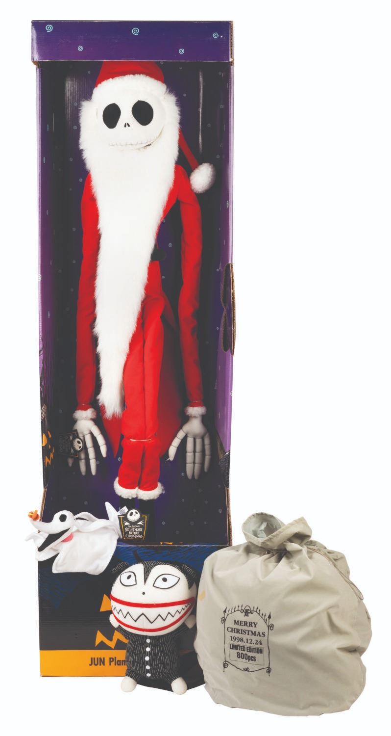 (JUN Planning, 1998) A large plush doll of Santa Jack Skellington from “Tim Burton’s The Nightmare Before Christmas.” Released in a limited edition of 800, the doll measures 12” x 6” x 52” high and is in fine condition, still in the original 14.5” x 11.25” x 47.5” very good condition box with light creases. Included are a good condition cloth gift sack measuring 14” x 7” x 21” with four small stains each under 1.25”, a 9.5” fine condition Vampire Teddy plush, and an 11” fine condition plush of Jack’s dog, Zero. Due to size and weight, this item requires special shipping arrangements. Please inquire before bidding.