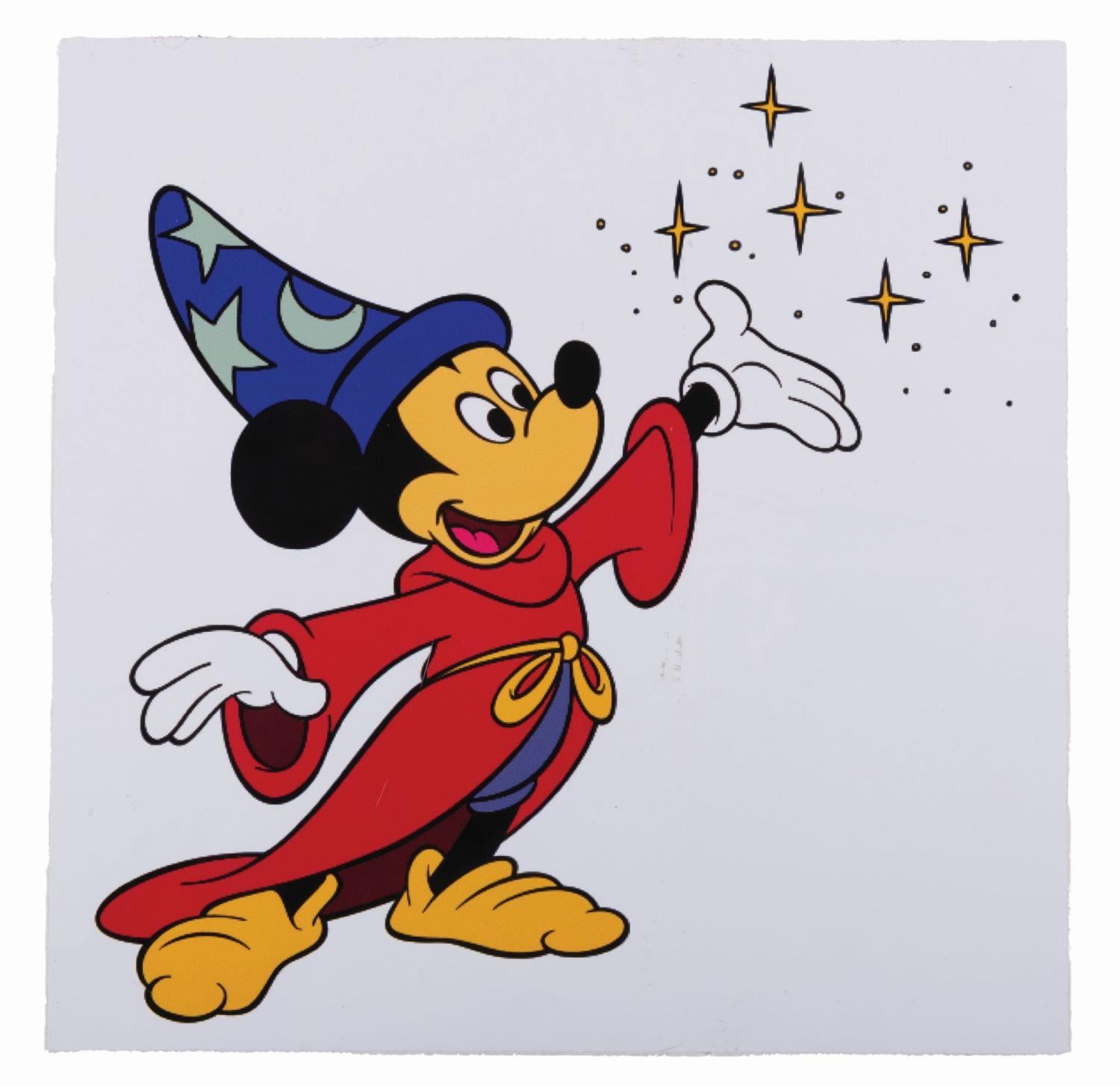 (Disney, 1990s) A large decal of Mickey as the Sorcerer's Apprentice. Measuring 12" x 12" the low resolution decal is in good condition with folds, smudges and dirt around the edges.
