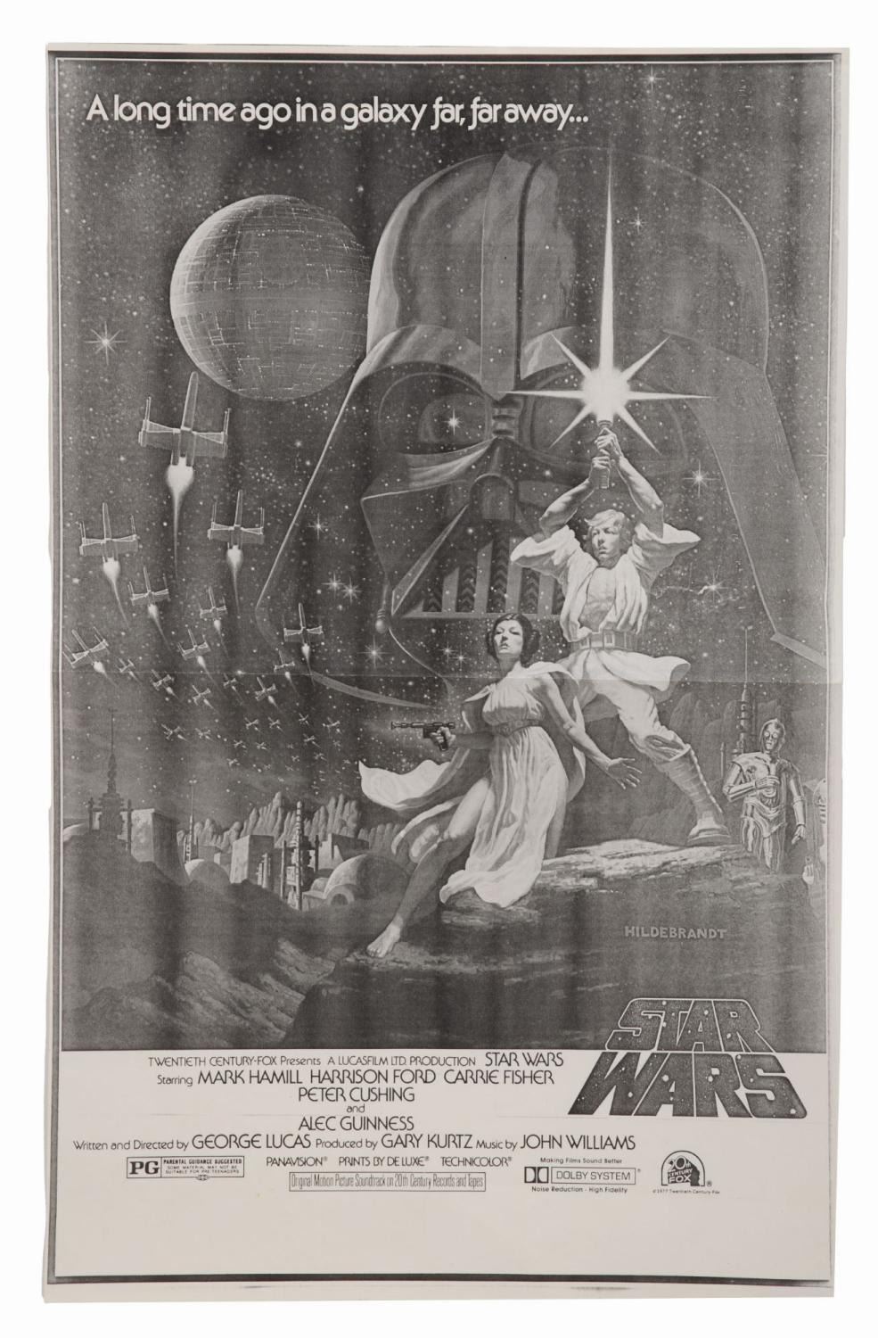 (20th Century Fox, 1977) A black and white oversized photocopy of a Hildebrandt art ad for "Star Wars." Printed on a blueprint machine, this was most likely used for layout purposes. Measuring 14" x 22", the copy is in very good condition.