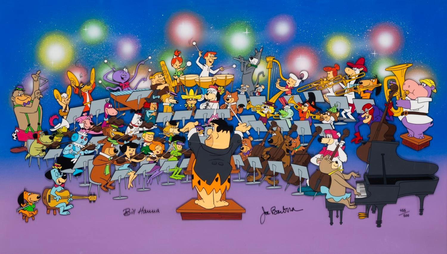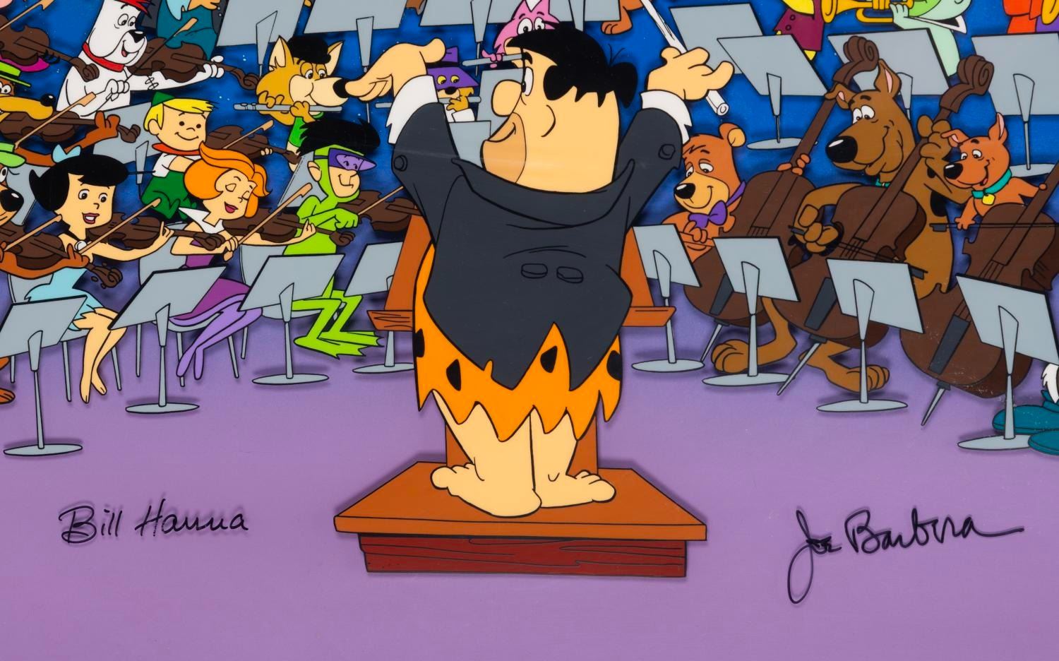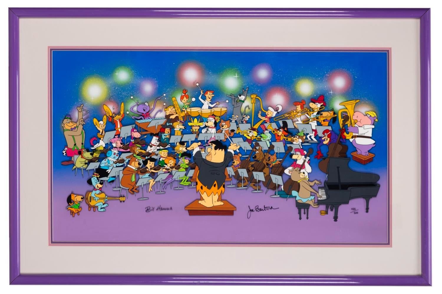 (Hanna-Barbera, 1989) A hand-painted limited edition cel titled "Symphony of the Stars" of an orchestra of 48 Hanna Barbera characters with Fred Flintstone conducting, signed by William Hanna and Joseph Barbera. Numbered 455/500, the art has an image size of 22" x 38" within the 32.5" x 48.5" frame. The piece is in fine condition with very light wear to the frame from display.