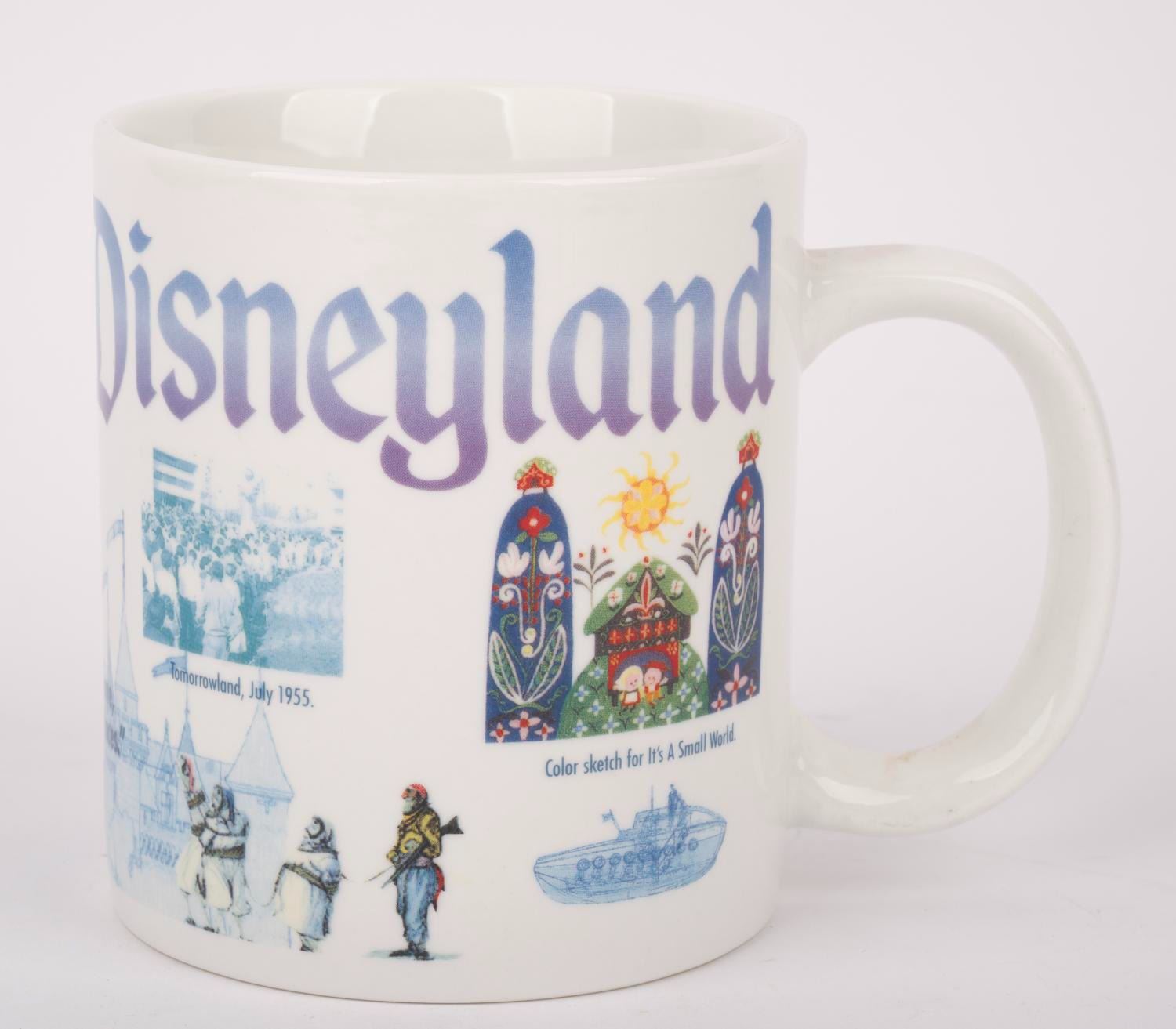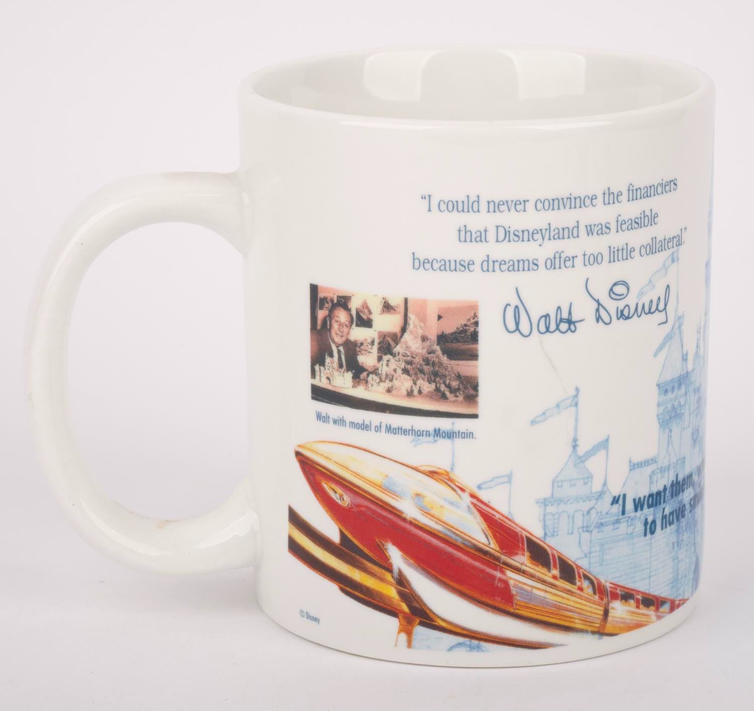 (Disneyland, 2000s) A large coffee mug with quotes and concepts of Disney Attractions. In fine unused condition.