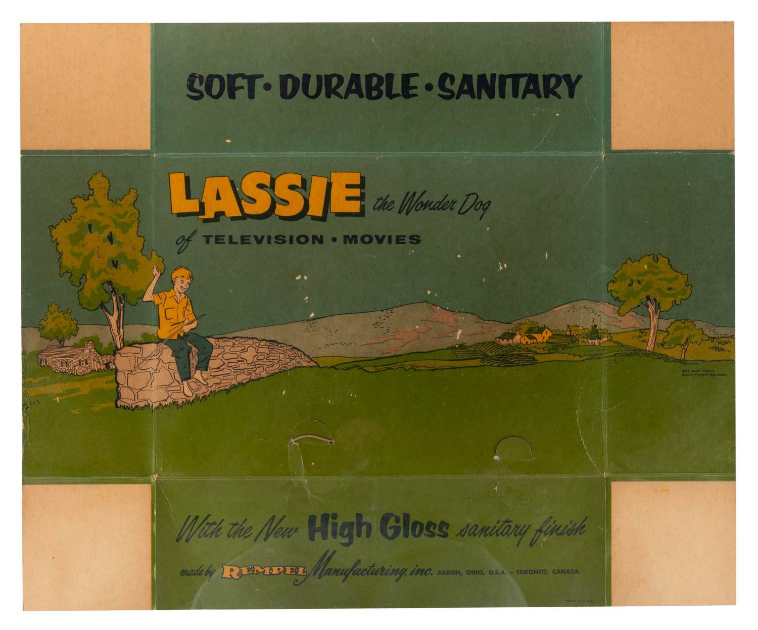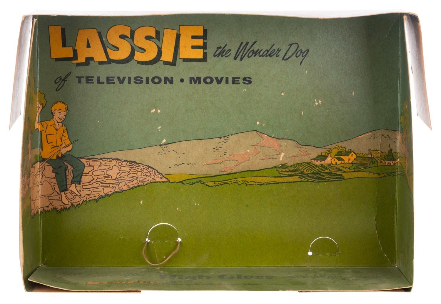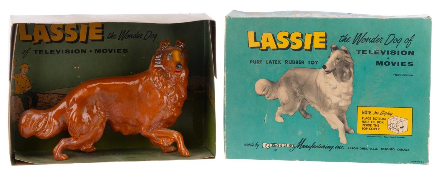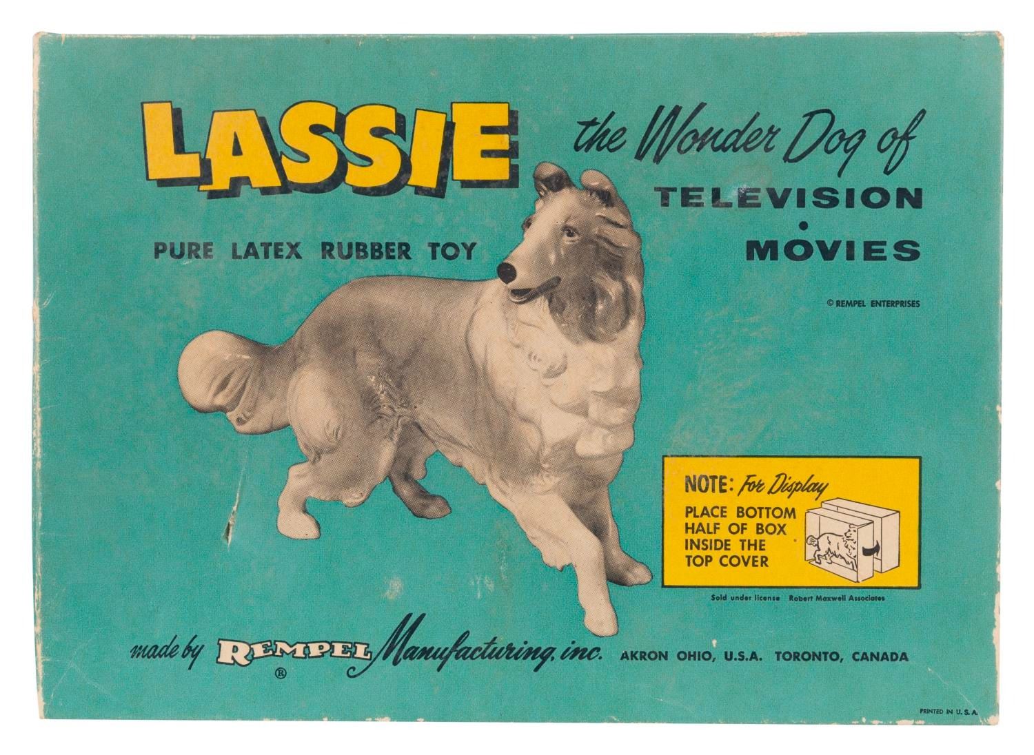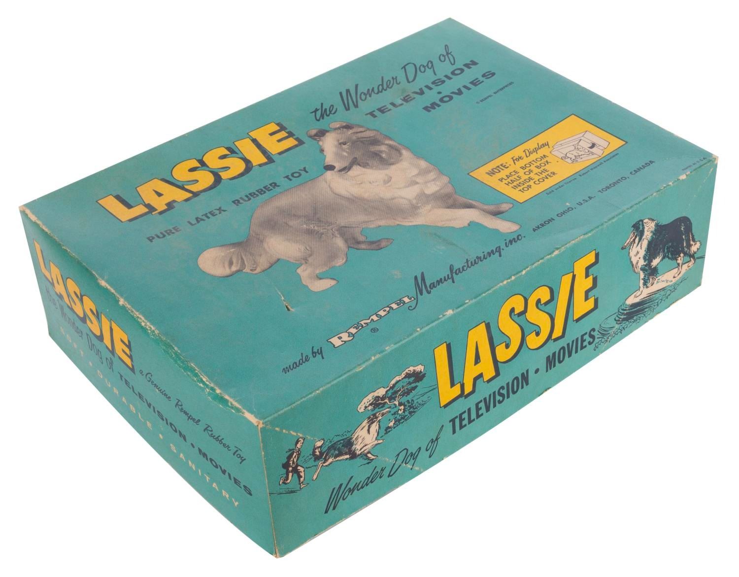 (Rempel, 1955) A Lassie latex toy figure with the rare original display box. Originally flexible, with age the figure has become quite firm. Measuring 12” x 4” x 7.5” tall, the figure displays in very good condition with small scuffs to the back. The 4” x 9.25” x 13” box is in good condition with typical wear from age and handling, with some discoloration, and a 0.25” hole in the front.