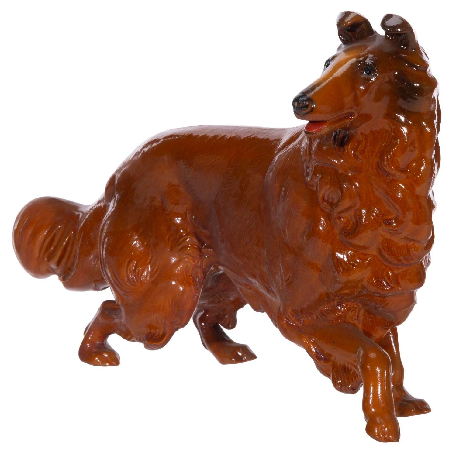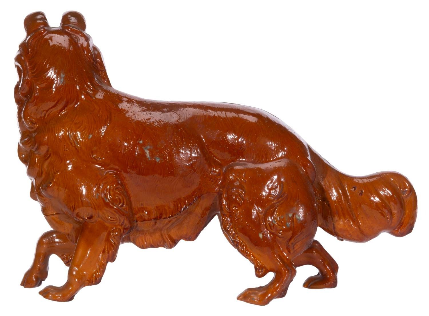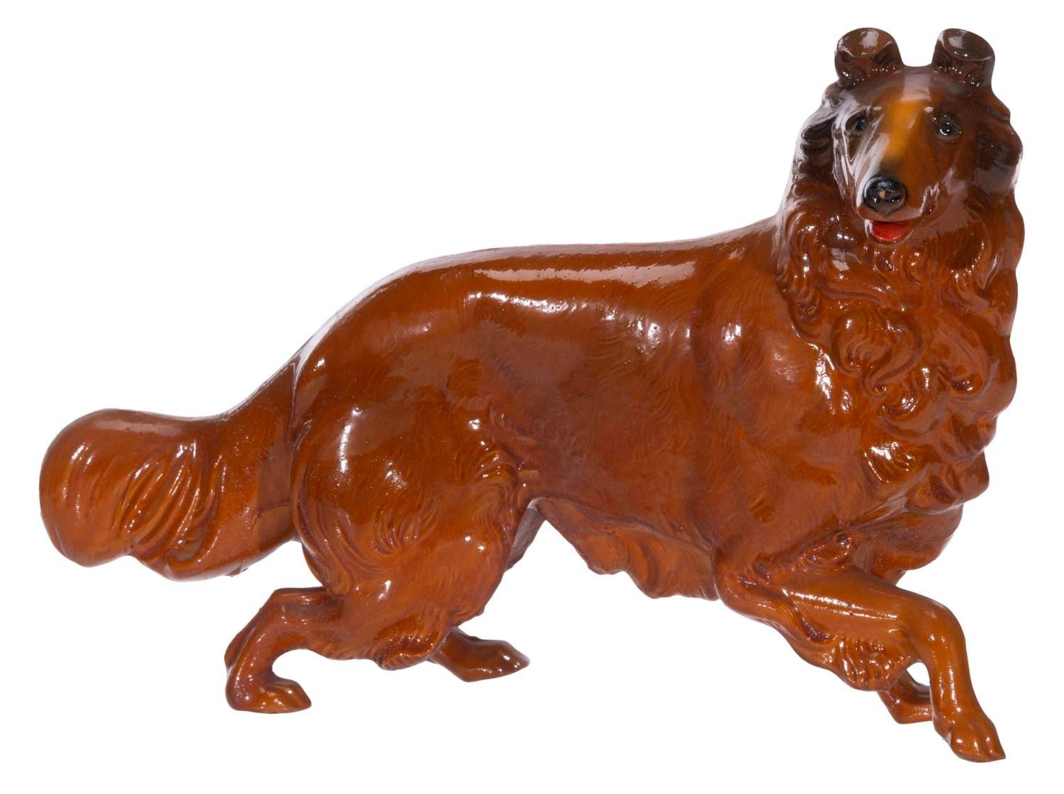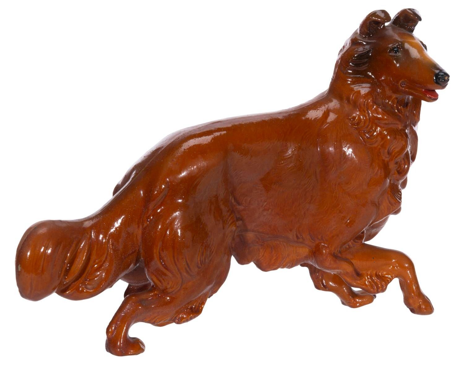 (Rempel, 1955) A Lassie latex toy figure with the rare original display box. Originally flexible, with age the figure has become quite firm. Measuring 12” x 4” x 7.5” tall, the figure displays in very good condition with small scuffs to the back. The 4” x 9.25” x 13” box is in good condition with typical wear from age and handling, with some discoloration, and a 0.25” hole in the front.