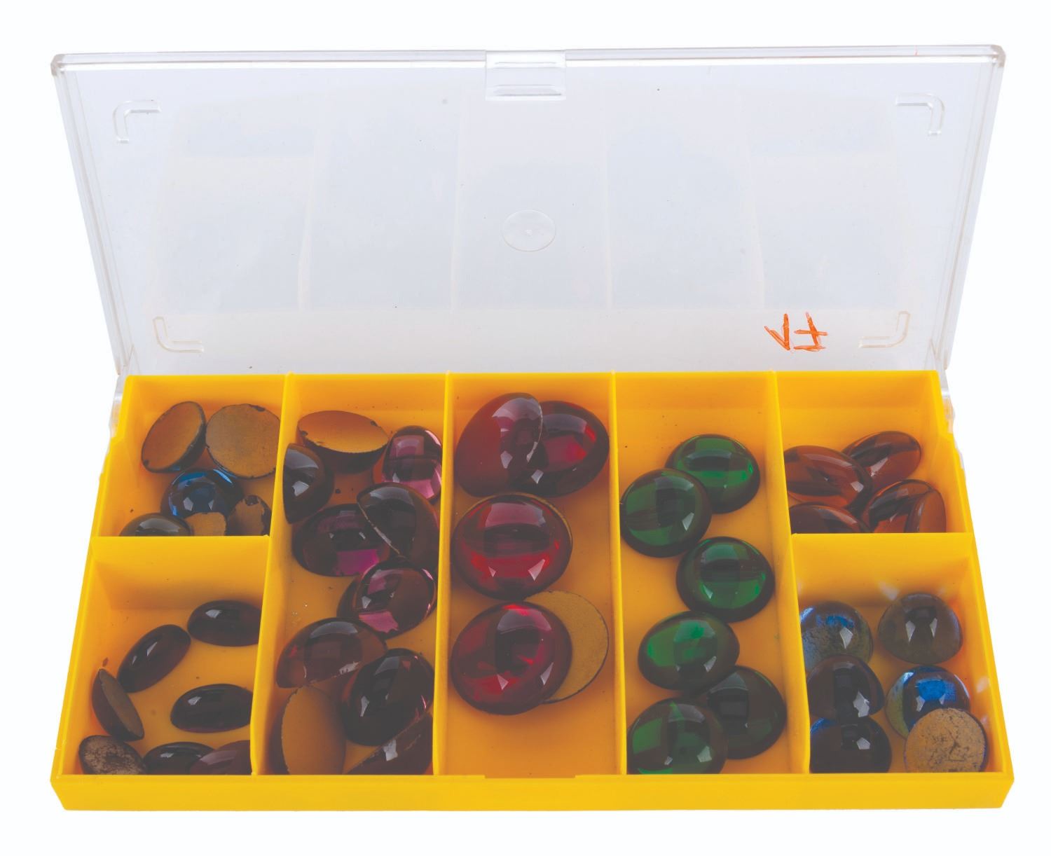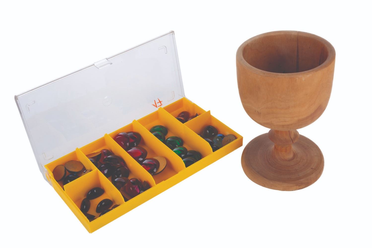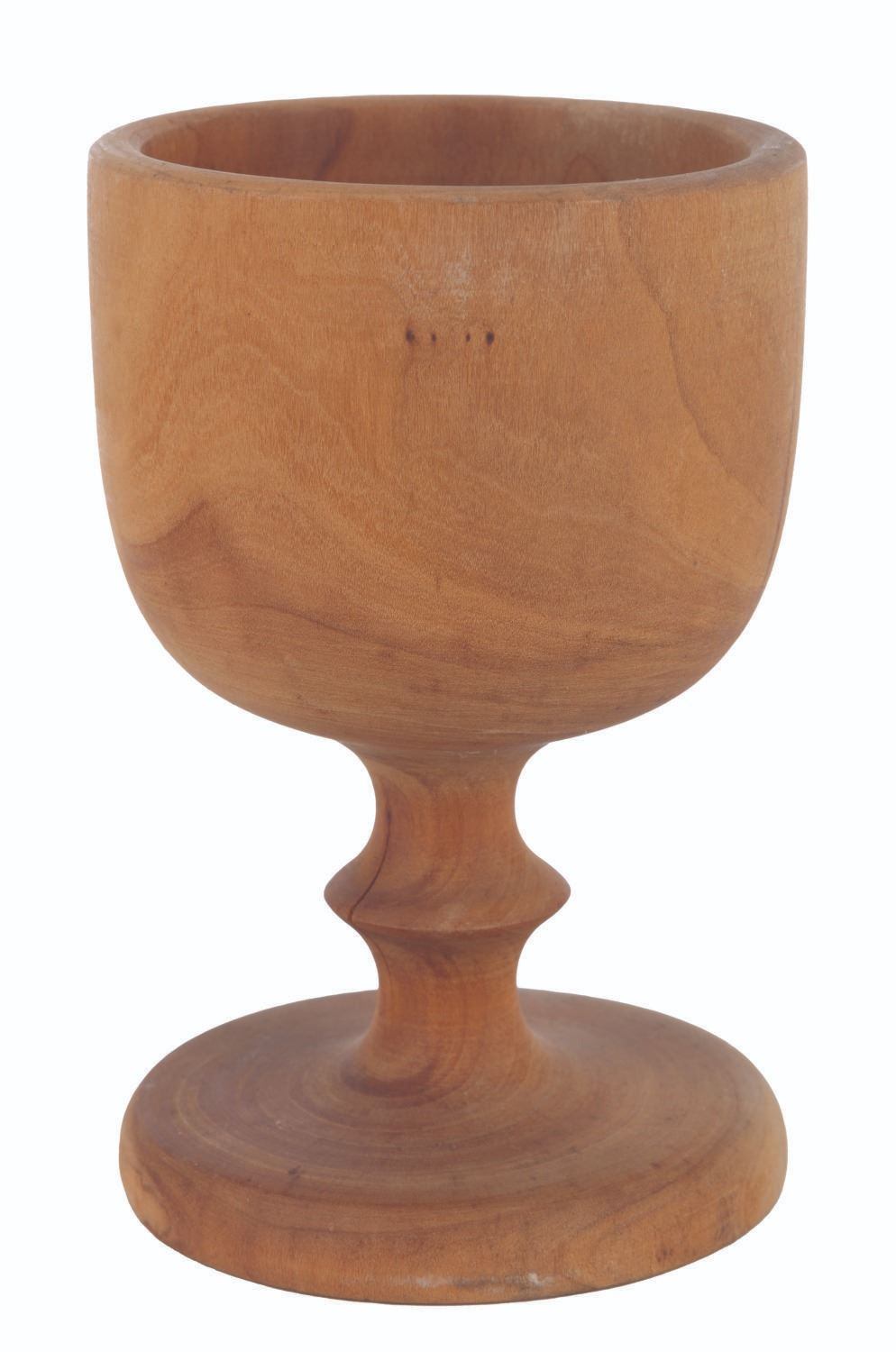 (Paramount, 1989) A wooden protype false grail with decorative jewels, from Indiana Jones and the Last Crusade. Early in production there was a struggle to find all the right"false grails" for the table of grails guarded by the Knight Templar. In the end, some were made from scratch of fiberglass, and others were bought or rented from antique dealers. This early, simple draft wooden goblet was meant as a base to create a false grail. The intention was to add filigree details by hand in clay, insert glass jewels, and paint it. The wooden grail comes with a case of (47) vintage glass beads intended for decoration, some of which match jewels seen on other false grails in the film. The 3.5" diameter by 5.5" high wooden grail and glass beads of various sizes are in very good condition.