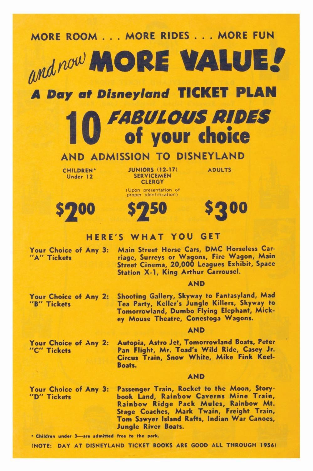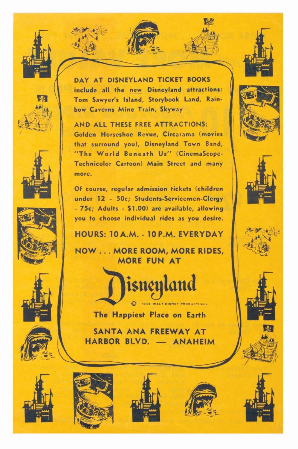 (Disneyland, 1956) A very rare Disneyland Main Gate Flyer for a 10-ride ticket book to Disneyland. The flyer lists the A, B, and C and new "D" ticket attractions available to choose from, including the Rainbow Caverns Mine Train. Measuring 5.5" x 8.5", the two-sided flyer is in fine condition with very light handling wear.