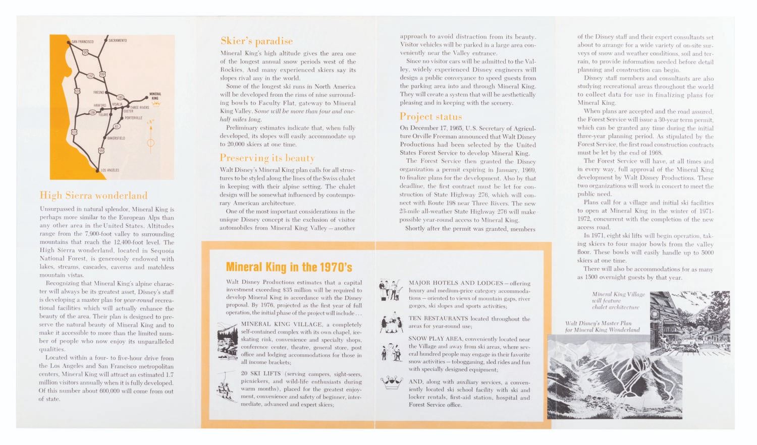 (Disneyland, 1967-70) A Disney University folder of rare brochures on Disney Developments in the years after Walt's death. Included are a 1967 brochure on Mineral King, the planned Sequoia National Park ski resort; a biography of Walt Disney; a 1969 pre-construction Walt Disney World booklet, and a 1969 Orlando tourism booklet that anticipates Walt Disney World's arrival, outlining everything the city already has to offer. Measuring 9.5" x 11.5" overall, the folder is in fair condition with much edge wear and discoloration from age, and the contents all in very good condition with light wear from age.