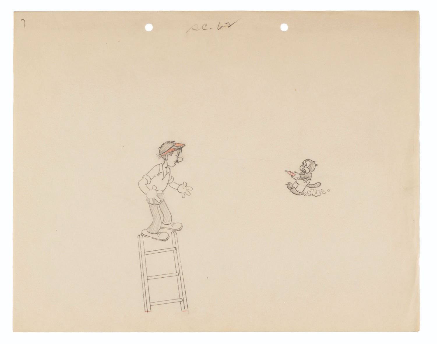 (Schlesinger, 1935) A layout drawing featuring Beans and the Cartoonist from “A Cartoonist’s Nightmare.” With character image sizes of 1.25” x 1.25” and 1.75” x 5” on 9.5” x 12” animation paper, the graphite and colored pencil drawing is in very good condition with light creases and discoloration from age.