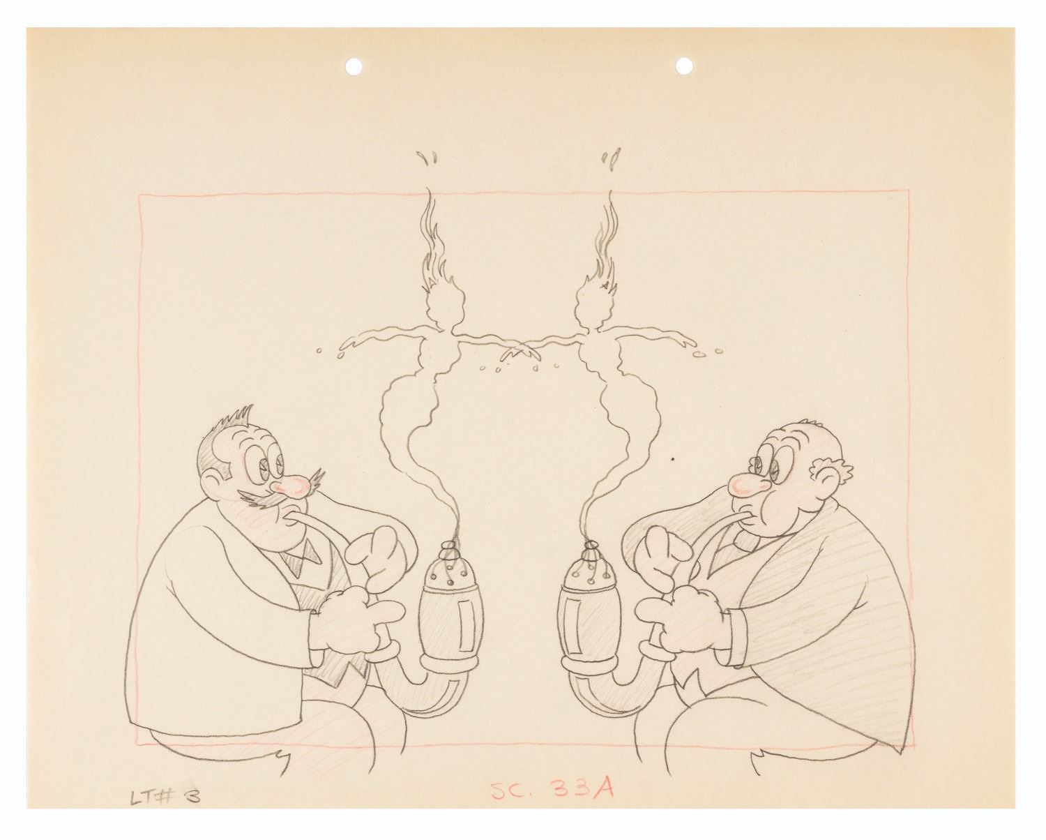 (Schlesinger, 1933) An original layout drawing from the Looney Tunes short “Buddy’s Beer Garden.” With an image size of 7.75” x 9.5” on 9.5” x 12” animation paper, the graphite and colored pencil drawing is in very good condition with light wear.