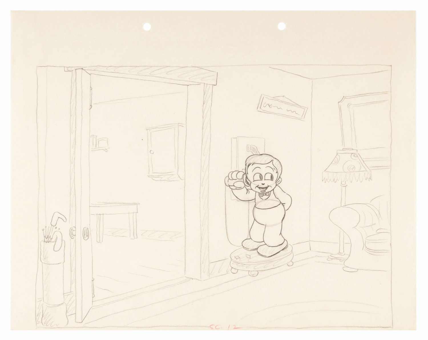 (Schlesinger, 1934) A layout drawing of Buddy on the telephone from “Buddy the Dentist.” With an image size of 7.75” x 10.5” on 9.5” x 12” animation paper, the drawing accomplished in graphite and red pencil is in very good condition with very light wear from production use.