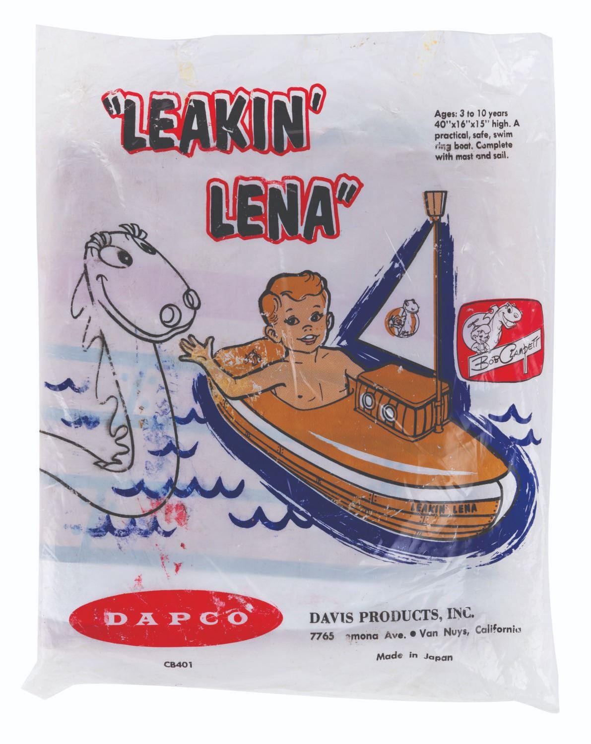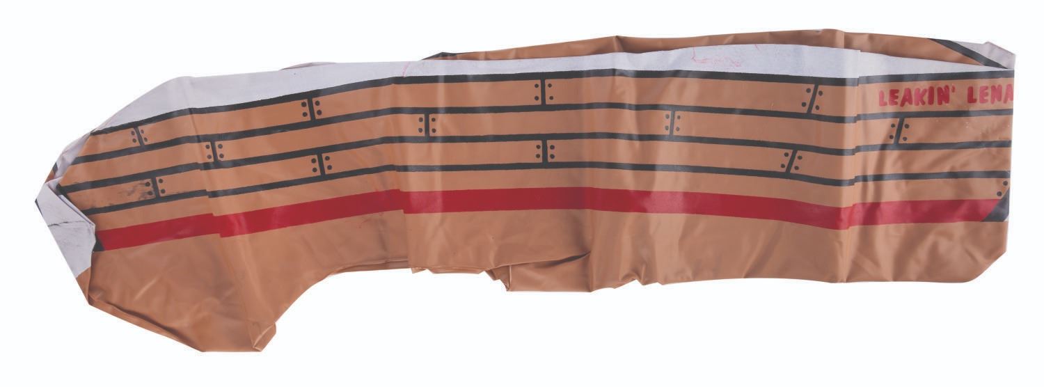 (Dapco, 1950s-60s) A production sample Leakin’ Lena pool floatie. The inflatable Beany and Cecil boat includes a detached sail featuring the iconic duo, a two-part mast rod, and a crow’s nest. It has not been tested for inflation. Measuring 40” x 16” x 15” tall, the pool toy is in very good condition with light paint loss, creases, and stains.