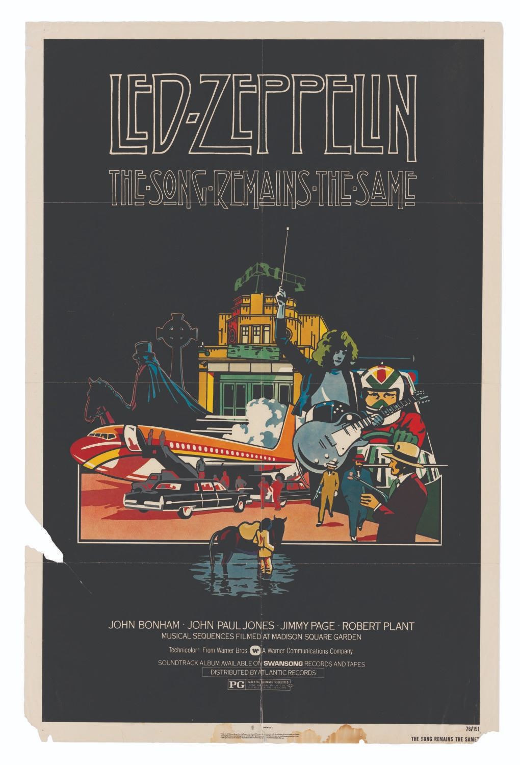 (Warner Bros., 1976) A one-sheet for the Led Zeppelin concert film "The Song Remains the Same.” Measuring 27” x 41”, the poster displays in fair condition with wear along the original folds, creases, water damage, and edge wear and tears, with the bottom two corners missing and a 2.5" x 3" section missing on the left side.
