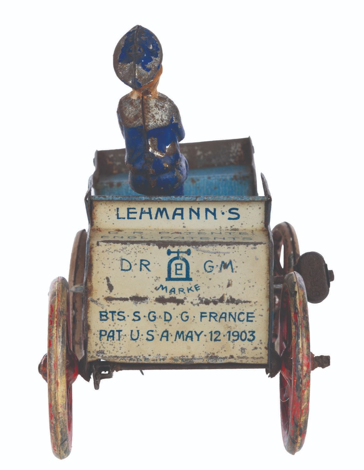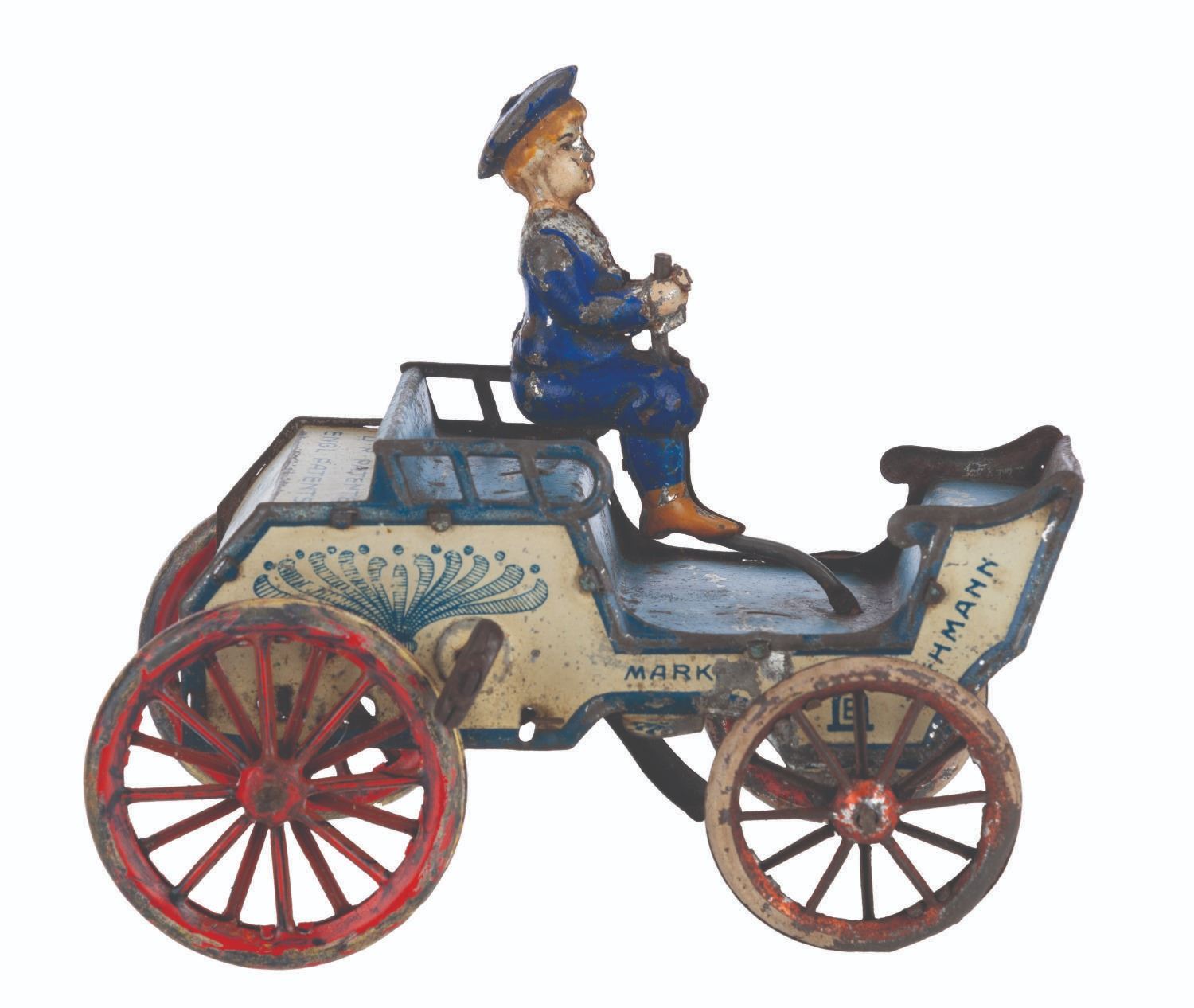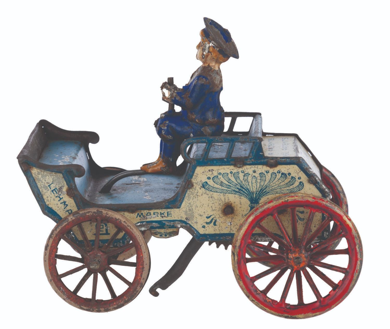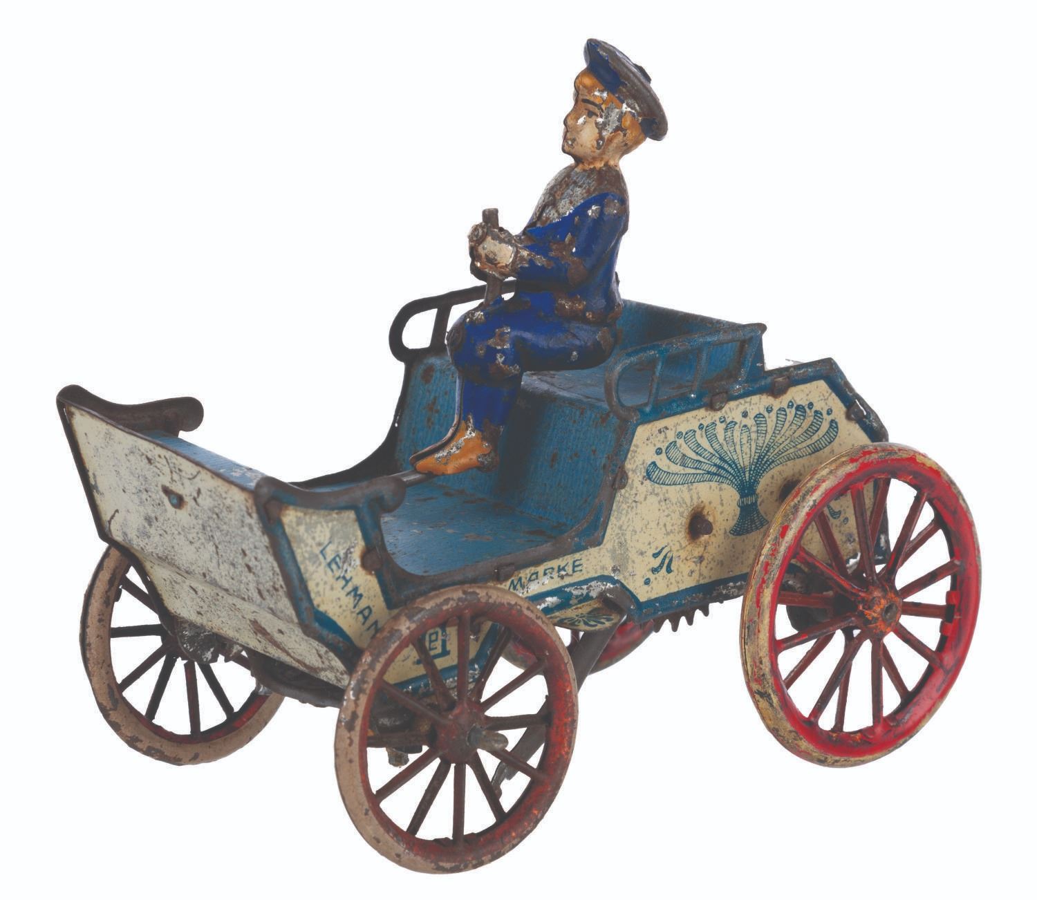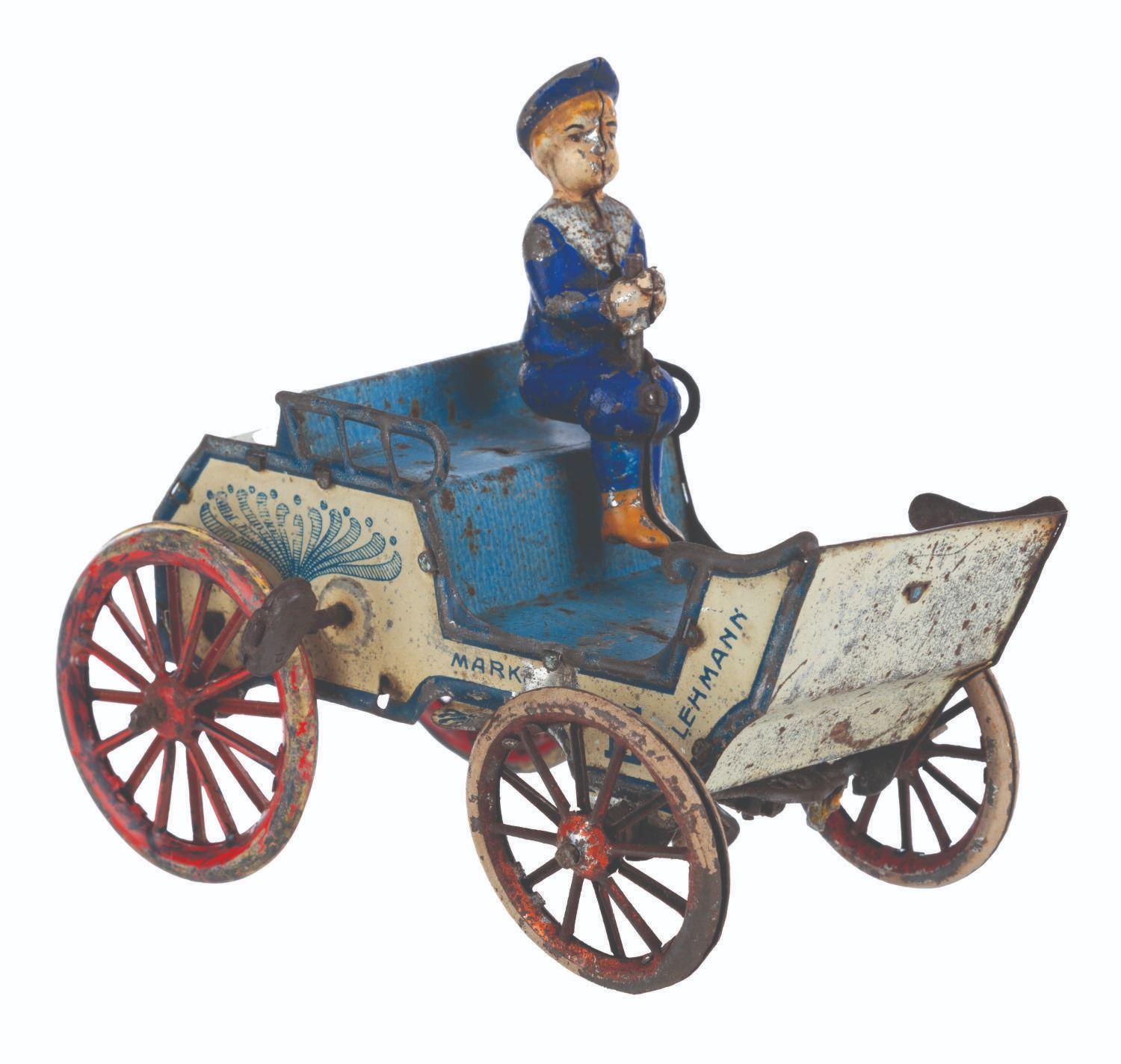 (Lehmann, 1900s-1930s) A Lehmann Naughty Boy wind-up tin litho coach. When wound, the naughty boy interferes with his father’s attempts to steer the coach. The boy’s father is not included with this toy, which has been tested and is not in working condition. Measuring 3” x 5.25” x 4.5” tall, the toy is in fair condition with heavy paint loss, oxidation, scuffs, misaligned wheels, and wear from age.