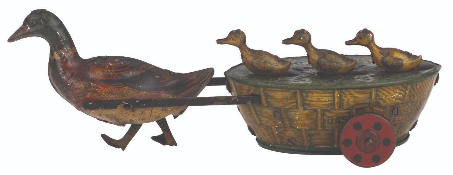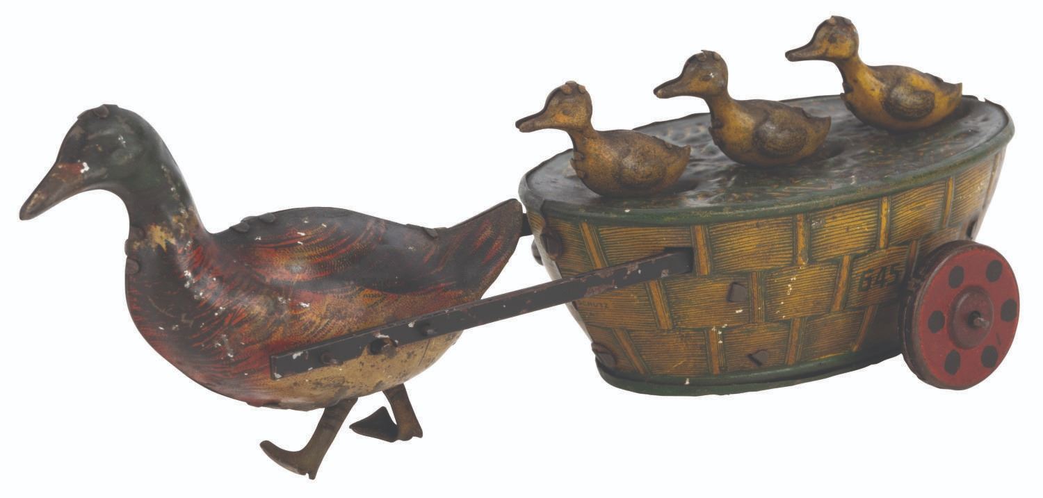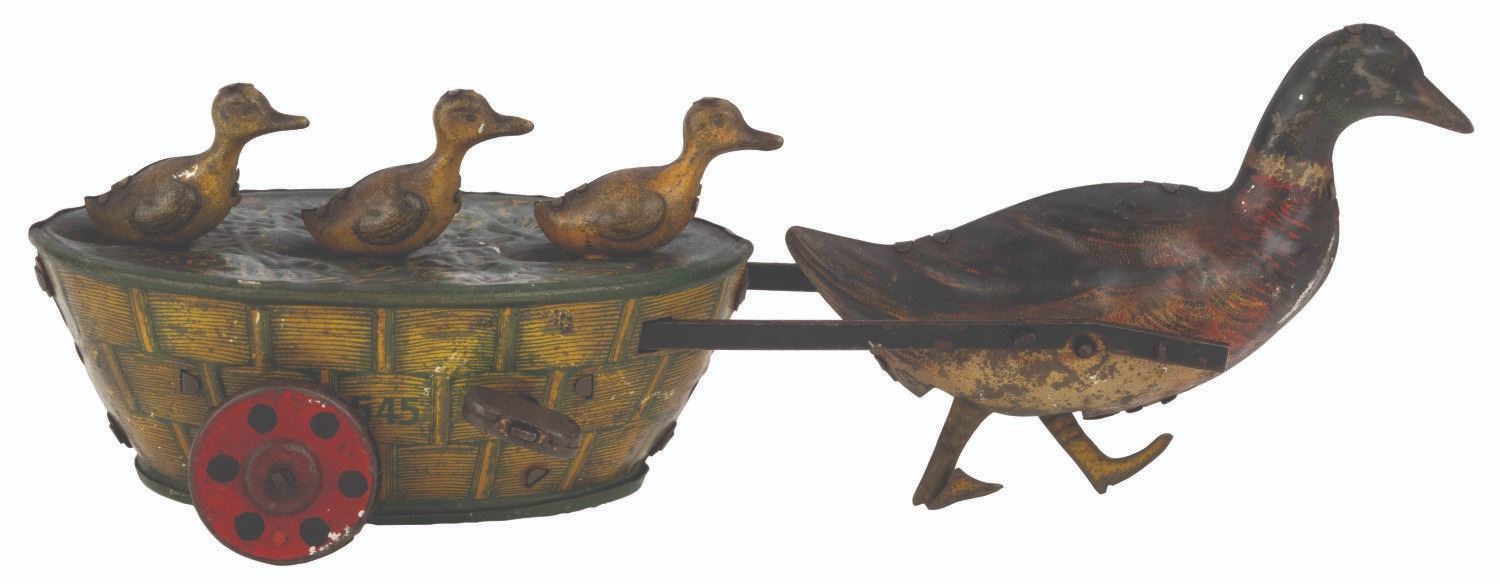 (Lehmann, 1910-35) A wind-up mother duck pulling ducklings in a cart toy with built-in key. When wound, the cart races forward as the ducklings bob forward and back. Measuring 2.5” x 7.5” x 2.5” tall, the toy is in good working condition, with wear typical of age, small scratches, and general darkening of the painted colors.
