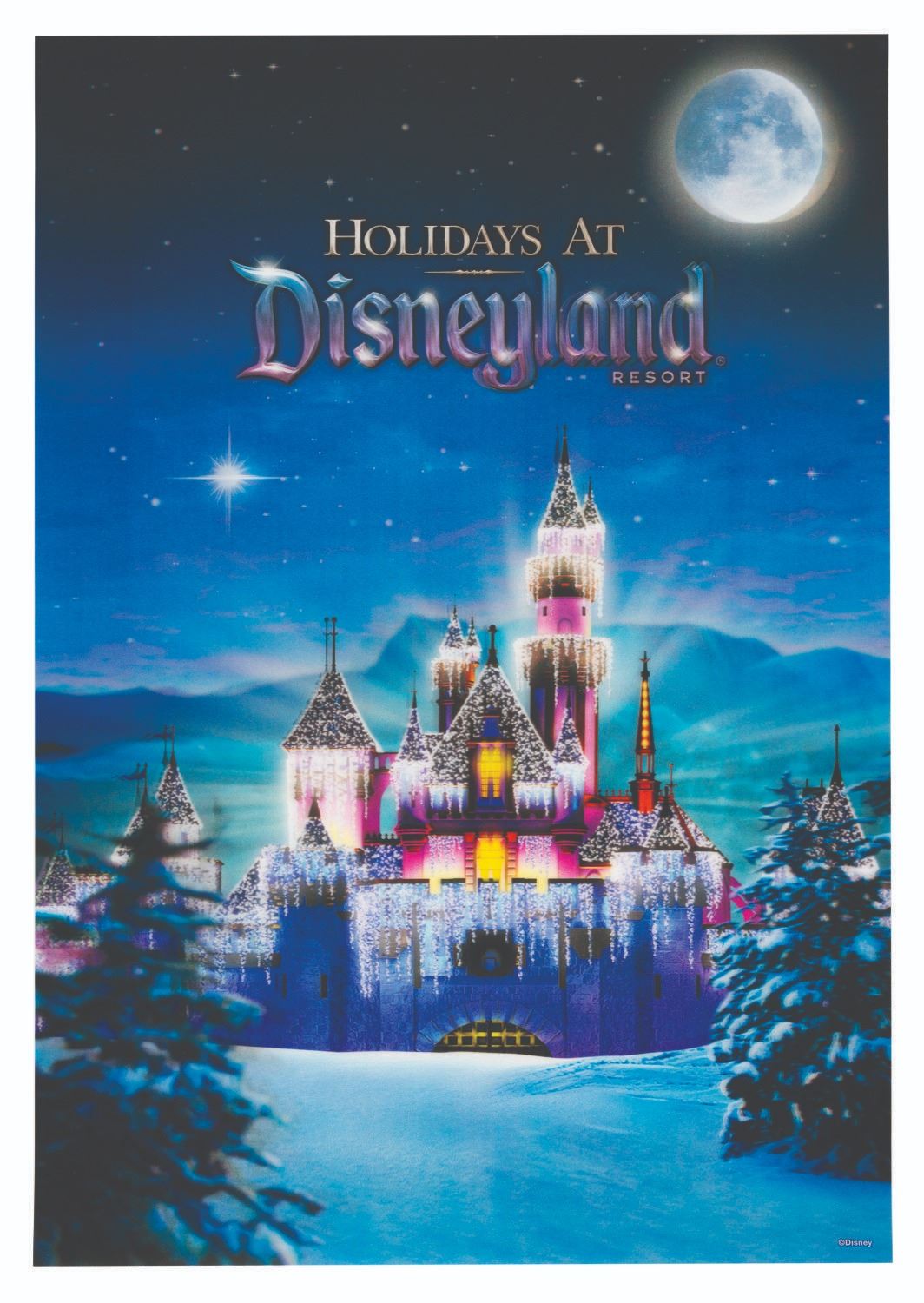 (Disneyland, 2010) A Holidays at Disneyland lenticular poster featuring a festive Sleeping Beauty Castle decked in icicle lights. Measuring 18.5” x 26.5”, the poster is in fine condition with minimal wear from use.