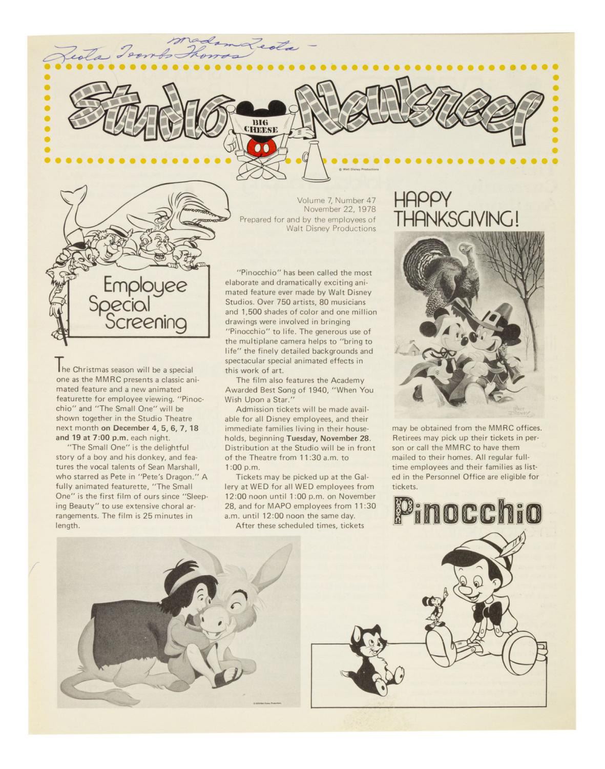 (Disney, 1978) A 1978 "Studio Newsreel" newsletter signed by Leota Toombs Thomas, the Imagineer who was filmed as the face of Madame Leota. The magazine is in very good condition with little wear.