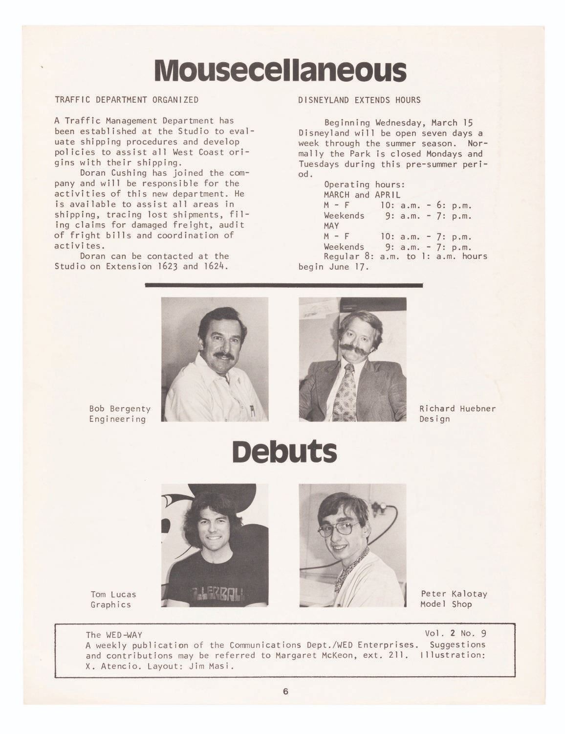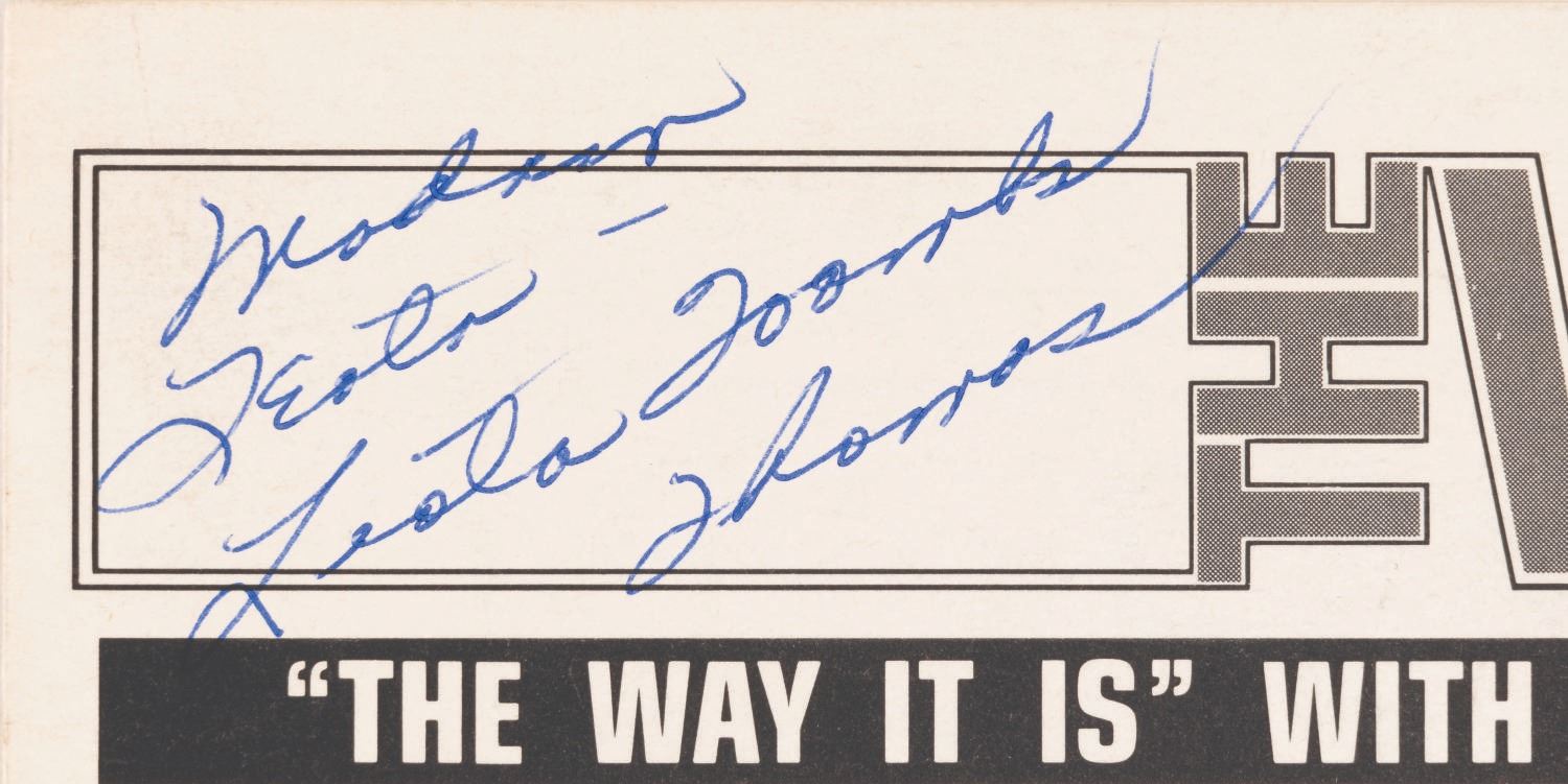 (Disney, 1978) A signed March 10, 1978 issue of The WED-Way, the bi-weekly publication by the communications department at WED Enterprises. This edition has been signed by Leota Toombs Thomas, the Imagineer and model for Madam Leota in The Haunted Mansion, and features illustrations by animator and Imagineer X. Atencio. Toombs Thomas signed “Madam Leota - Leota Toombs Thomas” in blue ink in the top left corner. Measuring 8.5” x 11”, the issue is in very good condition with light scratches, wear, and discoloration from age.