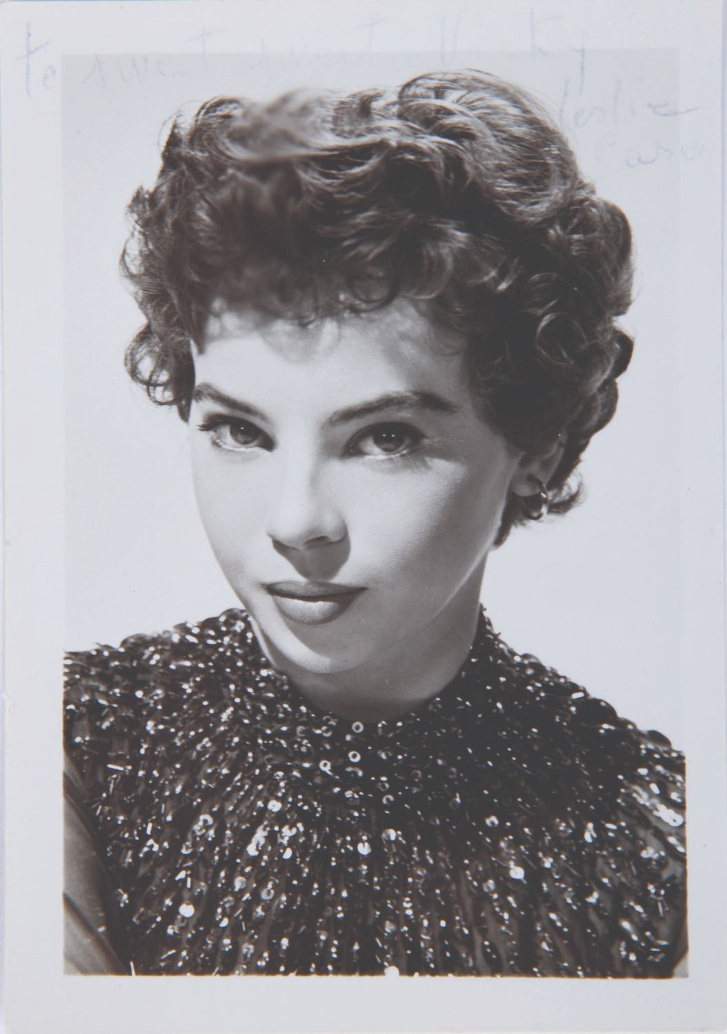(Leslie Caron, 1950s) A photo of actress and dancer Leslie Caron, signed and dedicated to Vicky Nichols, the MGM Costume and Wardrobe matron in the 1940s and 1950s. Measuring 3.5"x5", the photo is in very good condition, with the signature very faded but legible.